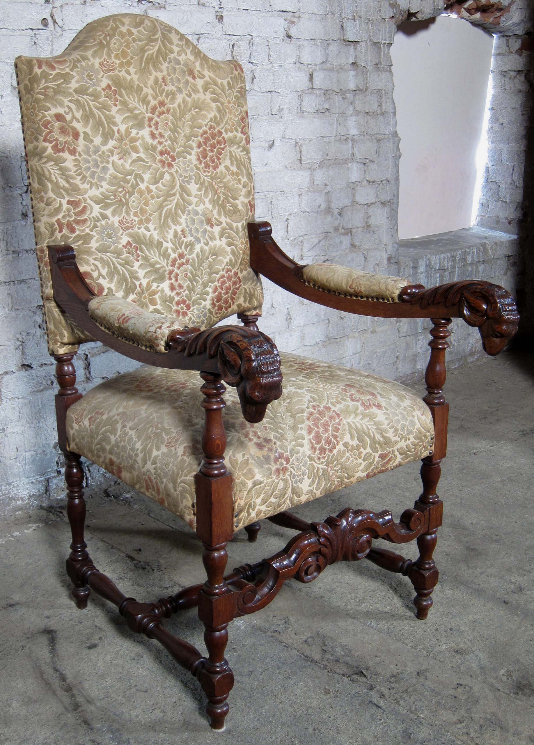 Besonders beeindruckend sind die fein geschnitzten Armlehnen mit Widderköpfen, die äußerst aufwändig gedrechselten Mittelstege und Beine. Die Polsterung ist noch recht gut erhalten. Bei einer eventuellen Erneuerung des Sitzbezuges beraten wir Sie gerne über die verschiedenen Möglichkeiten.
