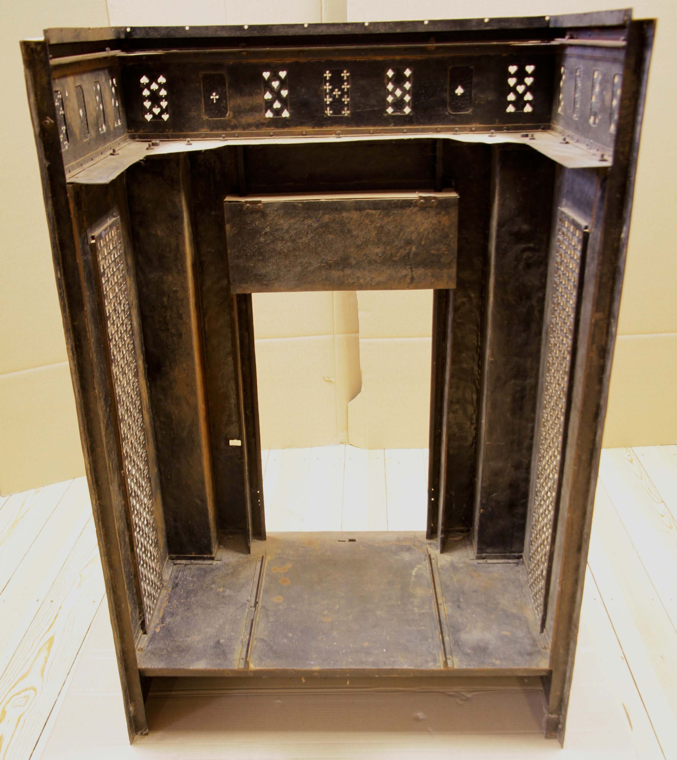 Hier bieten wir Ihnen ein ganz spezielles Exponat. Dieser ungewöhnliche Kaminvorbau stammt aus der Stilepoche des Art Deco und wurde um 1920 aus Metall gefertigt. Mit seiner besonderen Gestaltung und seinen überraschenden Details ist er ohne Zweifel eine Rarität!