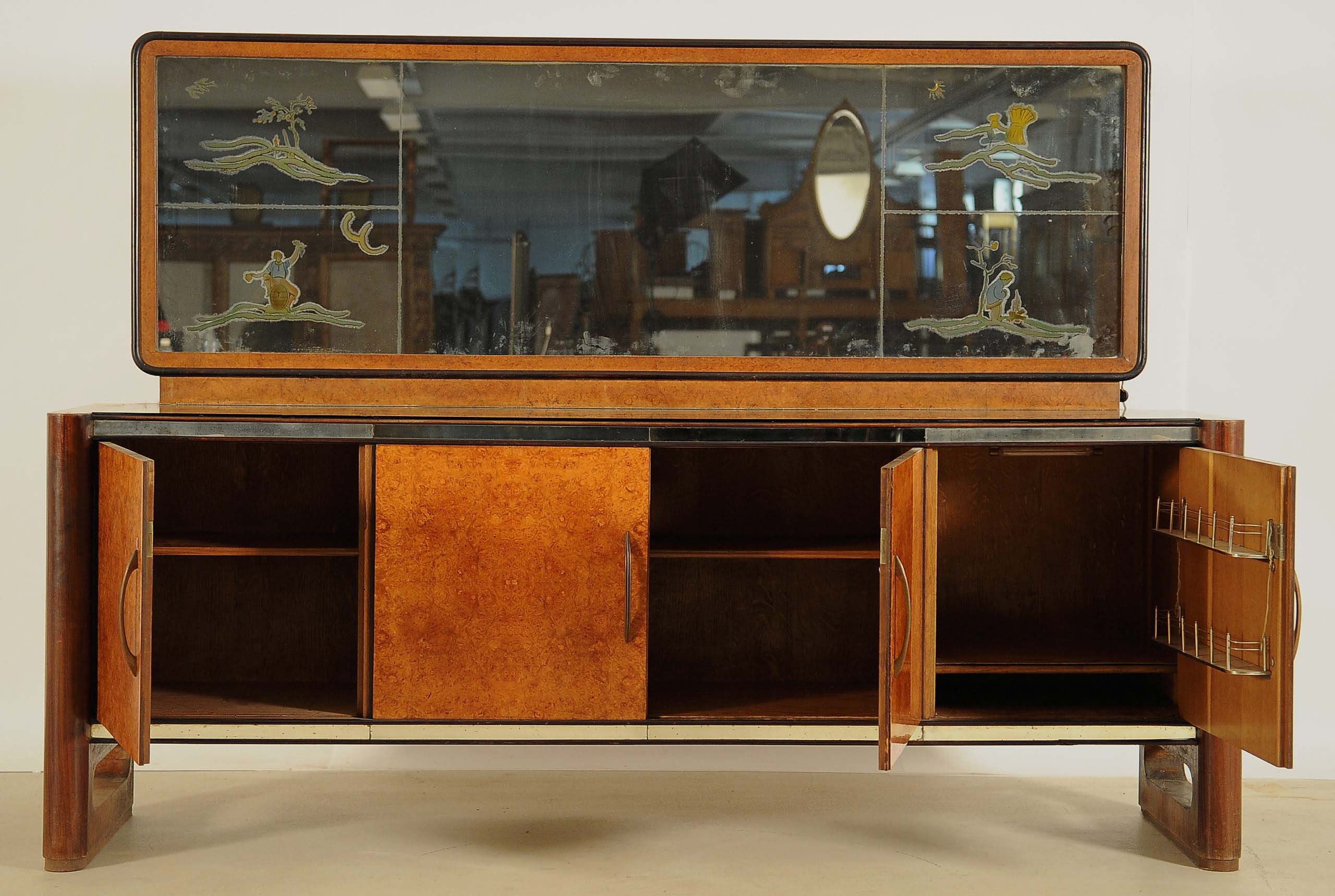 Das Sideboard mit beleuchtetem Spiegelaufsatz zeichnet sich durch ihre wundervollen Furnierflächen aus feinstem Palisander und Birkenwurzelholz aus, dessen Zusammenspiel der Maserung und warmen Farbtöne wunderbar mit der kubischen Linienführung korrespondiert. Darüber hinaus hervorzuheben sind die geätzten Verzierungen in Form landschaftlicher Motive im Spiegel, die silberfarbenen Bänderungen als Einfassung der Türen des Sideboards sowie die großflächigen Aussparungen der Beine.