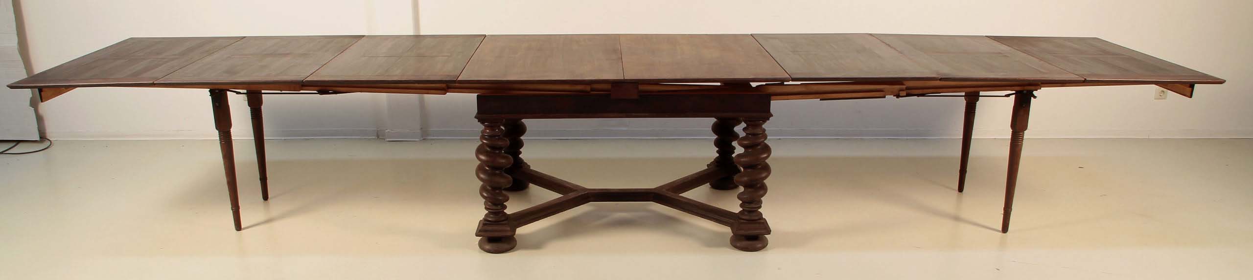 Heute bieten wir Ihnen einen sensationellen Esstisch an! Dieser kolossale Auszugstisch wurde um 1880/90 gefertigt. Holz ist Eiche, massiv und furniert. Mit diesem Tisch können Sie eine große Anzahl Gäste (mindestens 20) bequem platzieren und ihn danach wieder einfach auf ein “normales Maß” zusammenstellen!