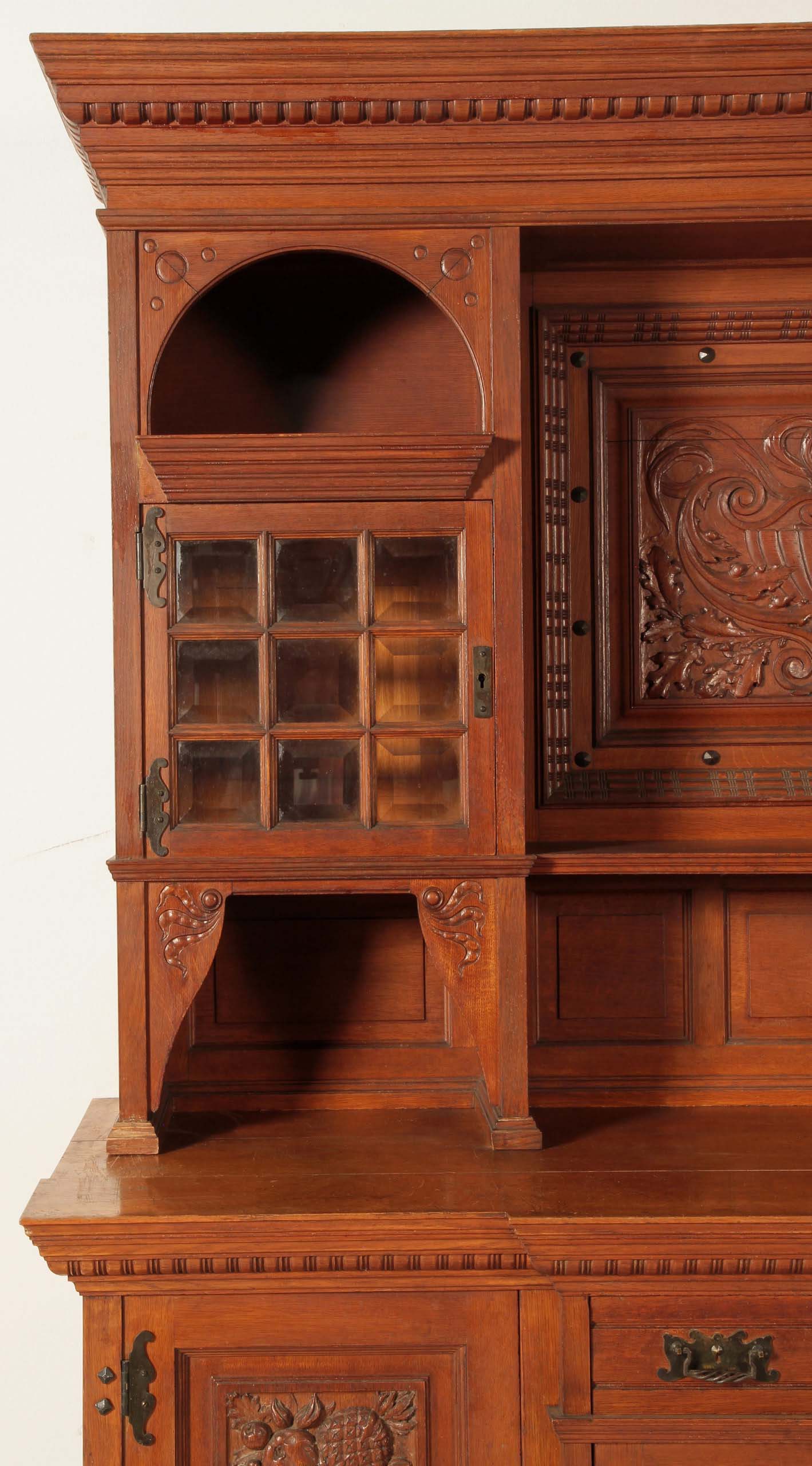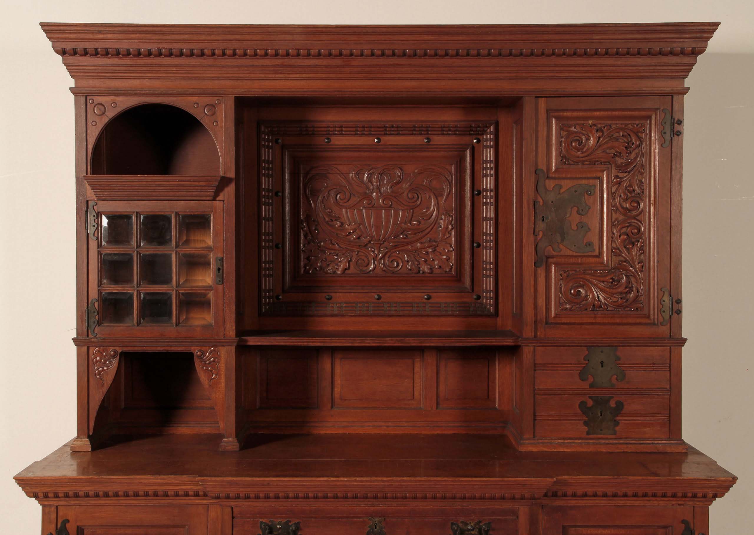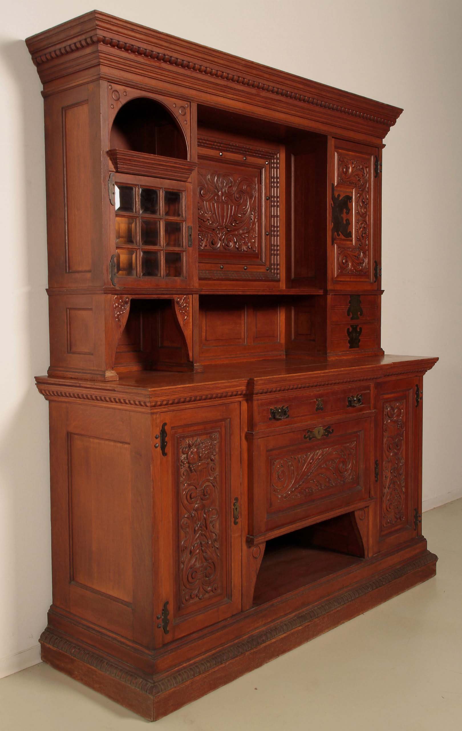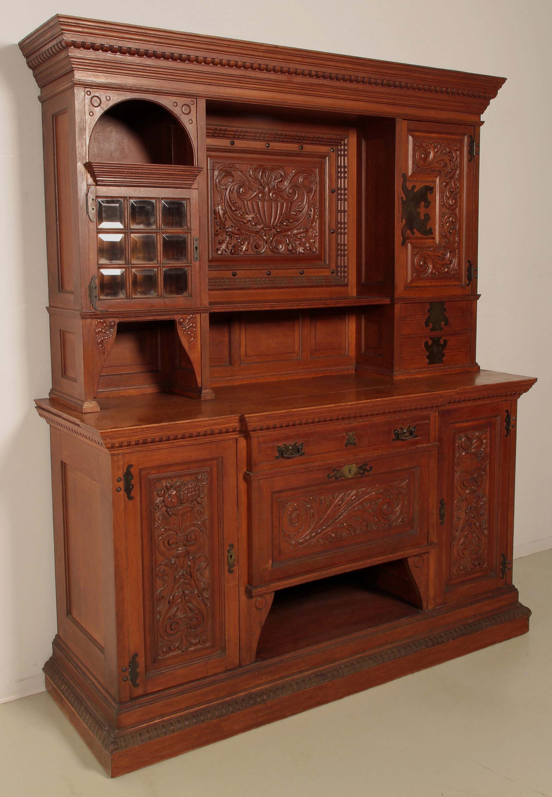 Besonders hervorzuheben sind natürlich die riesigen Messingbeschläge, die meisterlichen Schnitzereien in den aufwändigen Kassettierungen, welche unterschiedlichste Motive wie Obst, Pokale, und florale Motive darstellen. Der asymetrische Aufbau sowie das funktionell gehaltene Innenleben machen das Buffet zu etwas besonderem.