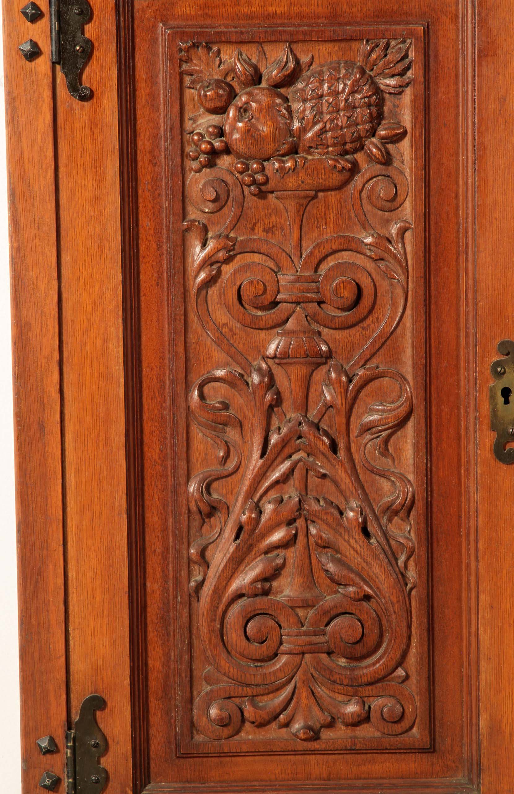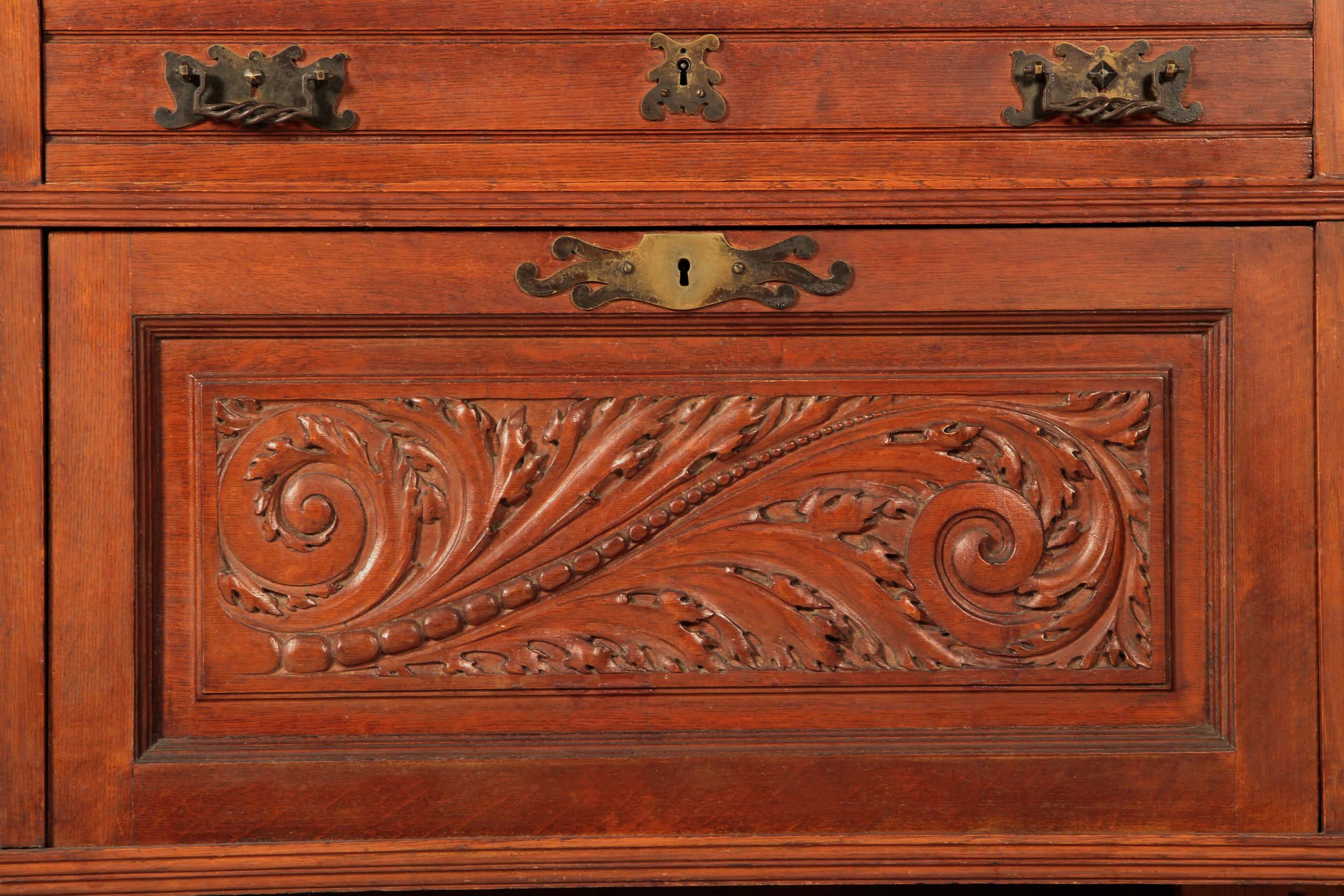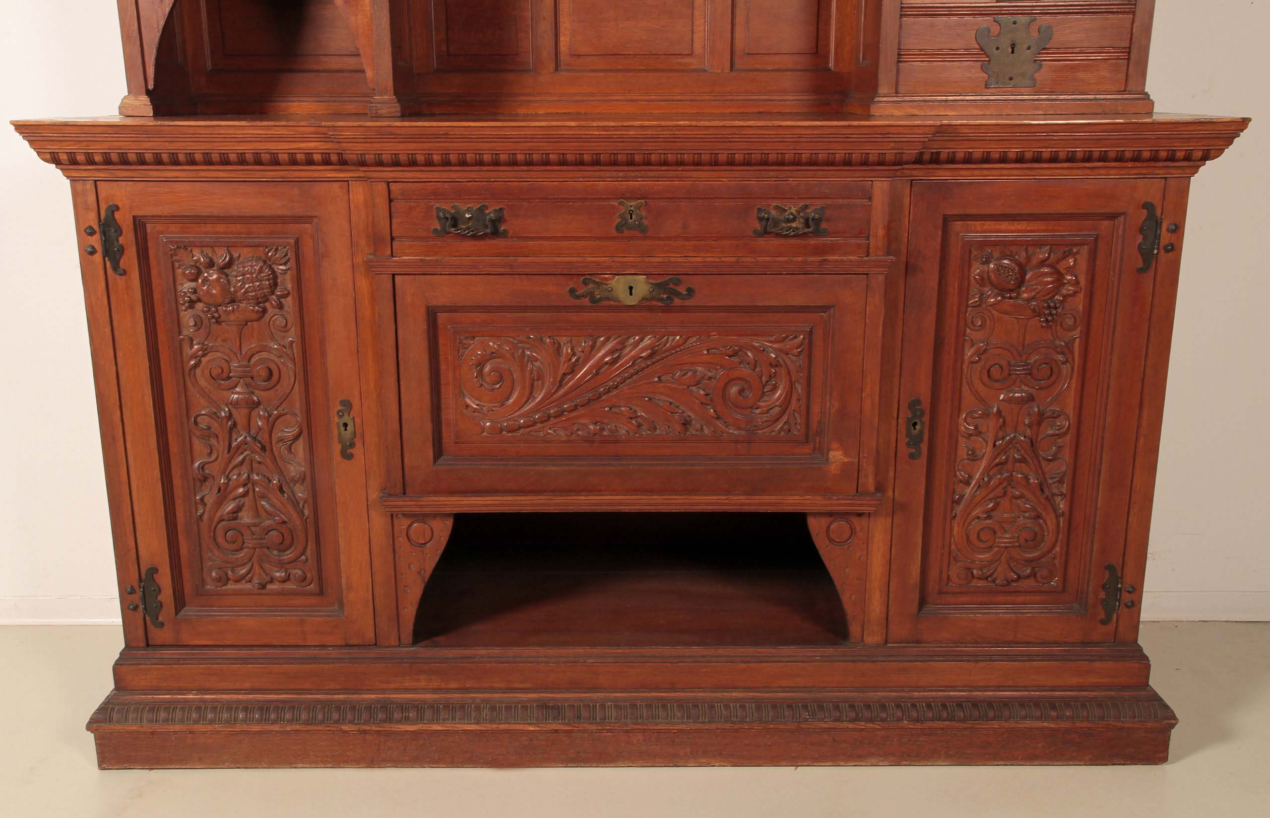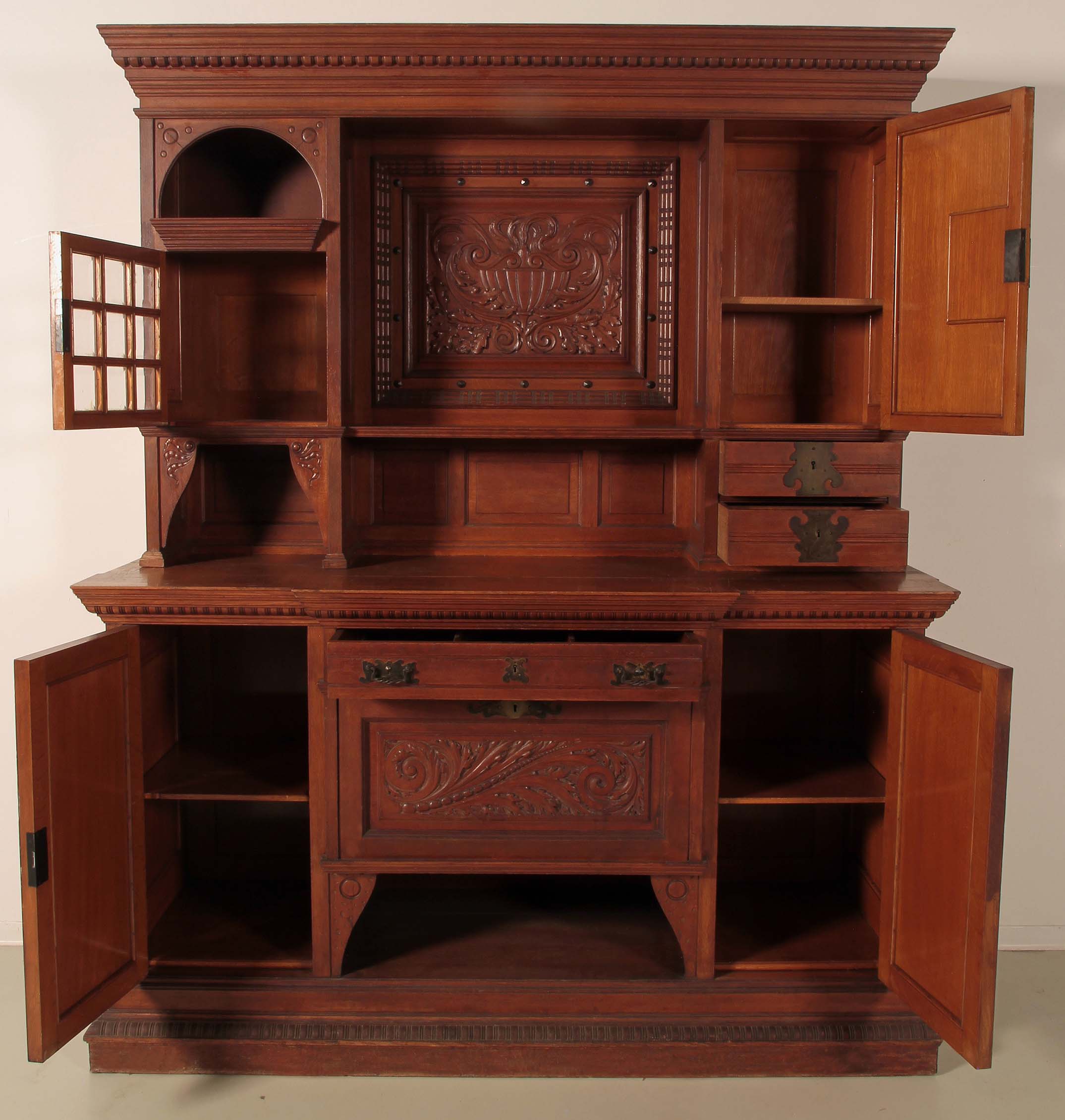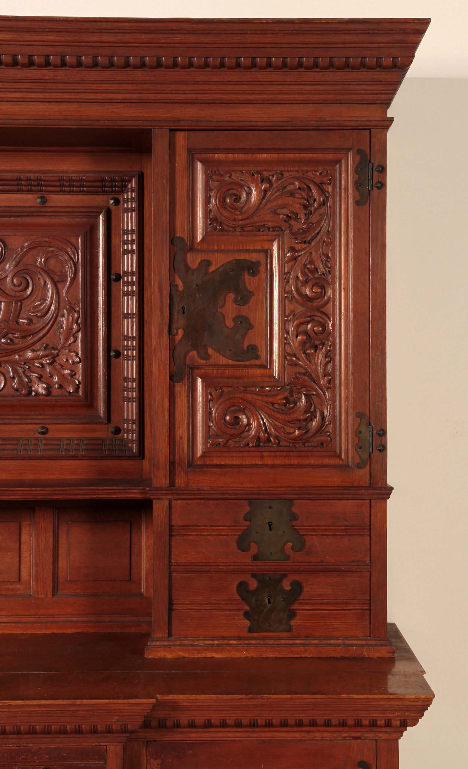 Besonders hervorzuheben sind natürlich die riesigen Messingbeschläge, die meisterlichen Schnitzereien in den aufwändigen Kassettierungen, welche unterschiedlichste Motive wie Obst, Pokale, und florale Motive darstellen. Der asymetrische Aufbau sowie das funktionell gehaltene Innenleben machen das Buffet zu etwas besonderem.