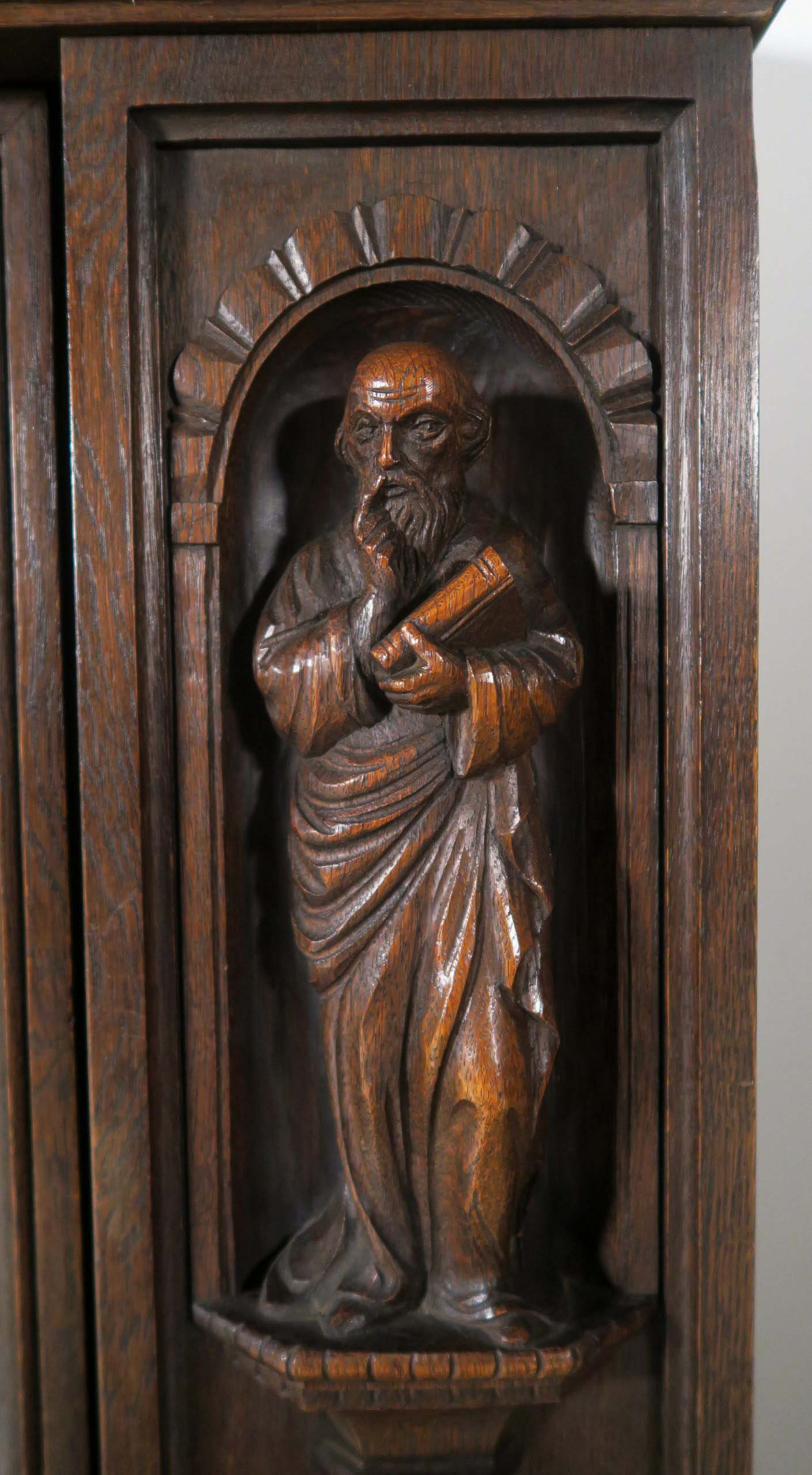 – die geschnitzte Zarge unterhalb des profilierten Daches, die mittig zwei geflügelte Drachen darstellt welche von verschlungenen Blattranken eingerahmt sind.
