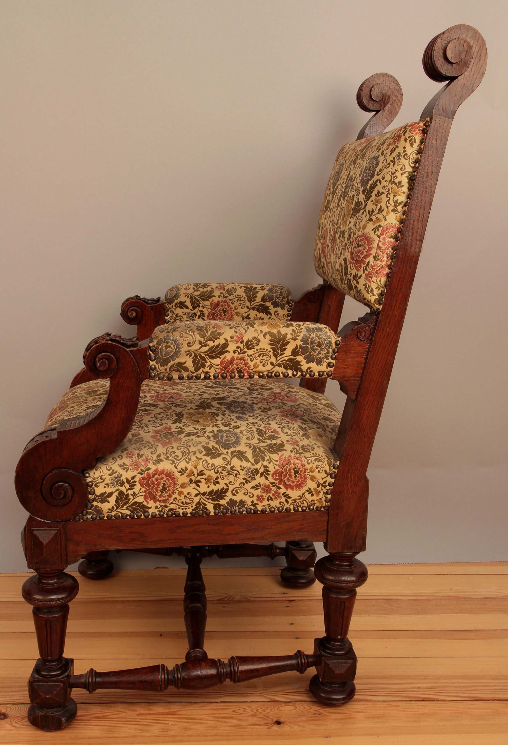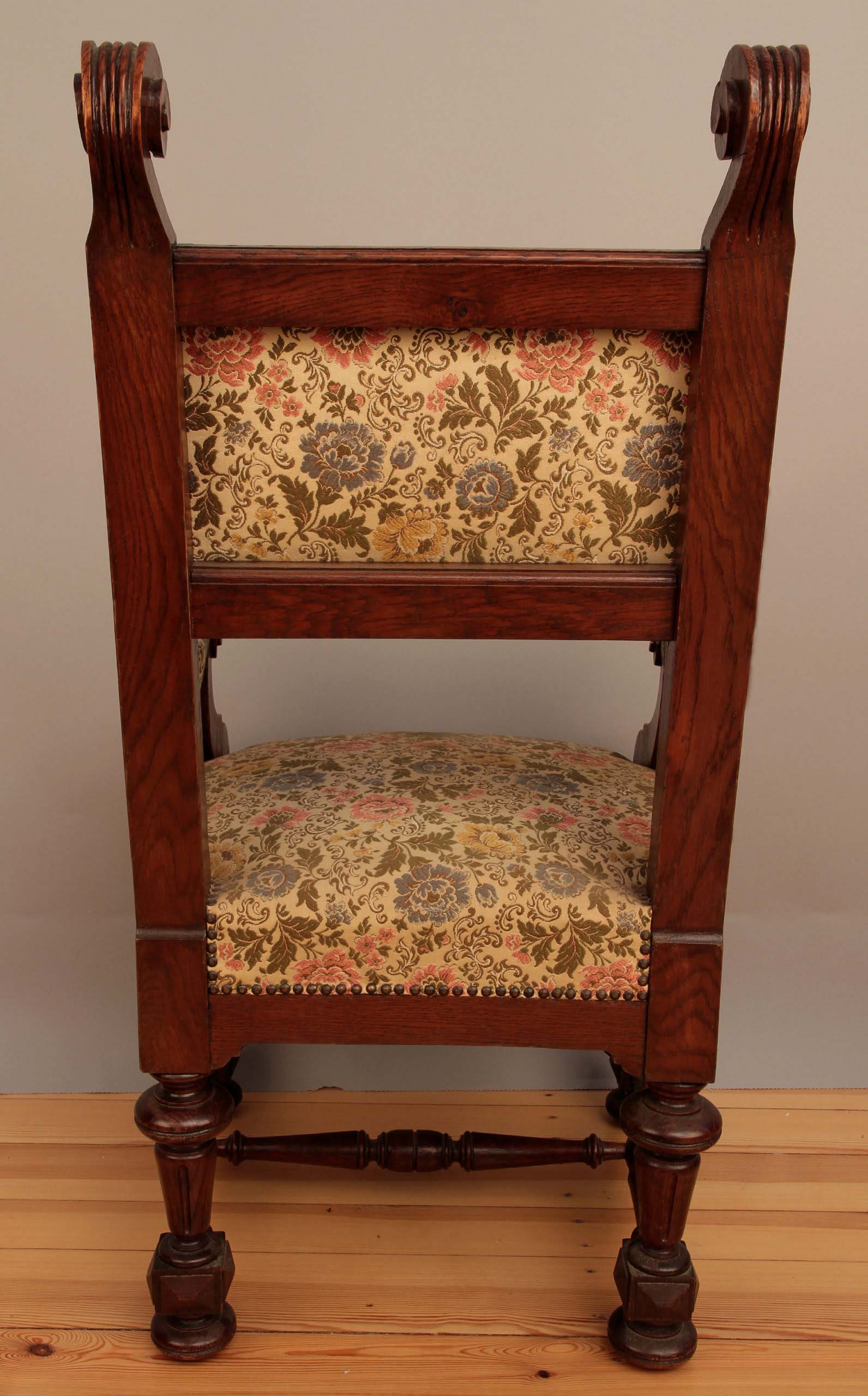 Hervorzuheben sind die toll geschneckten Knäufe der Rückenlehne, die mehrfachen Diamantierungen an der Zarge und den Säulenbeinen, die ionisierten Armlehnen mit applizierten Akanthusblättern und Schuppenfries, das aufwändig gedrechselte Fußkreuz und die hübschen Polsterbezüge mit Blütenmuster und kleinen Polsternägeln.