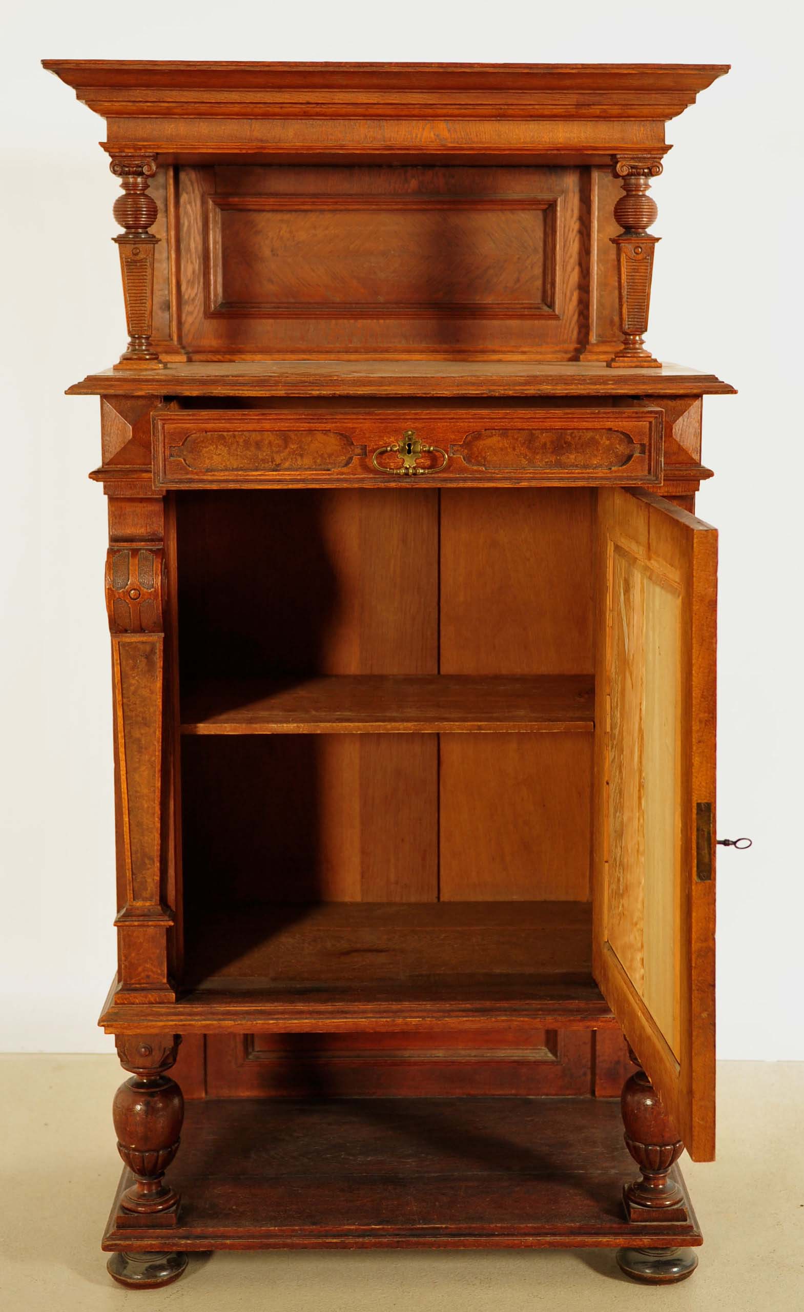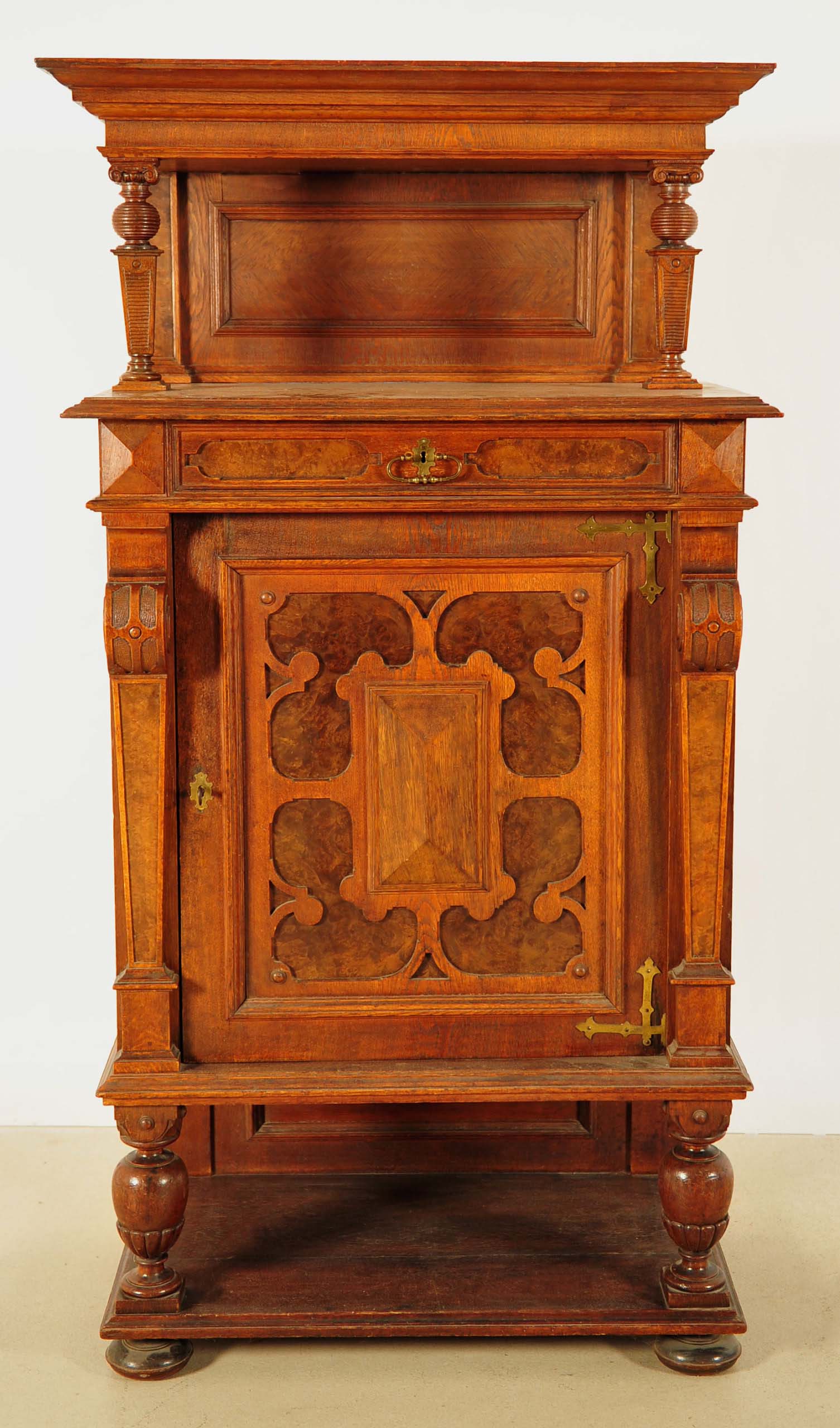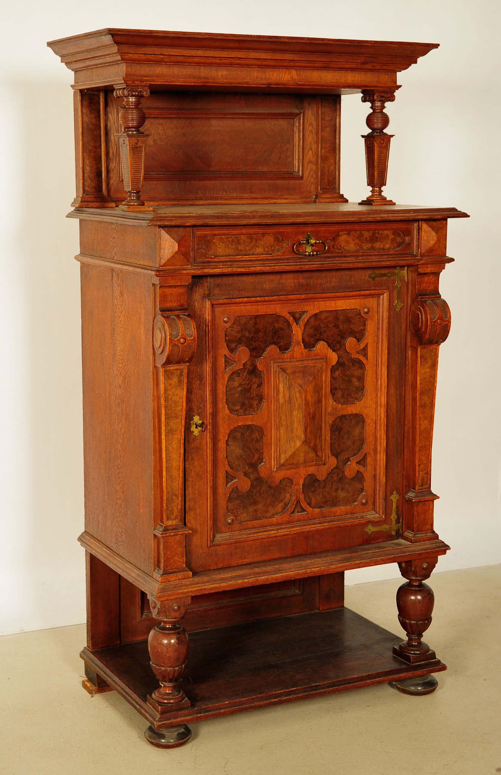 Besonders hervorzuheben sind die fein gedrechselten, kannelierten Balustersäulen vor dem offenen Oberteil, die praktische Schublade und das große Fach im Mittelteil eingerahmt von zwei konisch verlaufenden Pilastersäulen, der offene Unterbau ebenfalls eingerahmt von zwei gedrechselten Säulen sowie das kunstvolle Beschlagwerk.