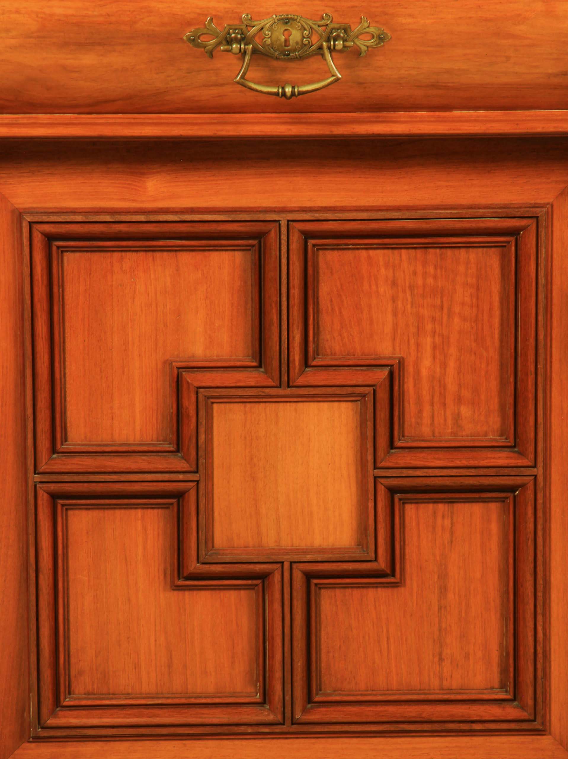 Hervorzuheben sind unter anderem die profilierte Deckplatte, die fantastischen Pilaster mit Rossettenfries, Roncaille-Ornamentik, Diamantierungen, interessante Kassettierungen der beiden Türen in schöner geometrischer Anordnung oder die gedrückten Kugelfüße. Auch das Innenleben punktet mit zwei Schüben und einem Einleger.