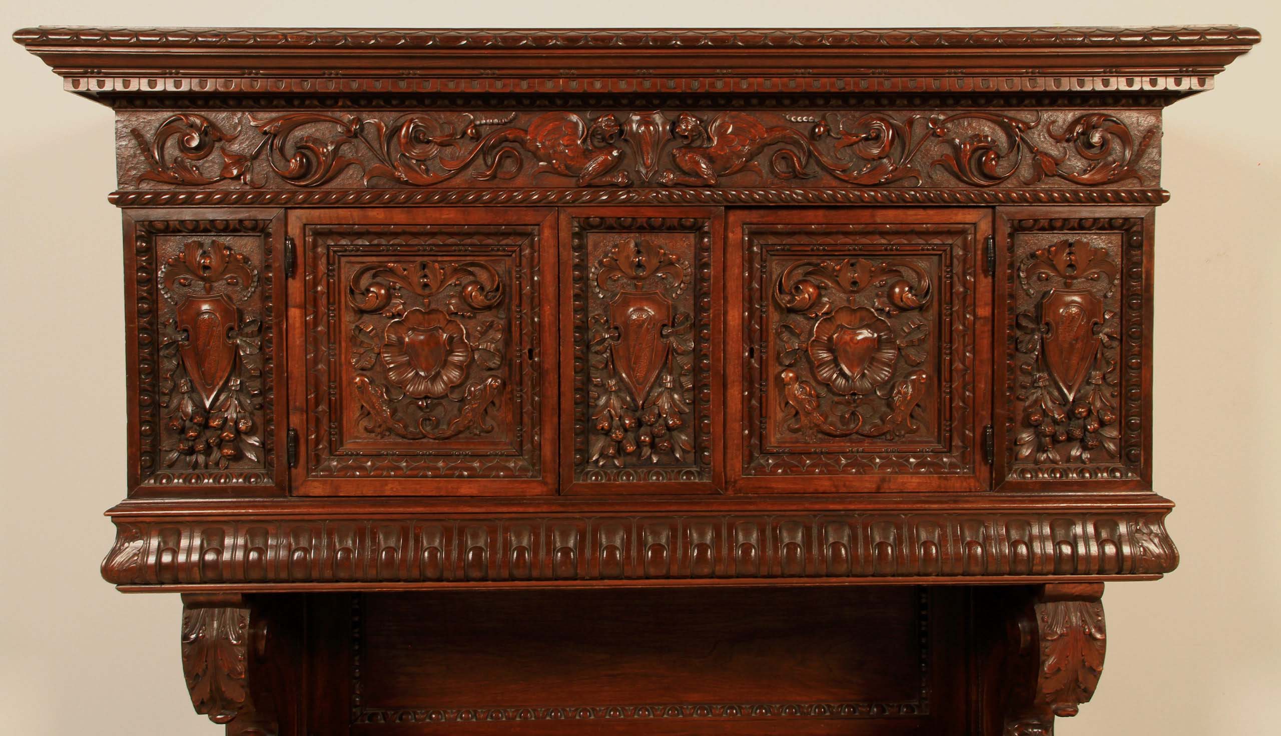 - unglaublich detailliert geschnitzter Aufbau in insgesamt 5 Kassetten mit Fresken, geflügelten Drachen, Herrschaftssymbolen wie Wappen und floraler Ornamentik in allerhöchster Qualität