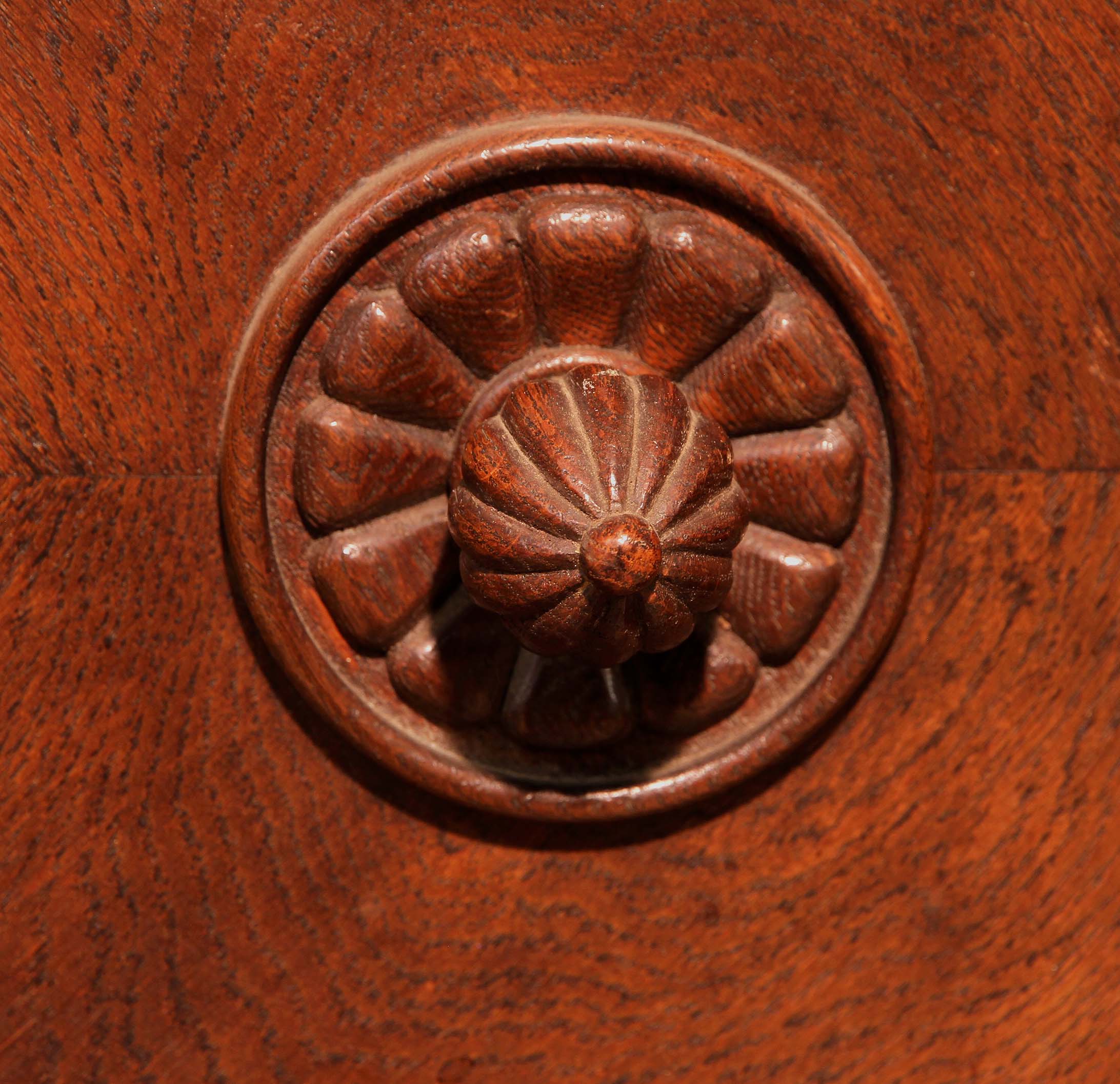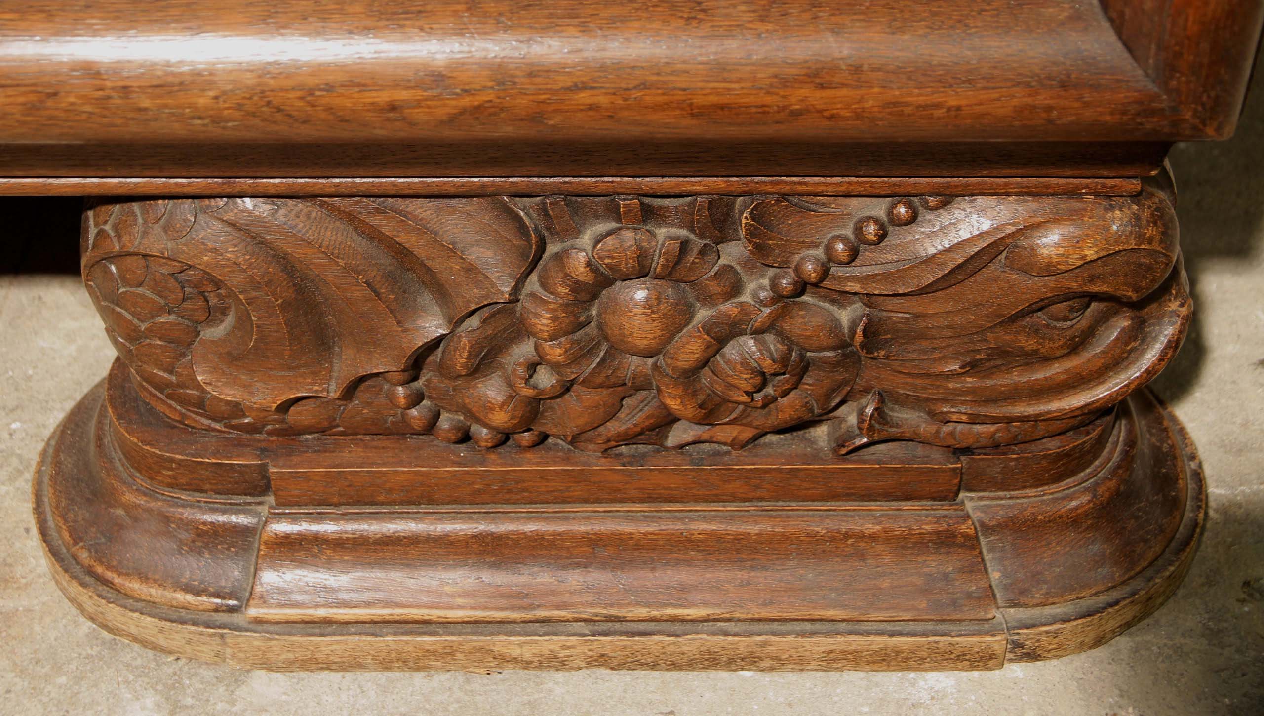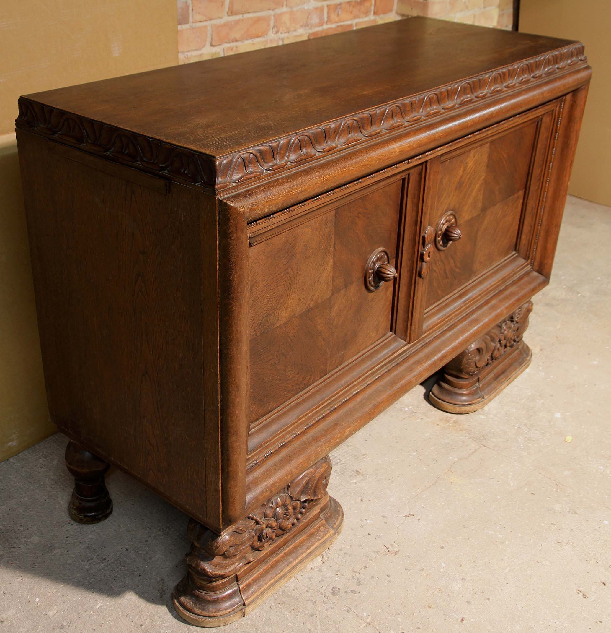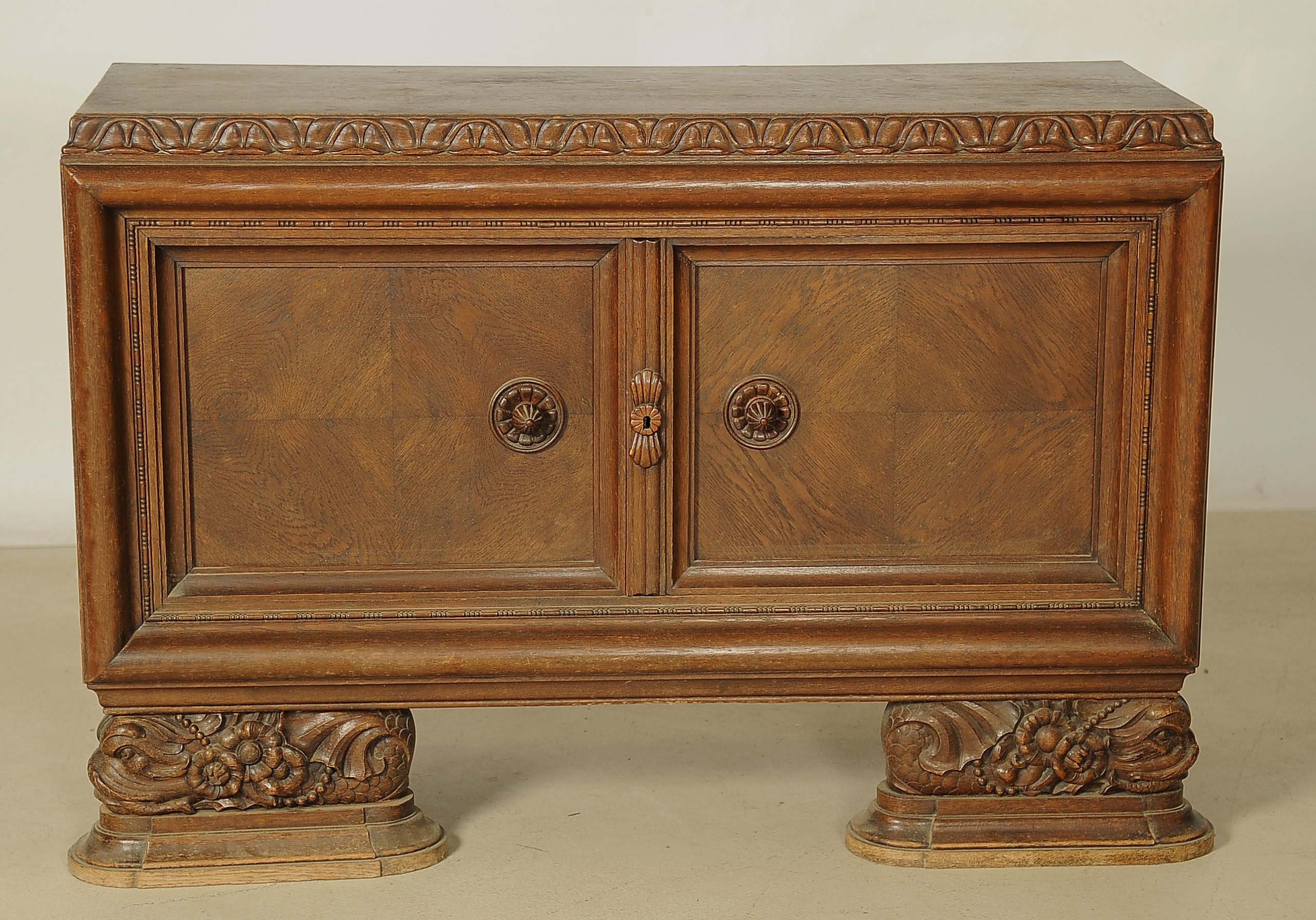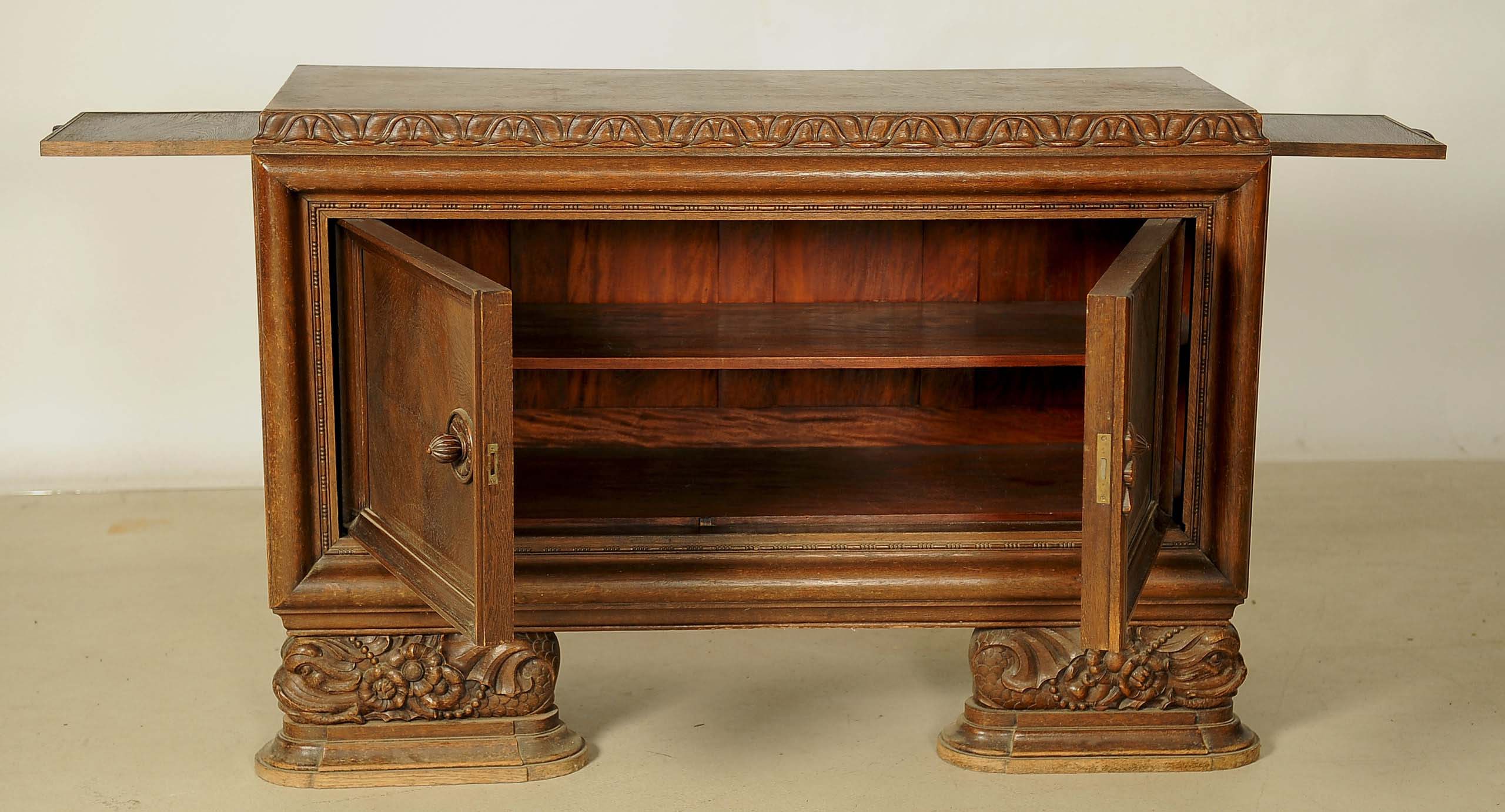 Hervorzuheben sind die aufwändig verschnitzte Zarge der Deckplatte, die mehrfach profilierten Kassettierungen der beiden Türen, das im Schachbrettmuster eingelegte Furnier mit intensiver Maserung sowie das detailliert geschnitzte Beschlagwerk. Ein weiteres Highlight bilden die fantastischen Füße der Anrichte: Sie zeigen kunstvolle, unnachahmlich von Hand geschnitzt, mittelalterliche Delfine mit floralem Beiwerk.