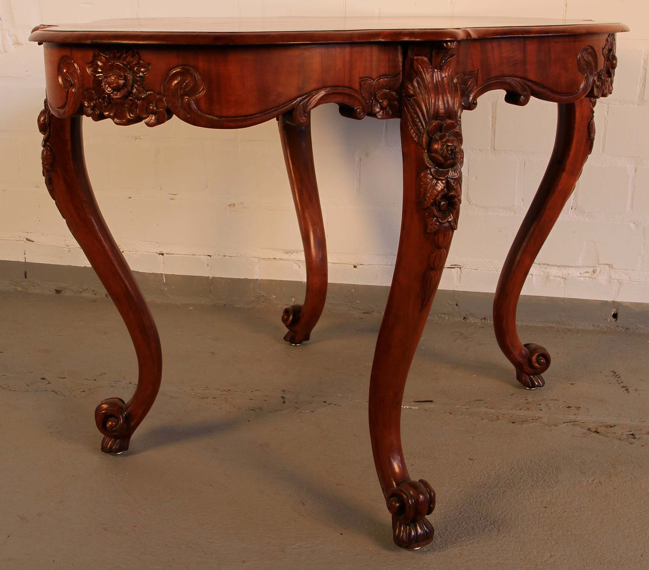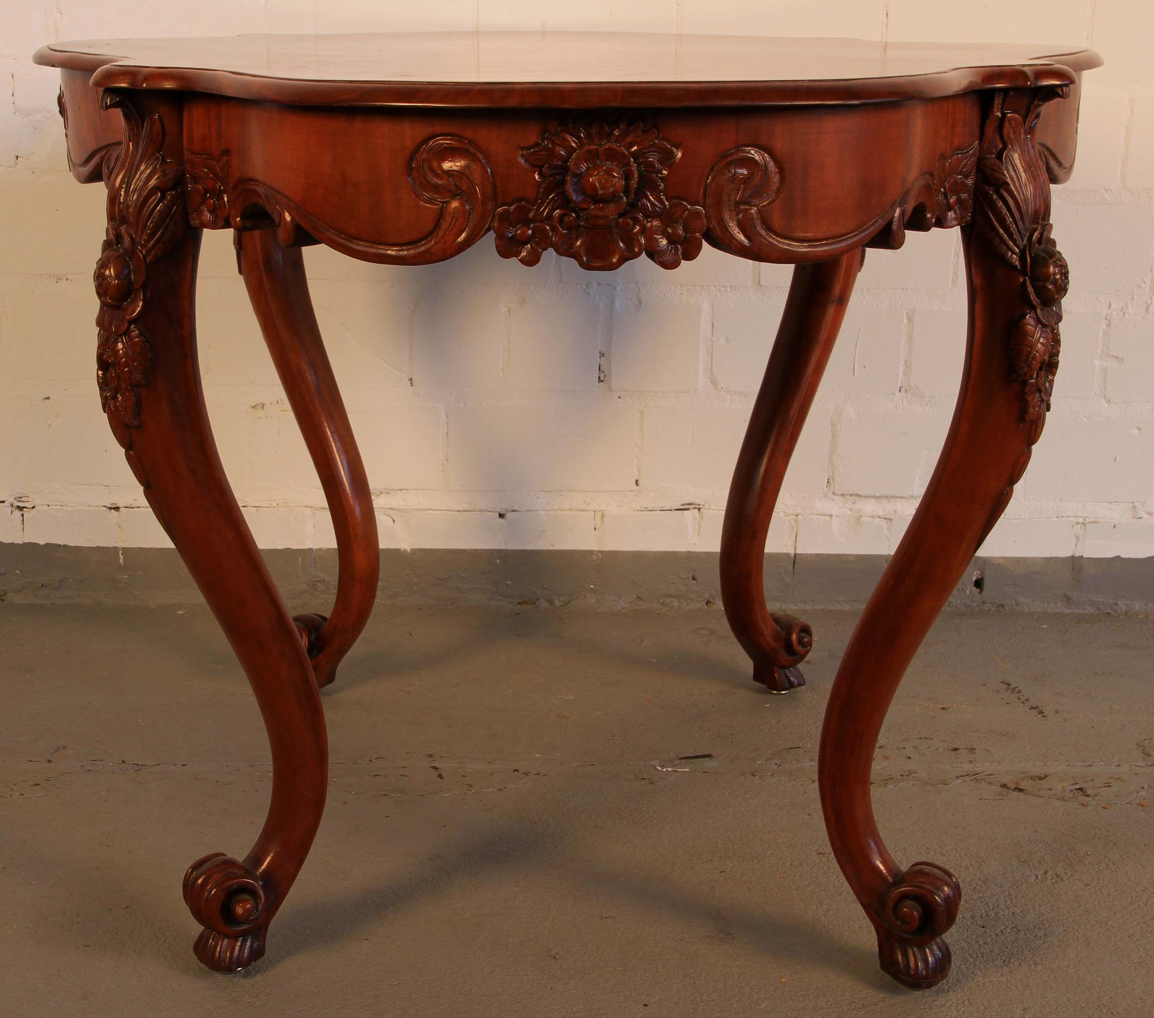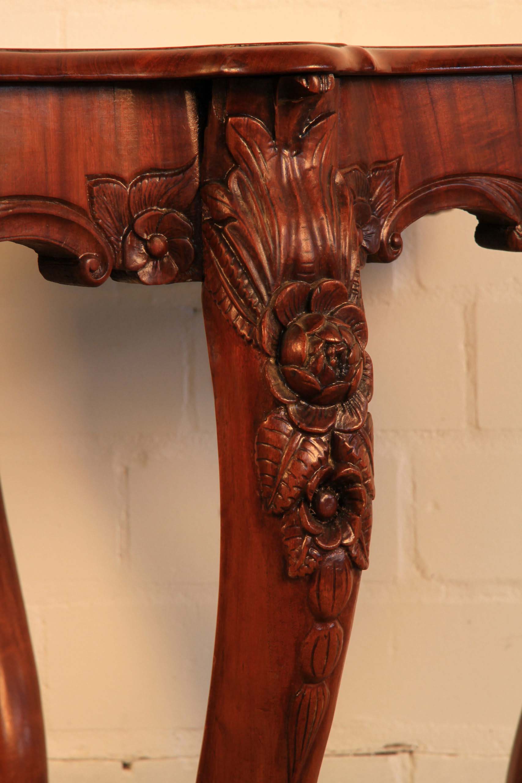 Im Einzelnen hervorzuheben sind dabei die in die Zarge an den Kopfseiten und je links und rechts neben den Beinen eingeschnitzten Blüten mit floralem Beiwerk sowie die wundervoll aus den massiven Beinen herausgearbeiteten plastischen Blüten mit großen Blätern. Weiterhin erwähnenswert ist das zauberhafte Furnierbild mit der typischen intensiven Maserung und den ins rötliche stechenden Brauntönen.