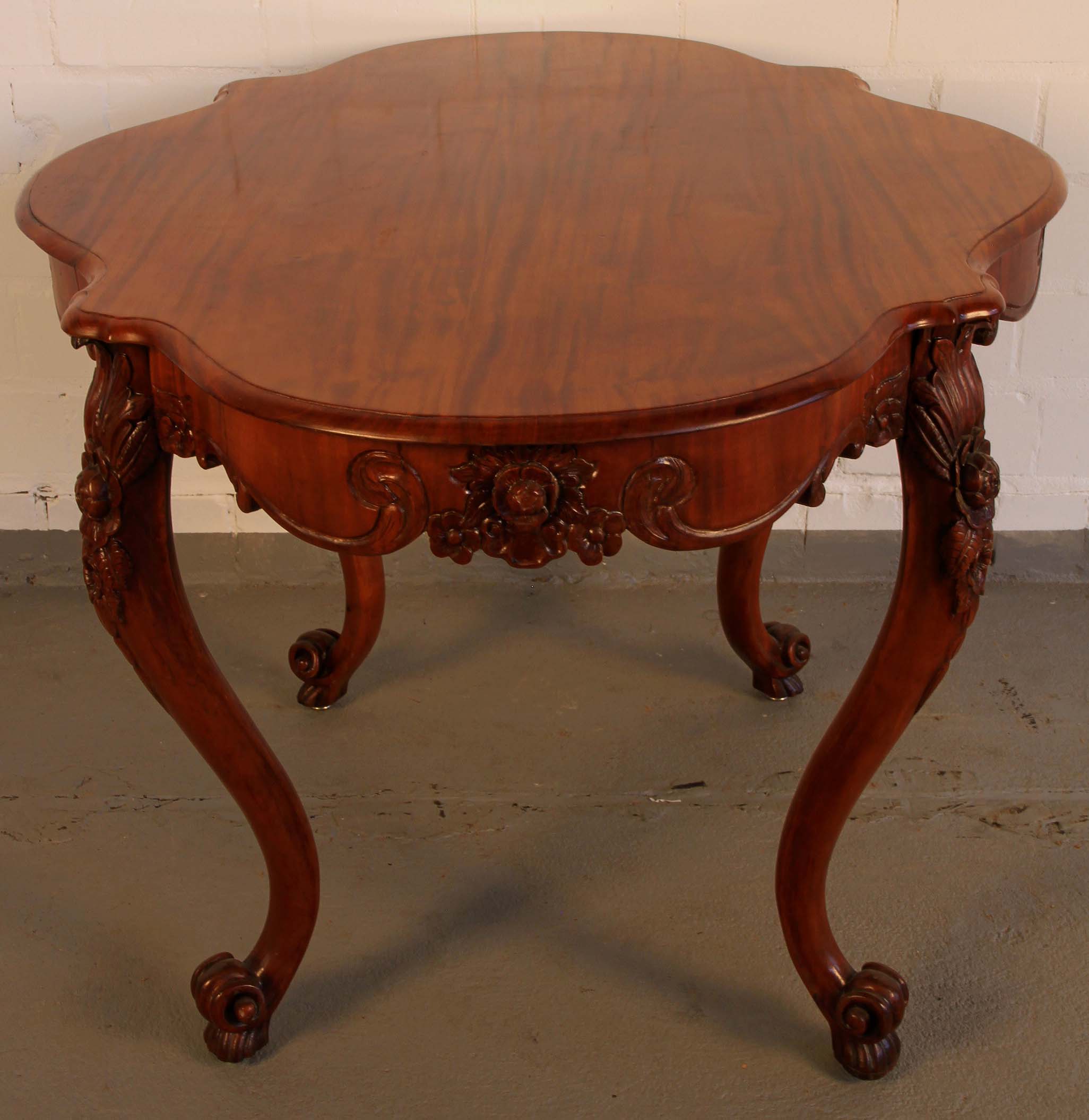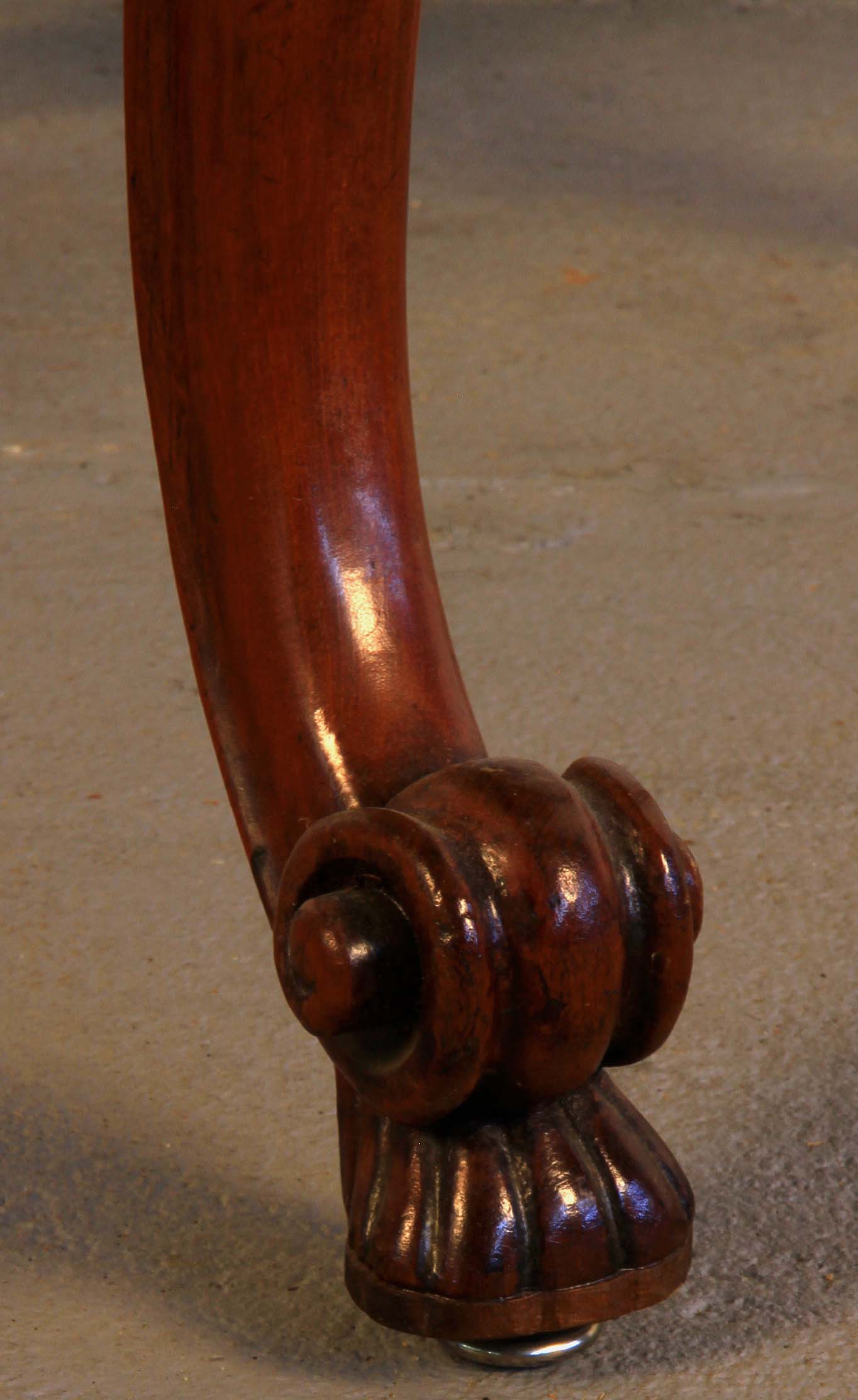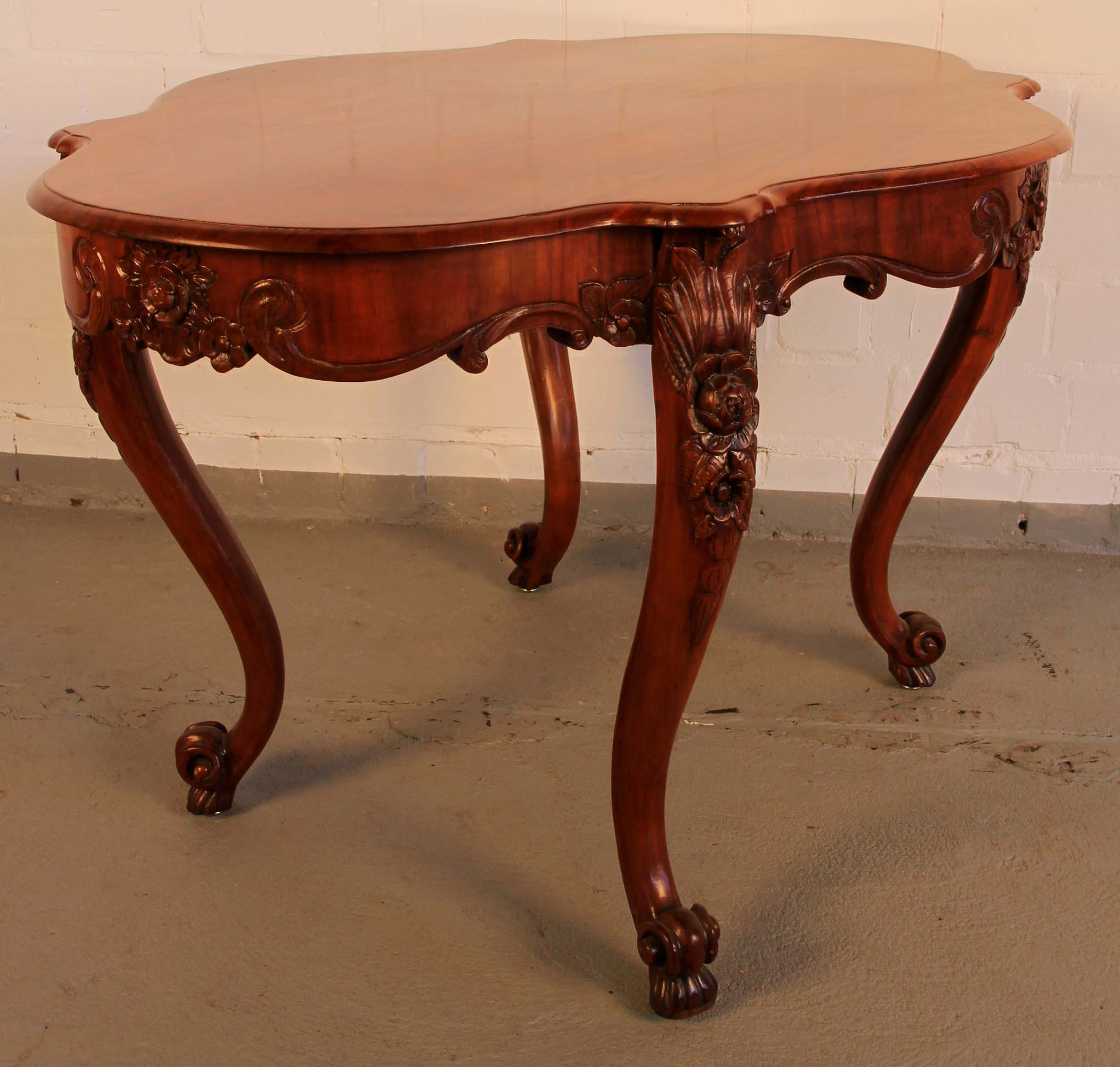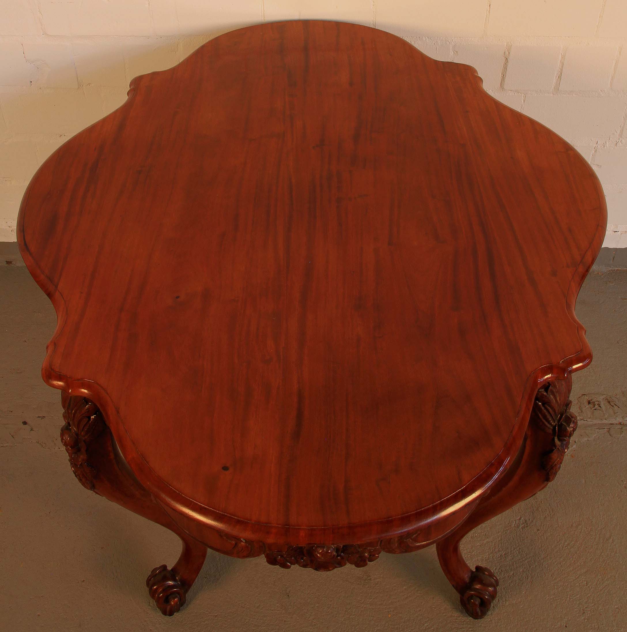 Im Einzelnen hervorzuheben sind dabei die in die Zarge an den Kopfseiten und je links und rechts neben den Beinen eingeschnitzten Blüten mit floralem Beiwerk sowie die wundervoll aus den massiven Beinen herausgearbeiteten plastischen Blüten mit großen Blätern. Weiterhin erwähnenswert ist das zauberhafte Furnierbild mit der typischen intensiven Maserung und den ins rötliche stechenden Brauntönen.