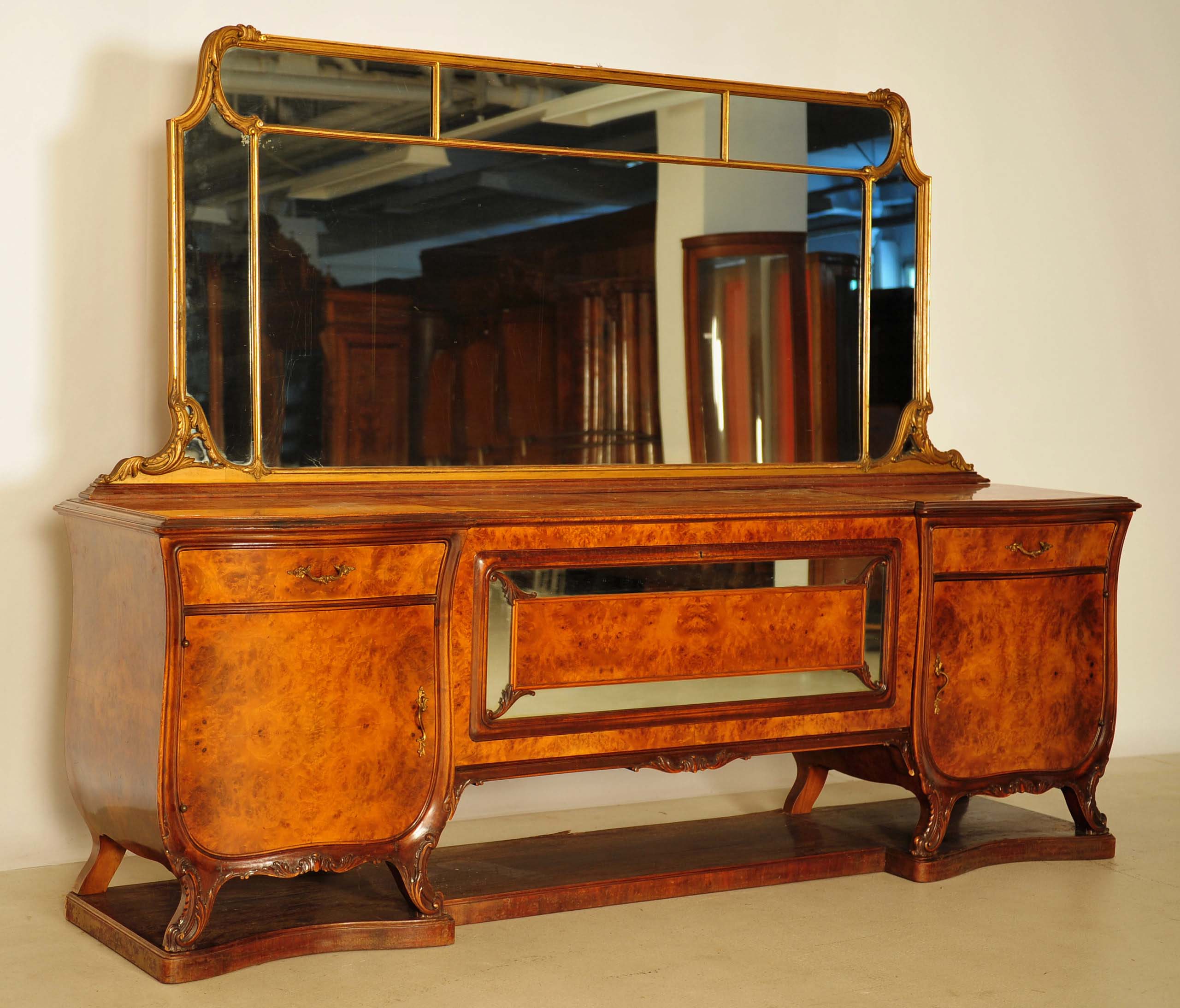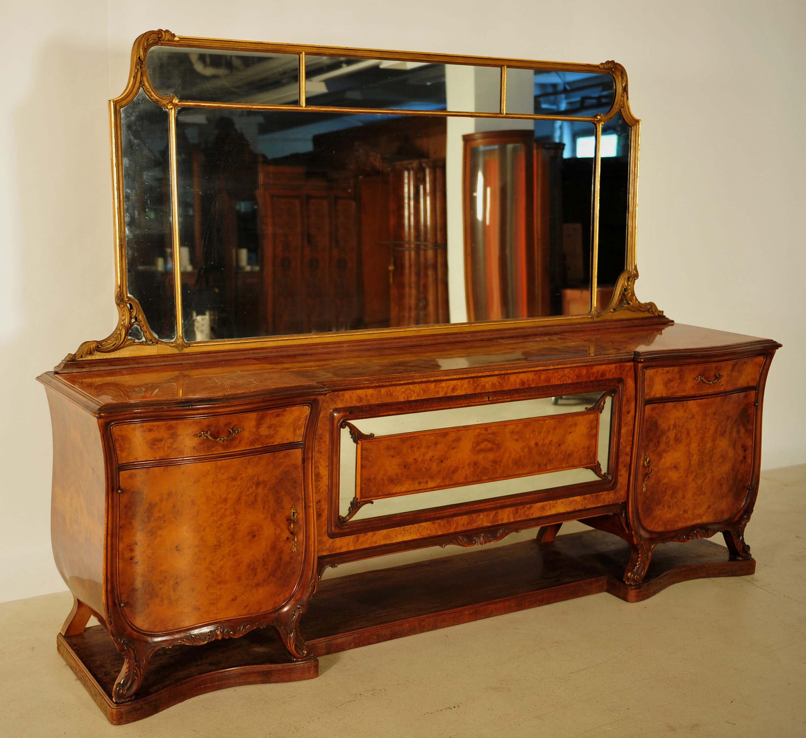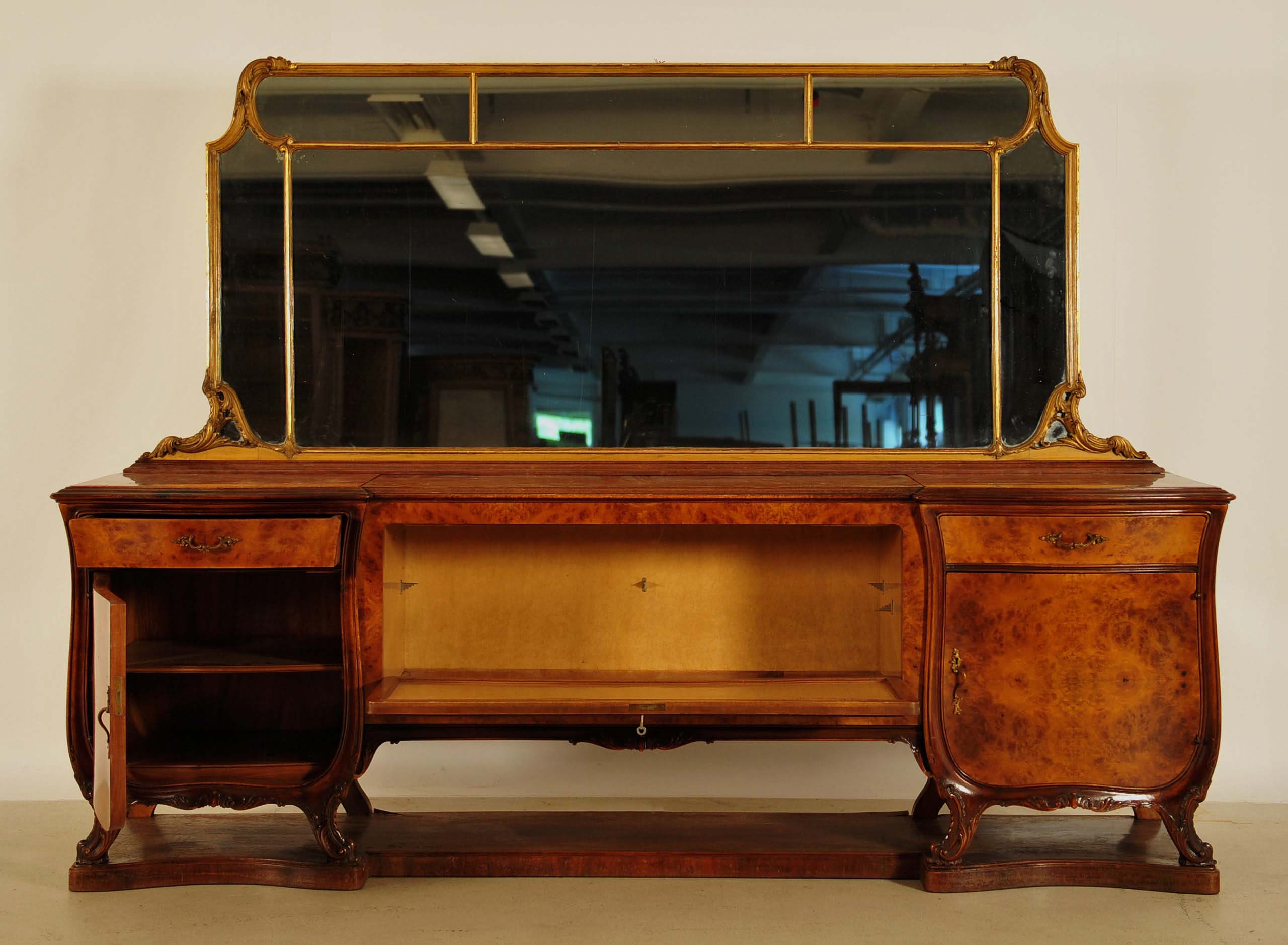 Besonders hervorzuheben sind die glänzend polierten Flächen in leicht schwungvoller Geometrie, der kunstvolle, riesige Spiegelaufsatz mit vergoldetem und schön geschnitztem Rahmen, das extravagante Mittelstück mit eingesetztem Spiegel, das hochwertig gegenfurnierte Innenleben mit zwei Schubläden, Einlegeböden und mittiger Klappe, die originalen Beschläge sowie die detailliert geschnitzten Füße. Beachten Sie bitte auch die zu diesem Büffet gehörende kleinere Anrichte im letzten Bild, die wir für Sie in einer anderen Auktion anbieten.