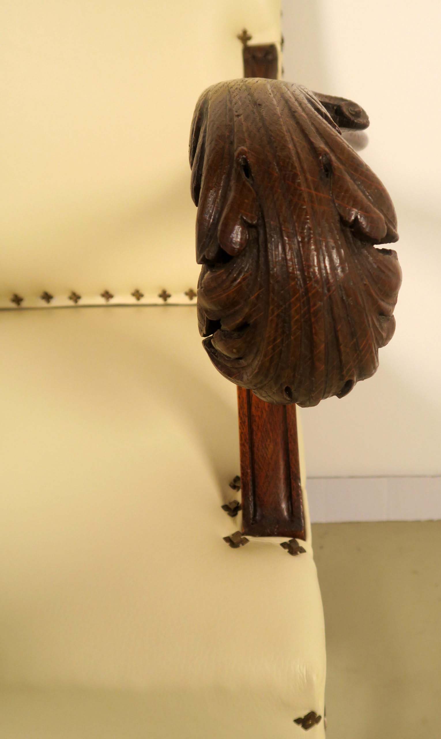 Besonders hervorzuheben sind die mit fein herausgeschnitzten Blattwerk verzierten geschneckten Armlehnen, die schöne Zarge unterhalb der Sitzfläche sowie die grandiosen Tatzenfüße mit floralen Motiven.