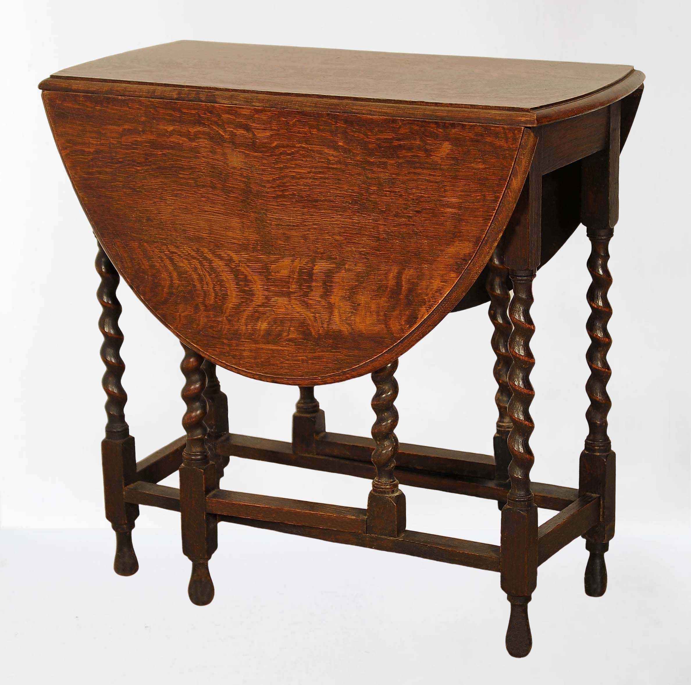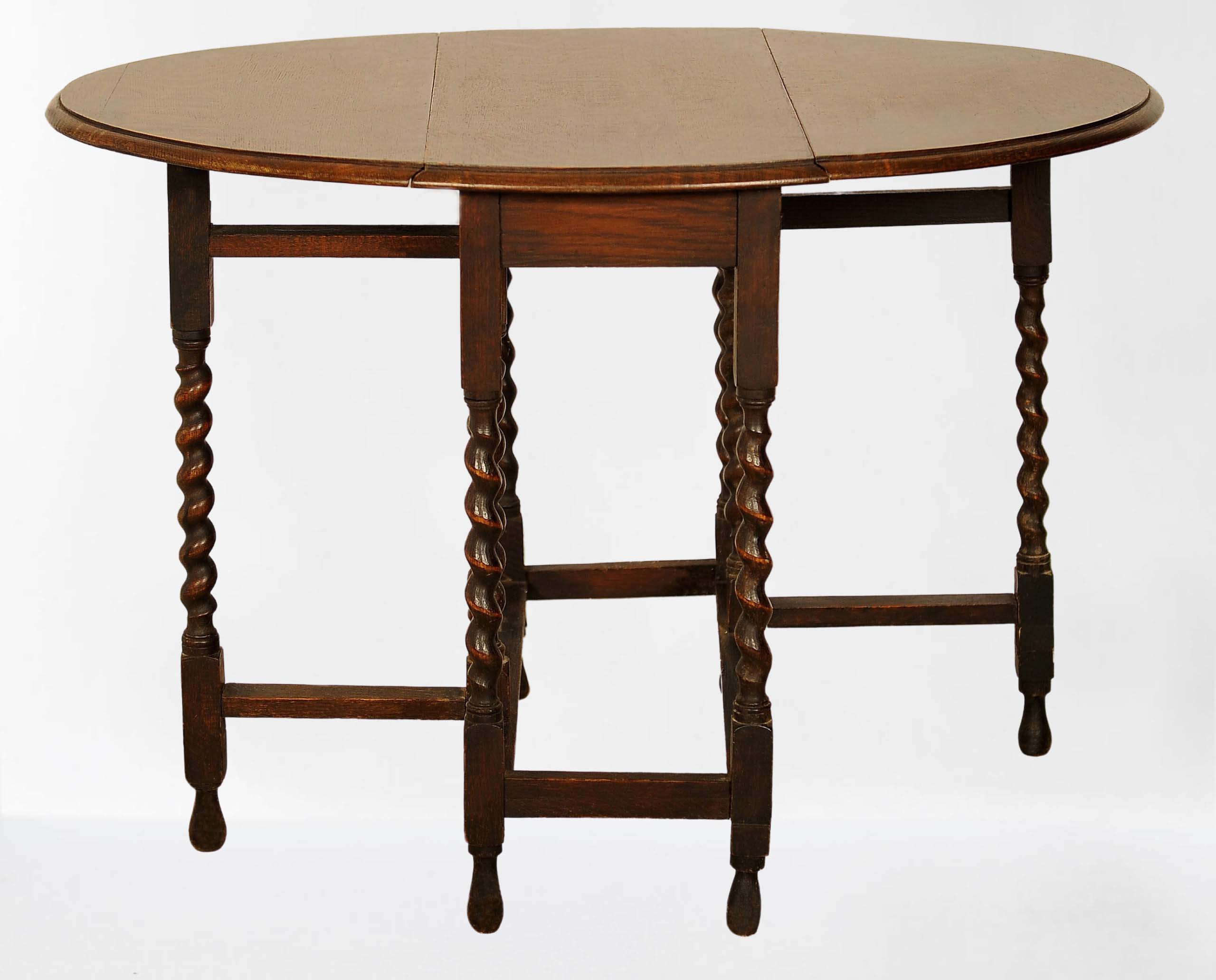 Bei diesem originalen Gateleg Klapptisch können jeweils die spitzen Enden der runden Deckplatte nach unten geklappt werden und die beiden stützenden Beine zum inneren Fußkreuz gedreht werden. Die Beine aus massiven Zopfsäulen sind dabei ein weiterer Blickfang.