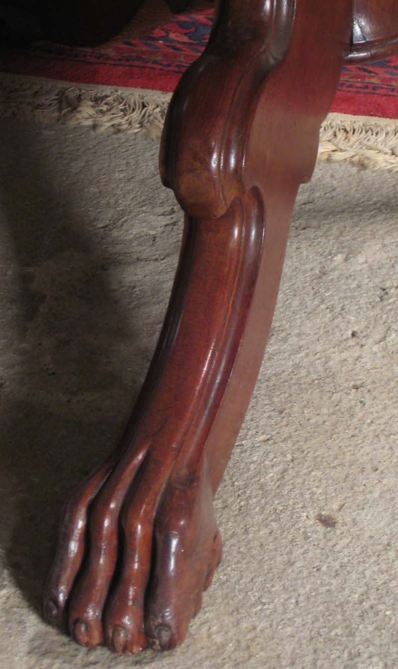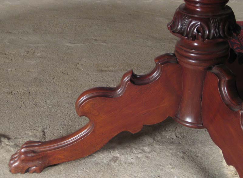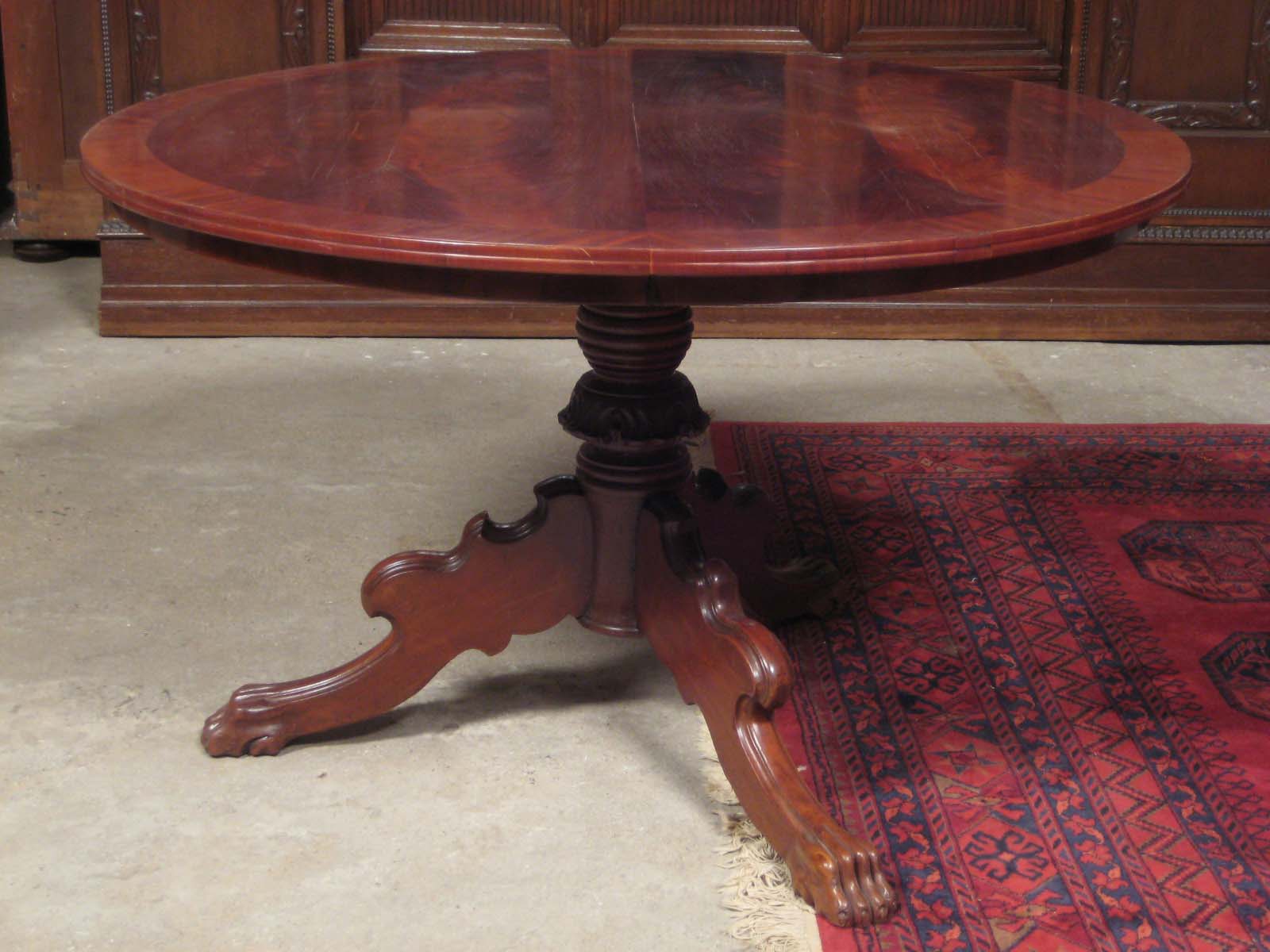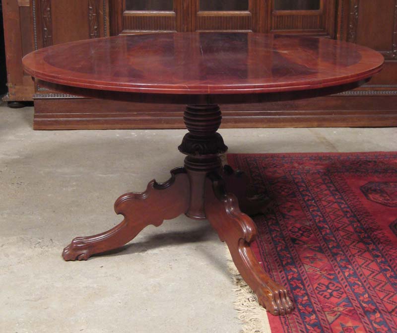 Zu seinen besonderen Merkmalen gehört die schön intarsierte Deckplatte mit markantem Furnierbild, das aufwändig gedrechselte Tischbein sowie die drei fantastischen Tatzenfüße mit Profilierungen