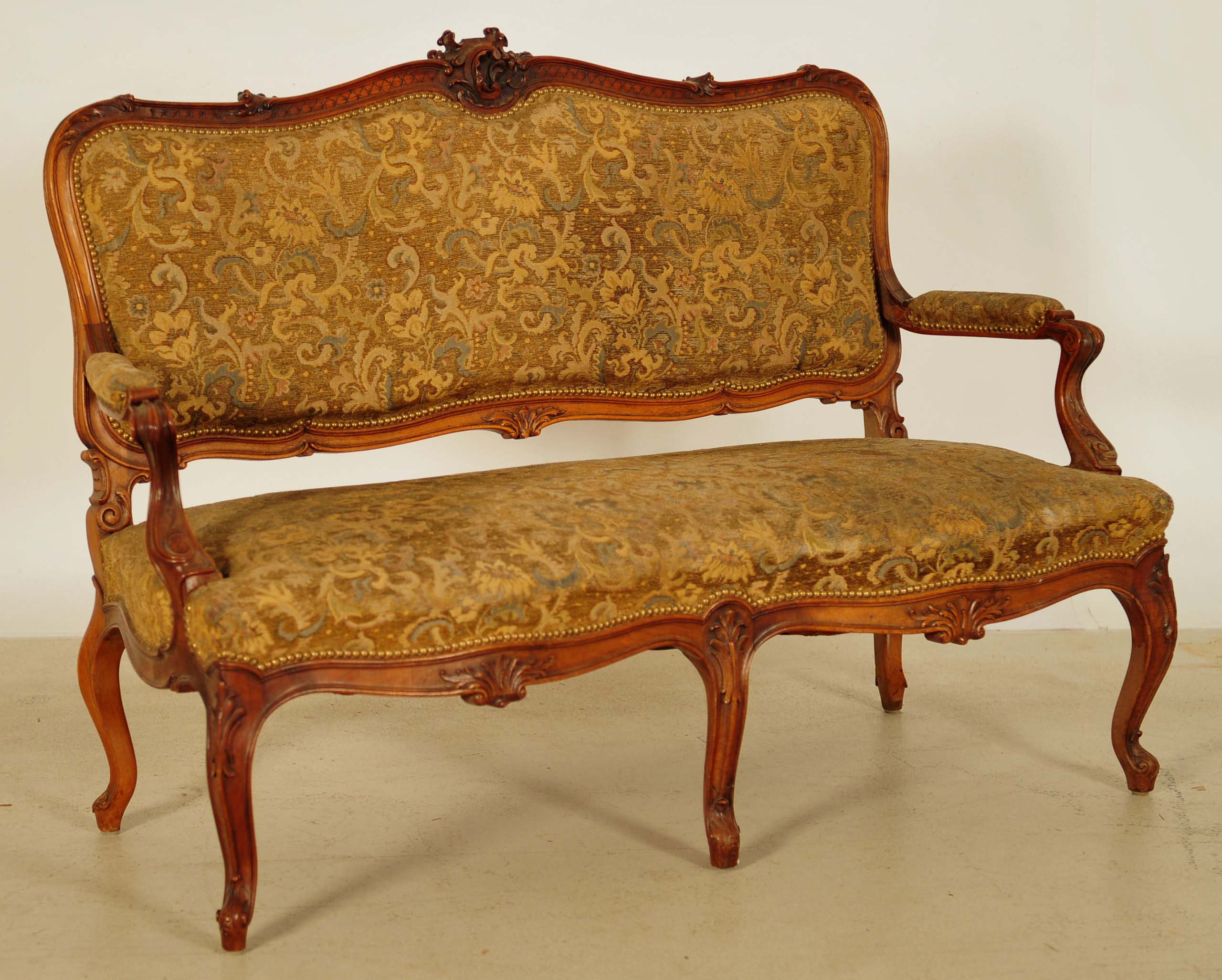 Heute können wir Ihnen eine ganz zauberhafte Sitzgruppe aus der eleganten Stilepoche des Pfeiferl-Barock anbieten. Dieses fünfteilige Ensemble wurde um 1880 aus feinstem massivem Nussbaum gefertigt und besticht durch seine erhabene und formvollendete Ausstrahlung.