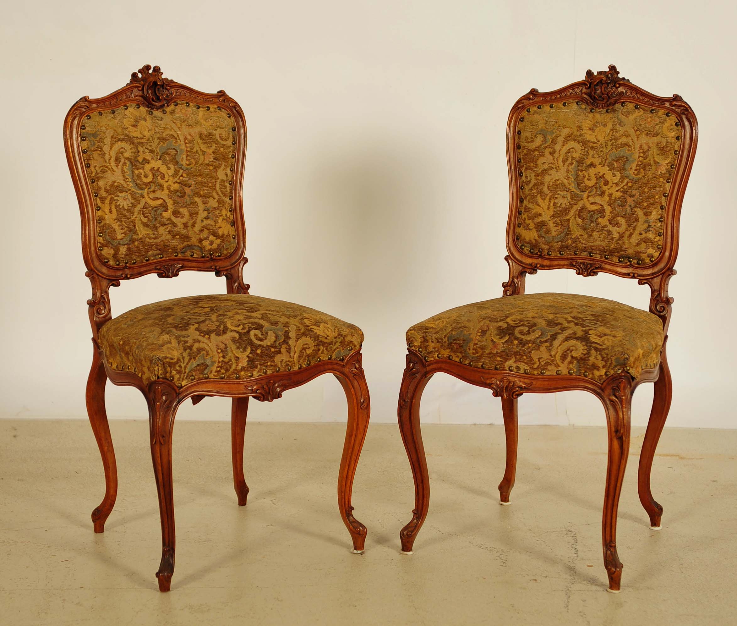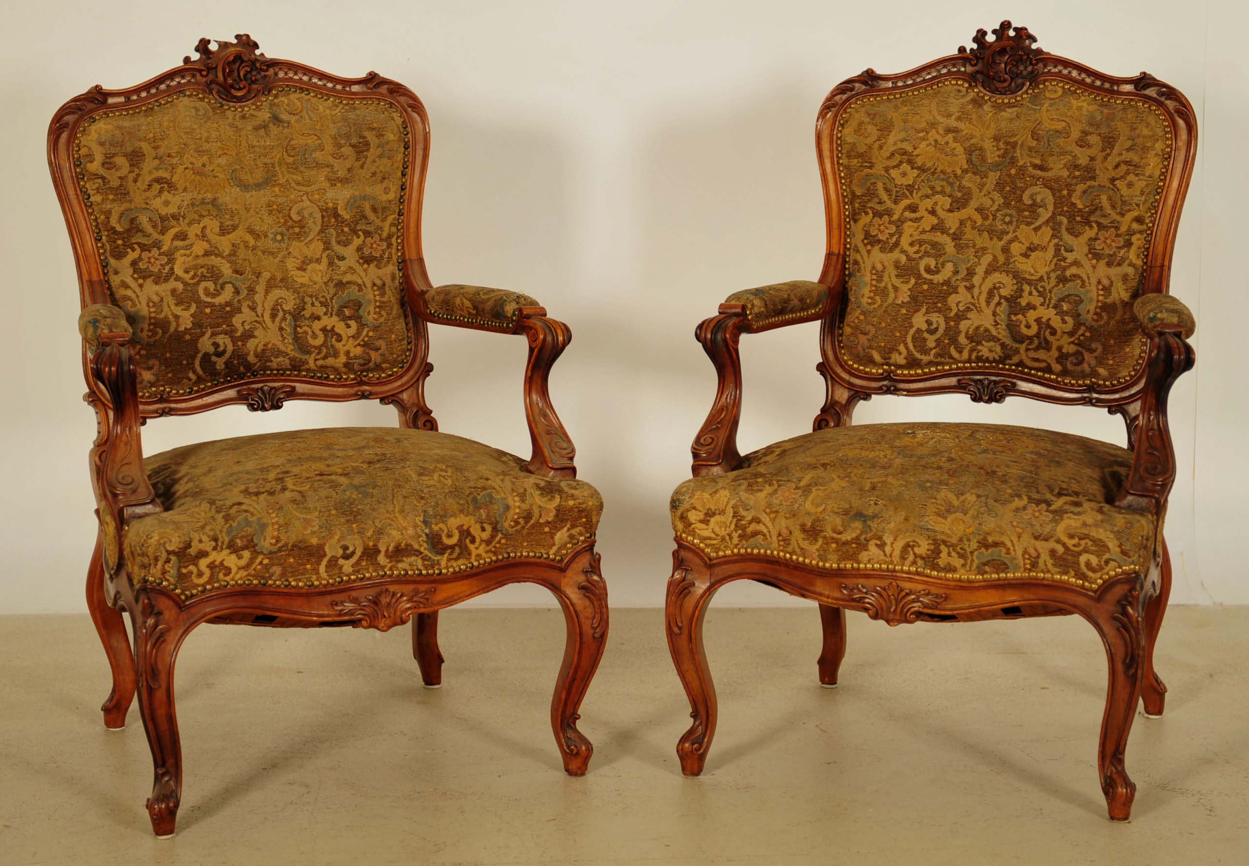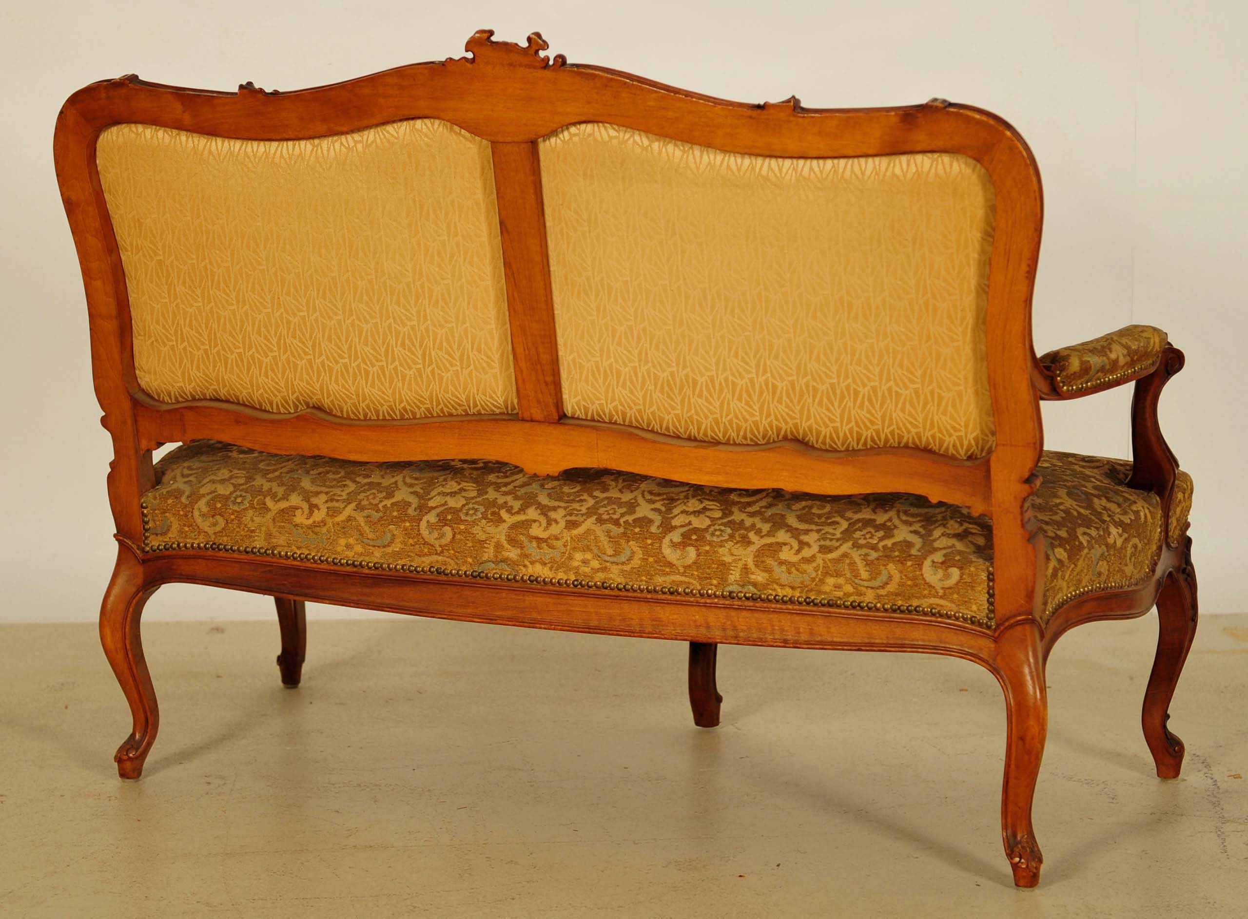 Die Sitzgruppe setzt sich aus einem zweisitzigem Sofa, zwei Armlehnen und zwei Stühlen zusammen. Allen Einzelstücken gemein sind die geschwungene Linienführung sowie die fantastischen, handgeschnitzten Bekrönungen sowie die weiteren meisterlich geschnitzten Verzierungen der Korpusse. Darüber hinaus harmonierte der rötlich warme Farbton des Holzes auf äußerst angenehme Weise mit dem hochwertigen Polsterbezug aus hübschem Damast.