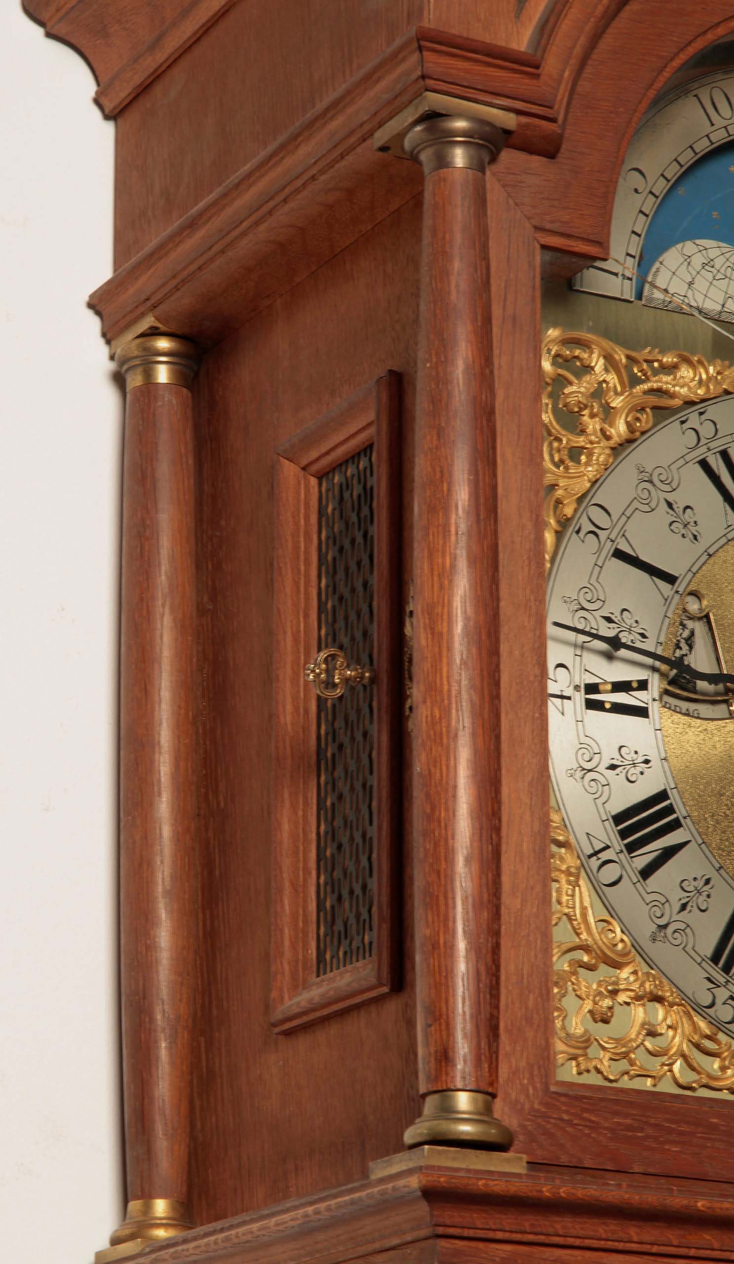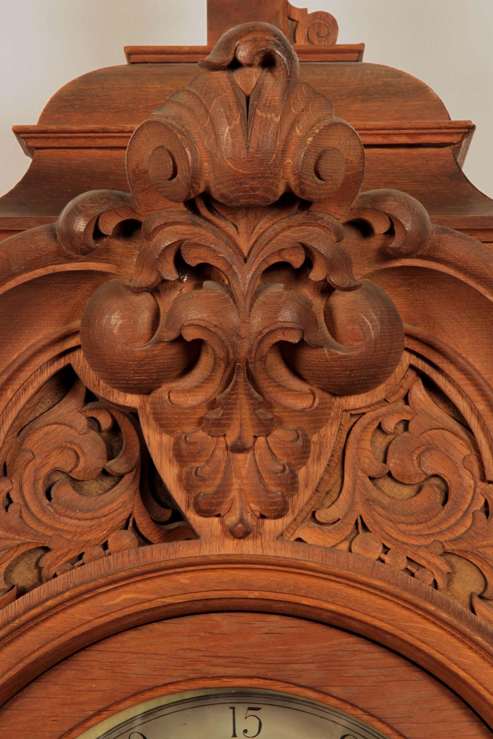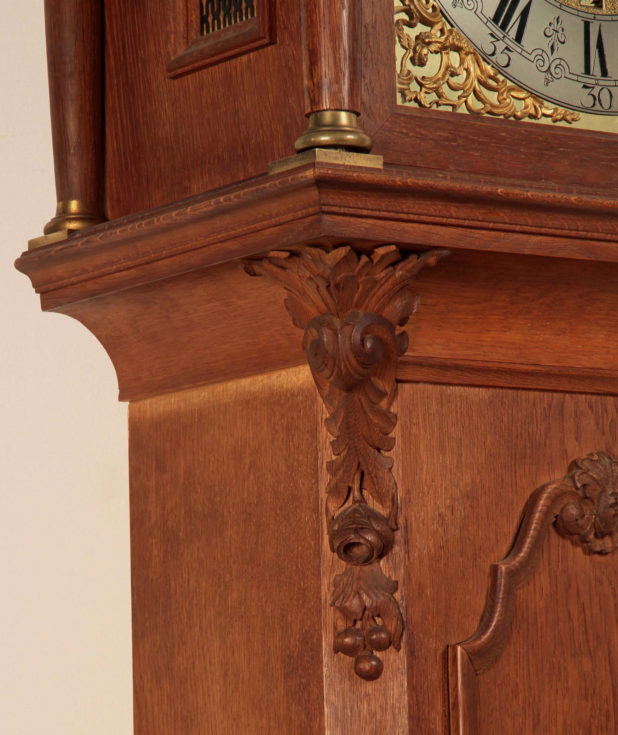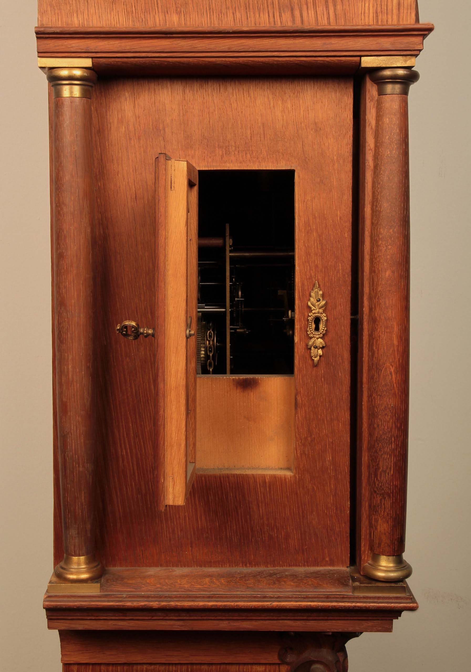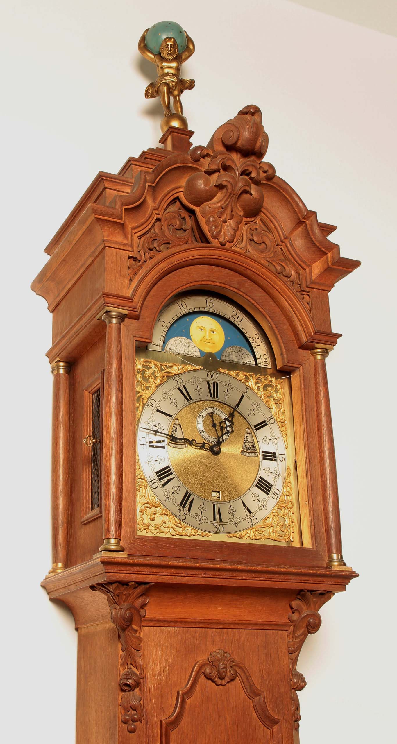 Eine spektakuläre Höhe von 305 cm, Monatsläufer, Mondphase, Wochentags-Anzeige, Sekundenanzeiger, die Weltkugel haltenden Atlant als fulminante Bekrönung und einem aus bester Eiche, massiv und furniert, gefertigten und wunderschön gegliedertem Korpus sind nur die hervorstechendsten Merkmale dieses um 1890/1900 gearbeitete Schmuckstück.