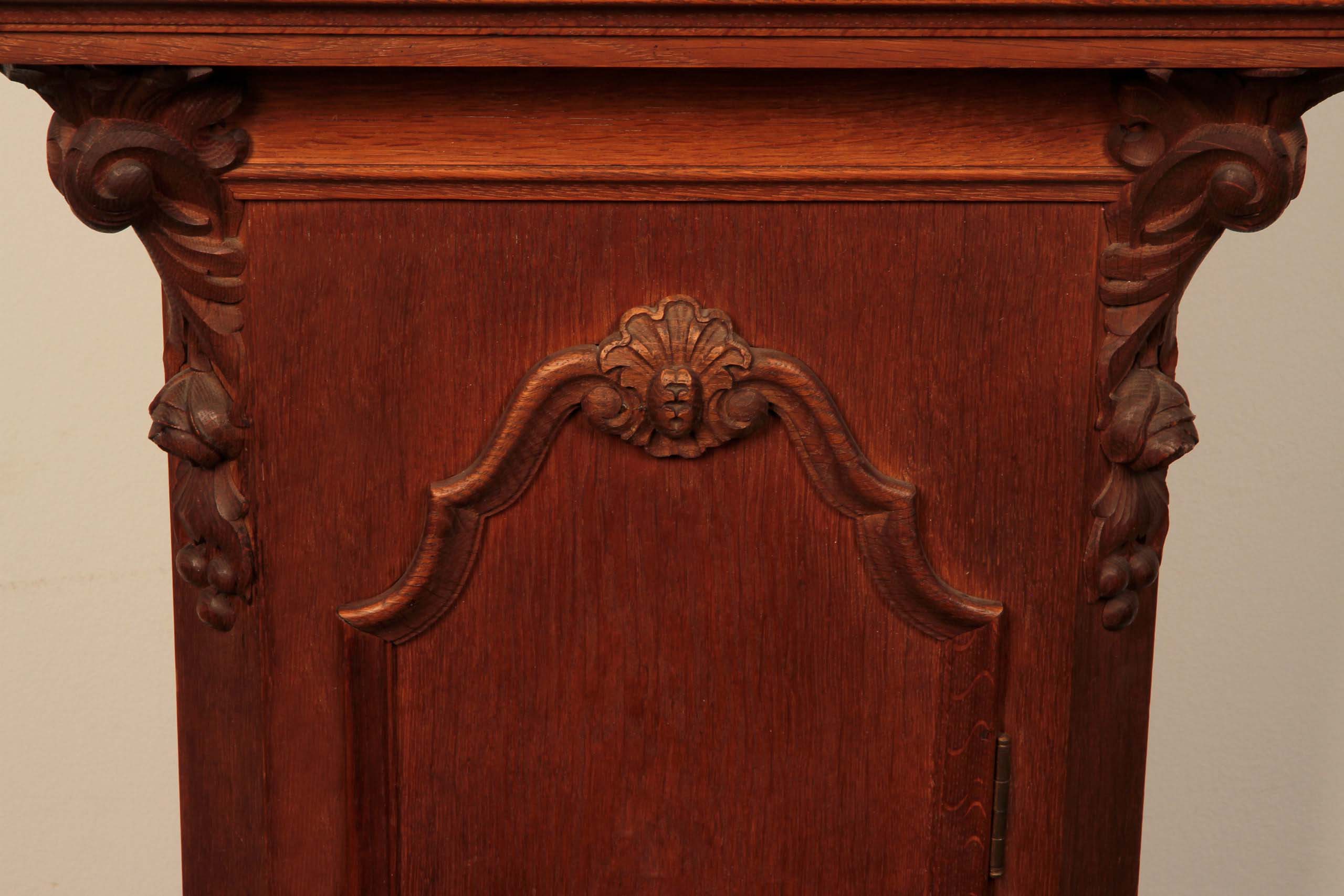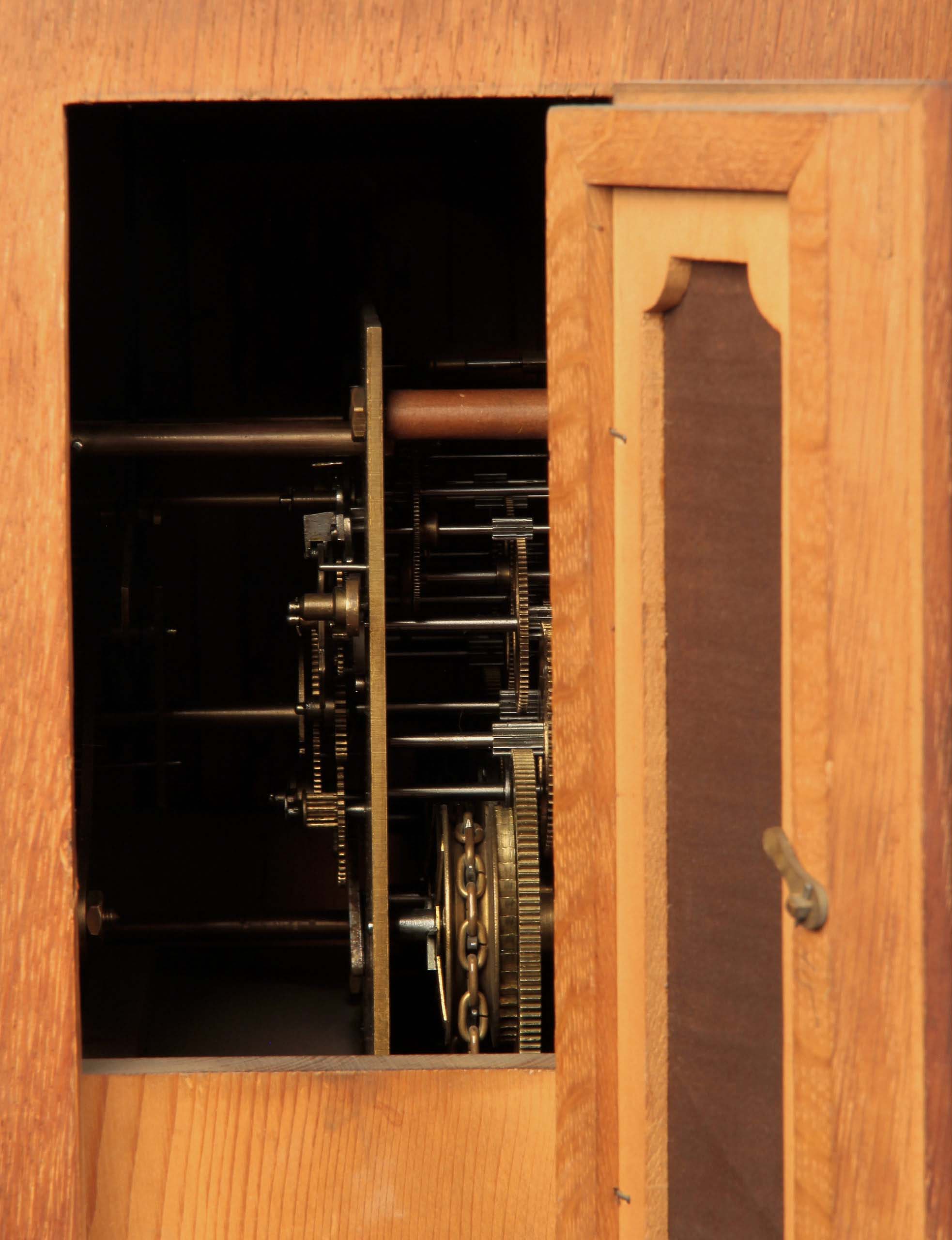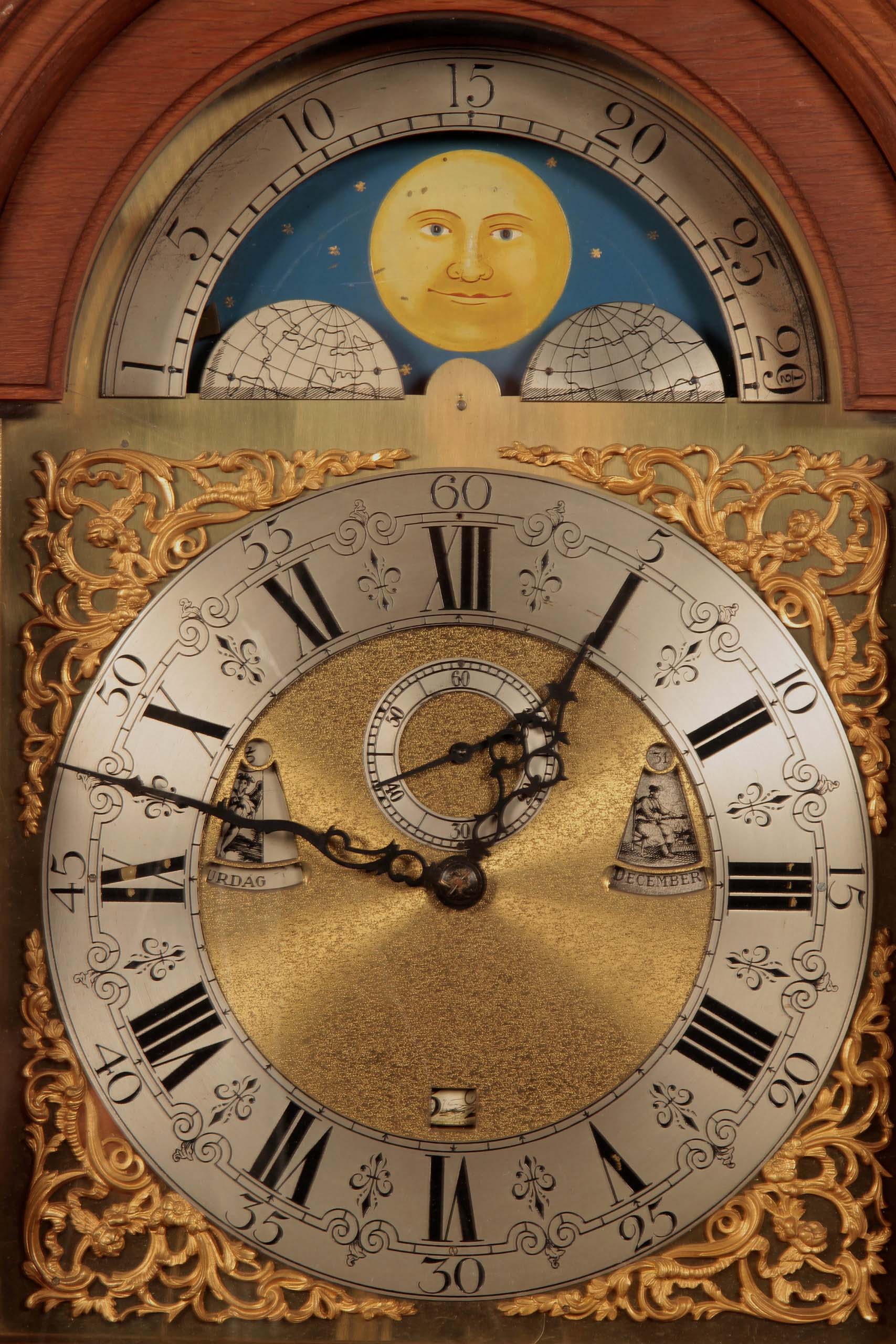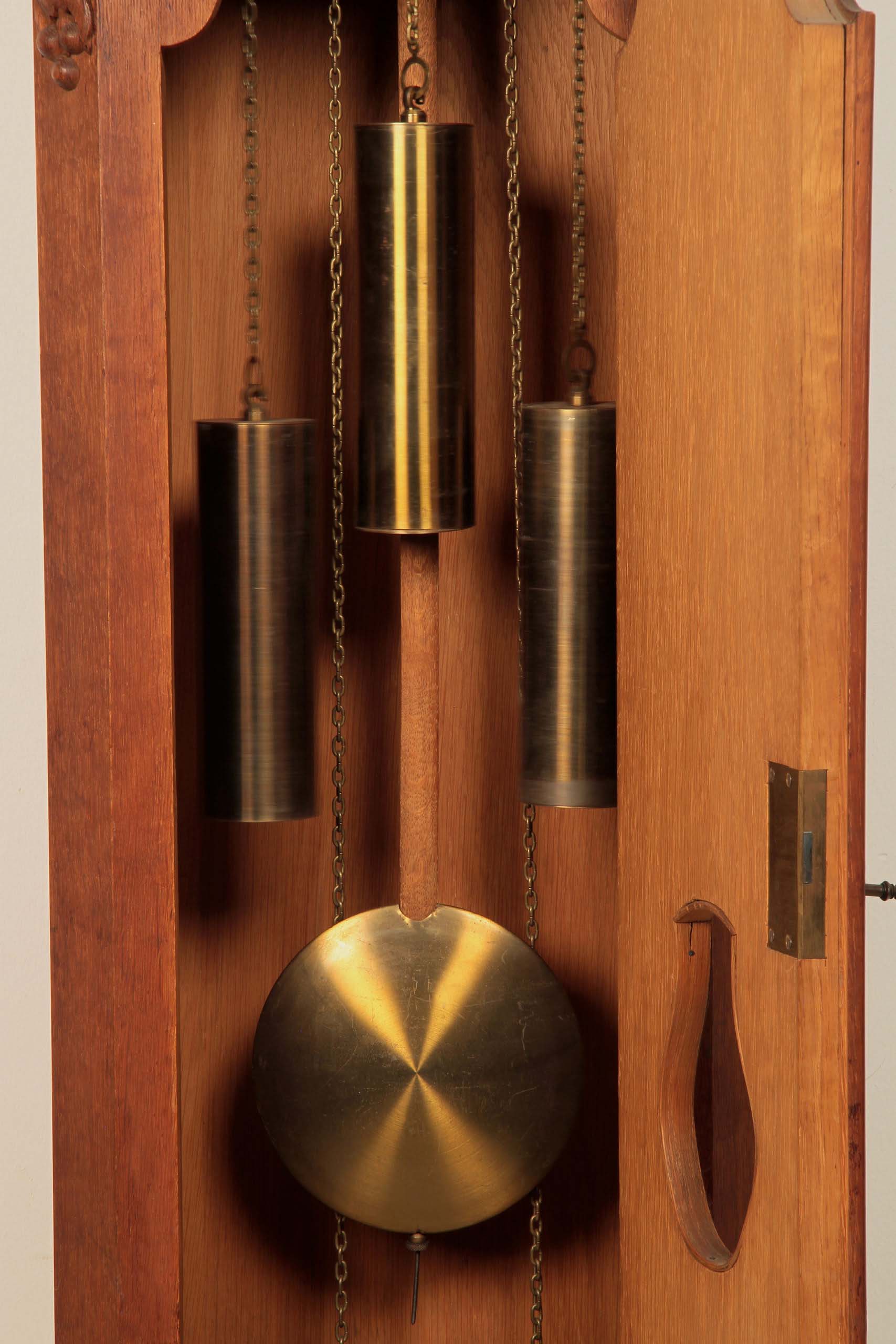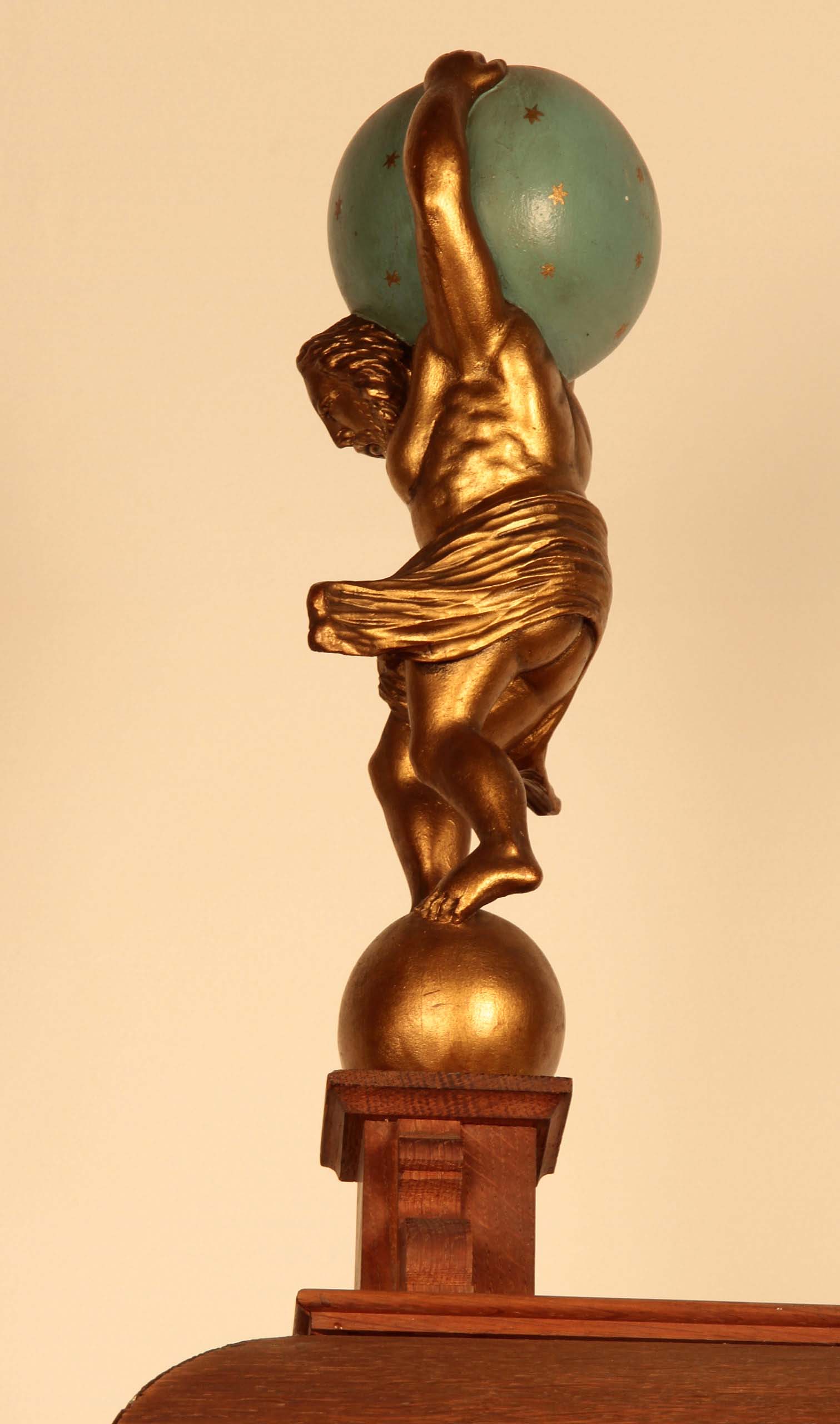 Eine spektakuläre Höhe von 305 cm, Monatsläufer, Mondphase, Wochentags-Anzeige, Sekundenanzeiger, die Weltkugel haltenden Atlant als fulminante Bekrönung und einem aus bester Eiche, massiv und furniert, gefertigten und wunderschön gegliedertem Korpus sind nur die hervorstechendsten Merkmale dieses um 1890/1900 gearbeitete Schmuckstück.