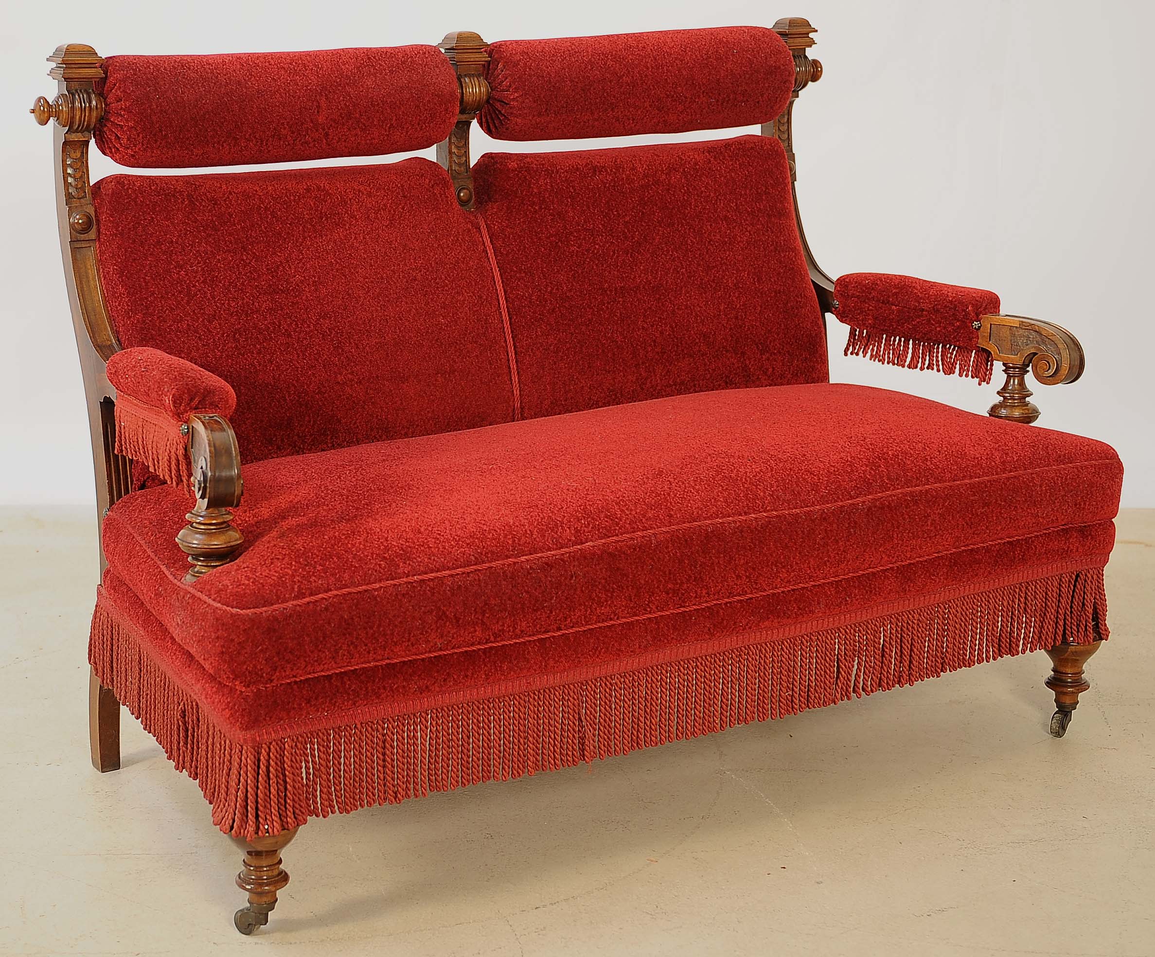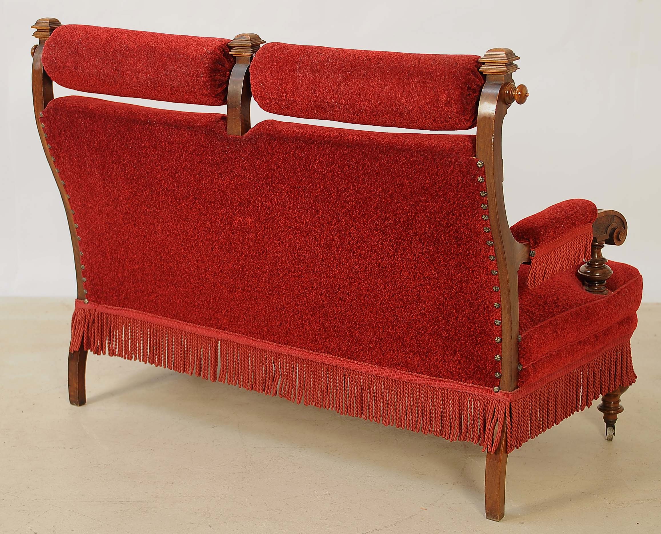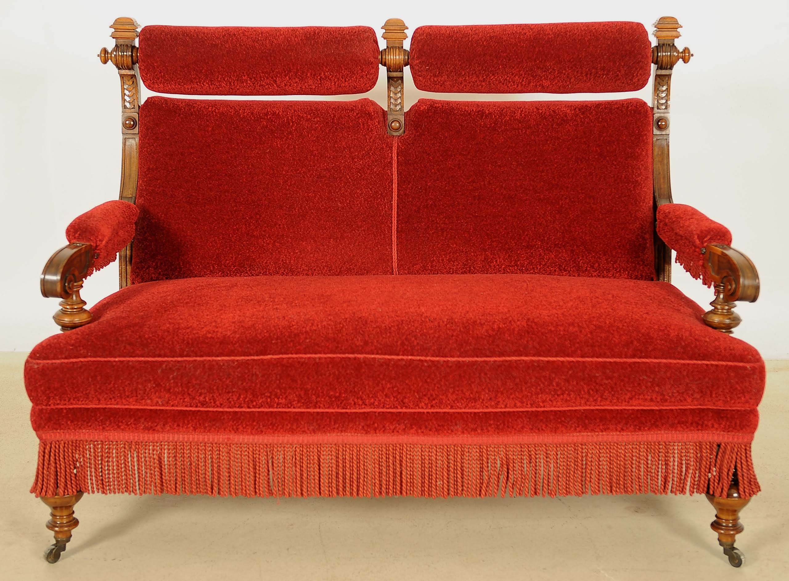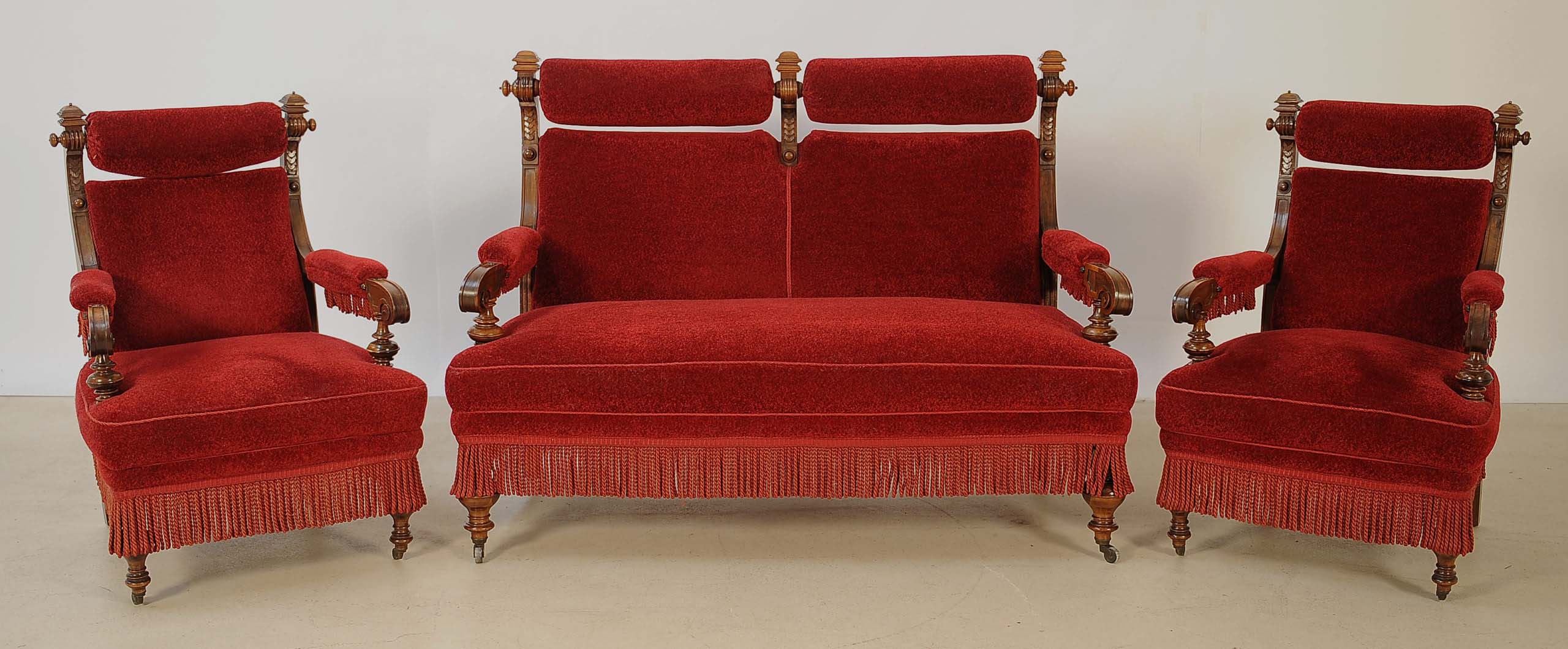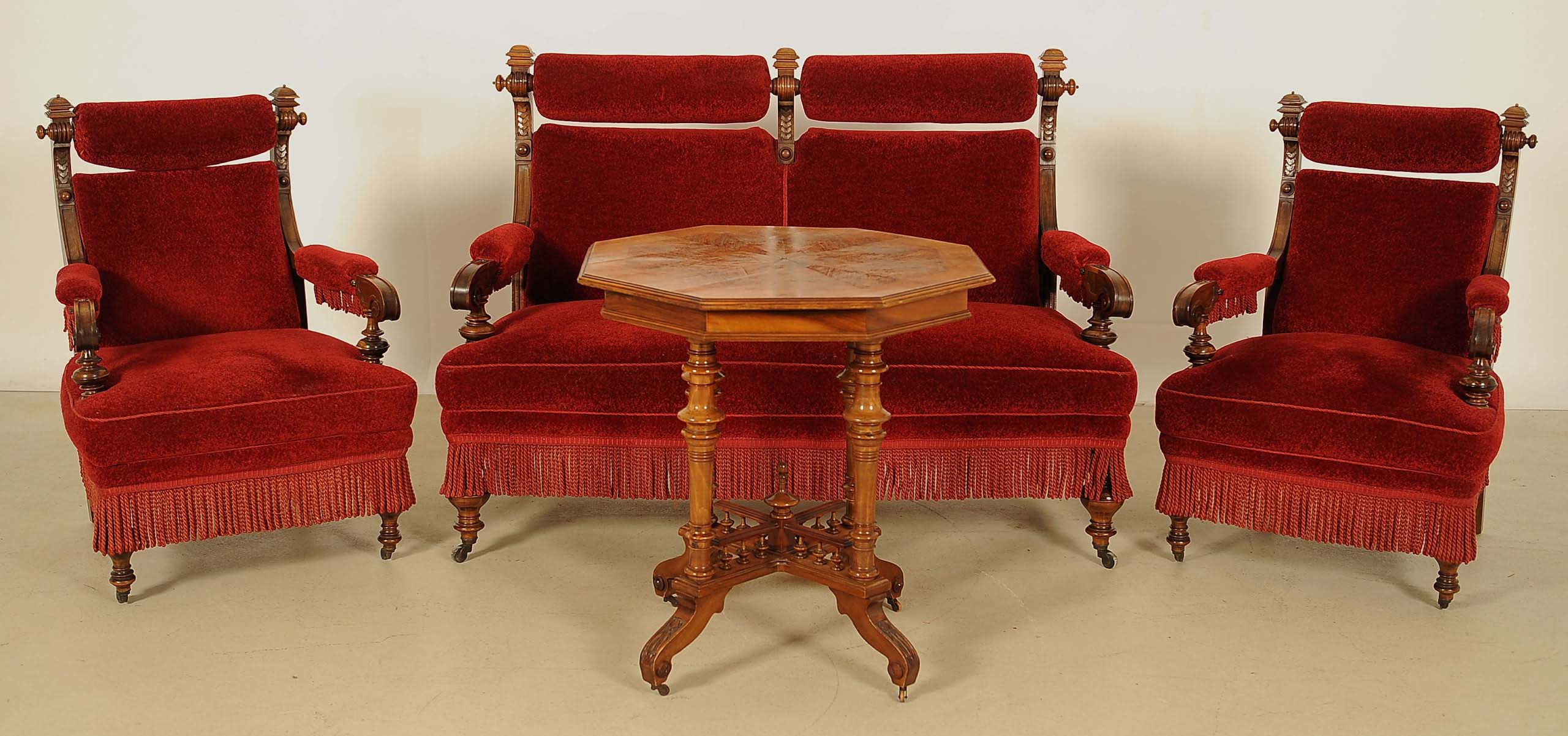Hier können wir Ihnen eine grazile Sitzgruppe aus der Gründerzeit anbieten. Sie wurde um 1890 aus feinstem Nussbaum, massiv und furniert, gefertigt und begeistert durch stilvolle Architektur und elegante Linienführung, wodurch sich eine erhabene Ausstrahlung ergibt.