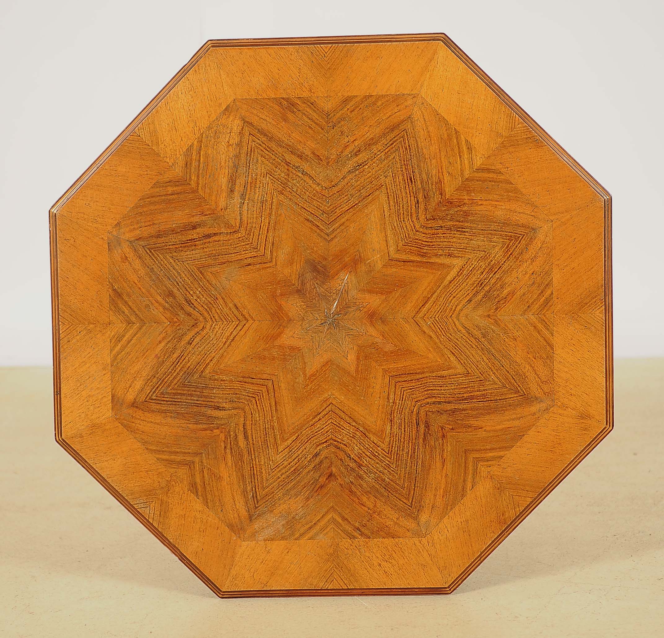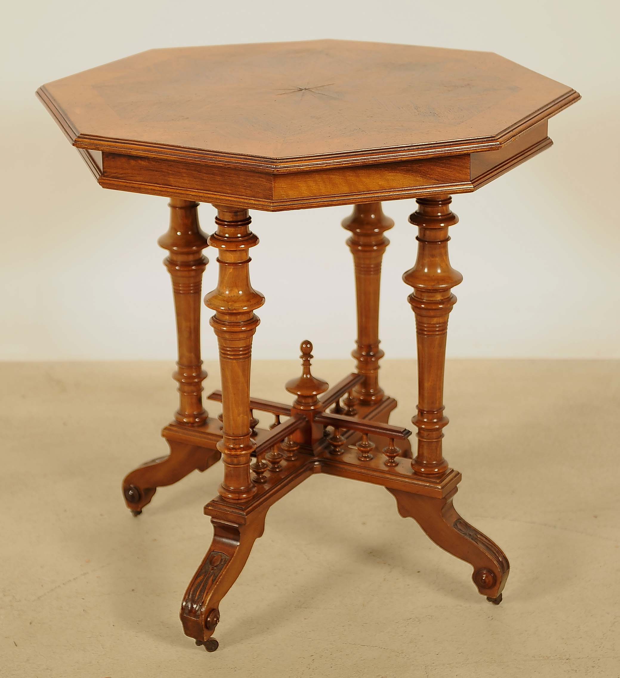 Besonders zu beachten ist die feine Intarsierung sowie das schöne Furnierbild bei der Deckplatte des Tisches, aufwändig gedrechselten Balusterbeine, das hübsche Fußkreuz des Tisches mit schön geschwungenen Beinen.