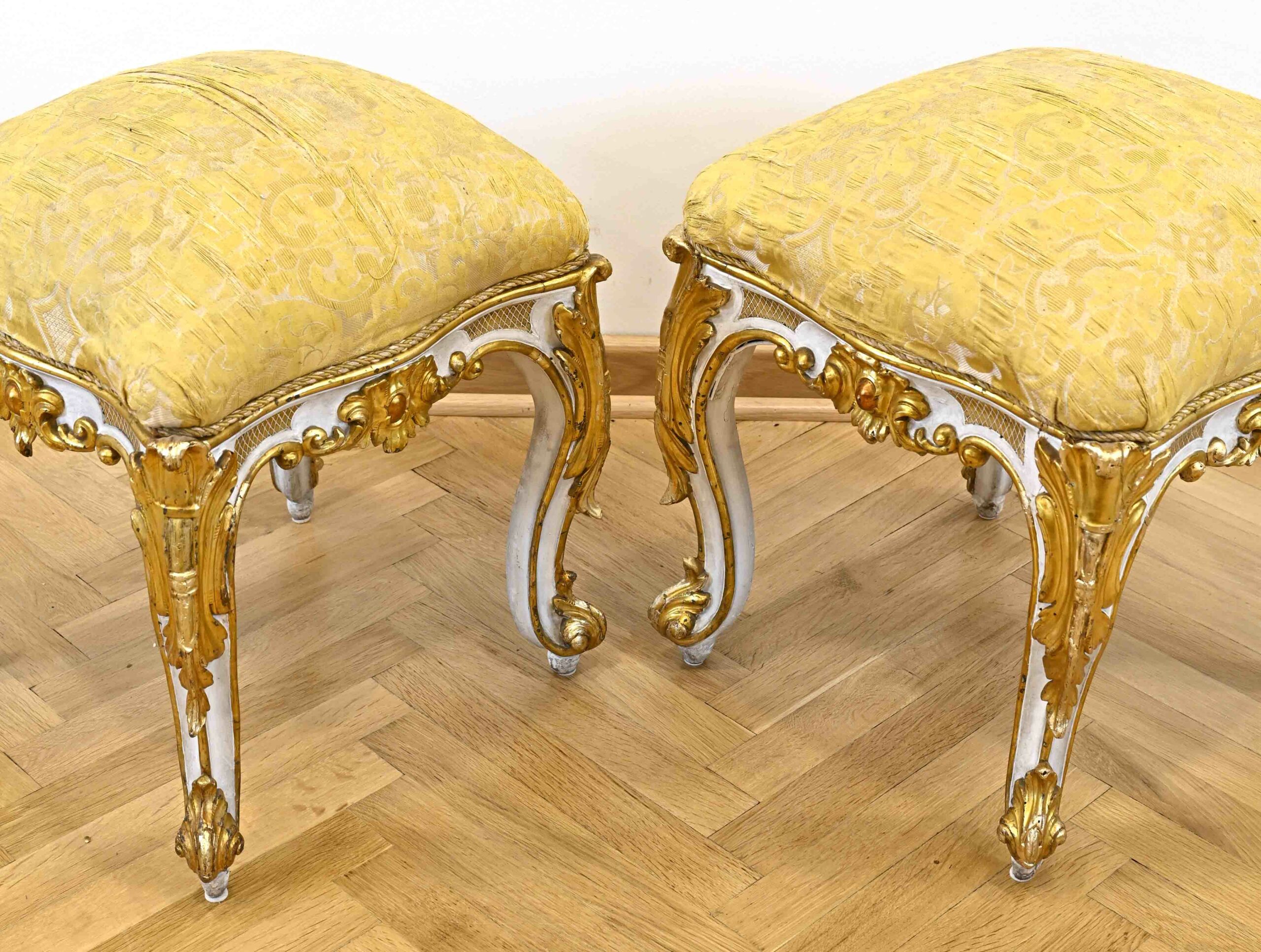 Gefertigt im späten 19. Jahrhundert in Italien. Die Sitzgruppe ist vergoldet und weiß lackiert mit prunkvoller Bekrönung im Rocaille-Stil, großformatige plastische Akanthusblätter, volutierende Beine sowie goldfarbener Damast Bezug.