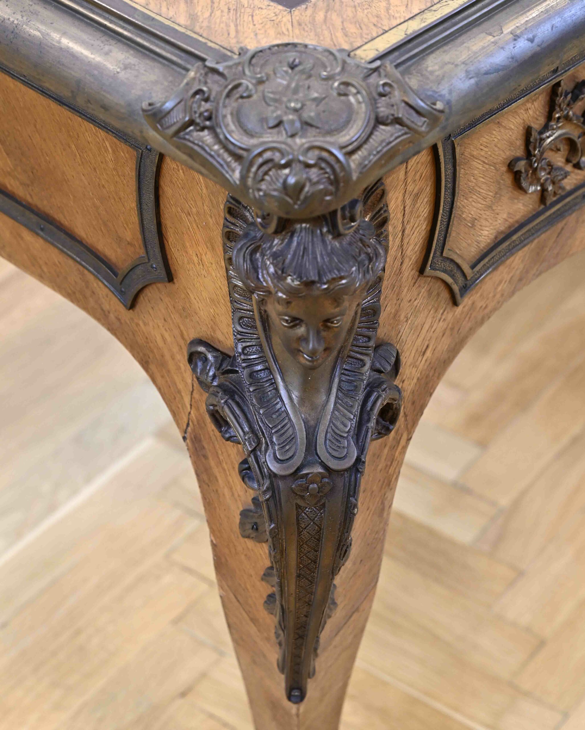 Der seltene aus Palisander gefertigte Tisch begeistert durch seine unglaubliche Bronzestab-Einfassung , Bronze Applikationen u.a. mit plastischen Frauenbüsten sog. „bustes des femmes“ sowie vier Zentralmedallions. Außerdem erwähnenswert sind die elegant geschwungenen Beine mit Tatzenfüßen sowie die profilierte Deckplatte.
