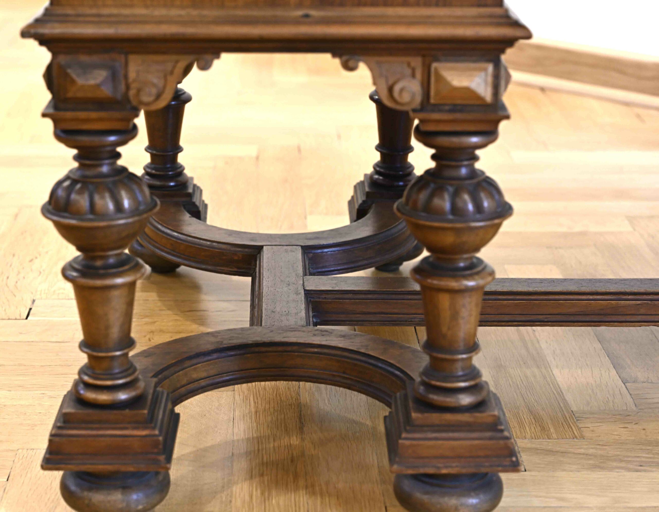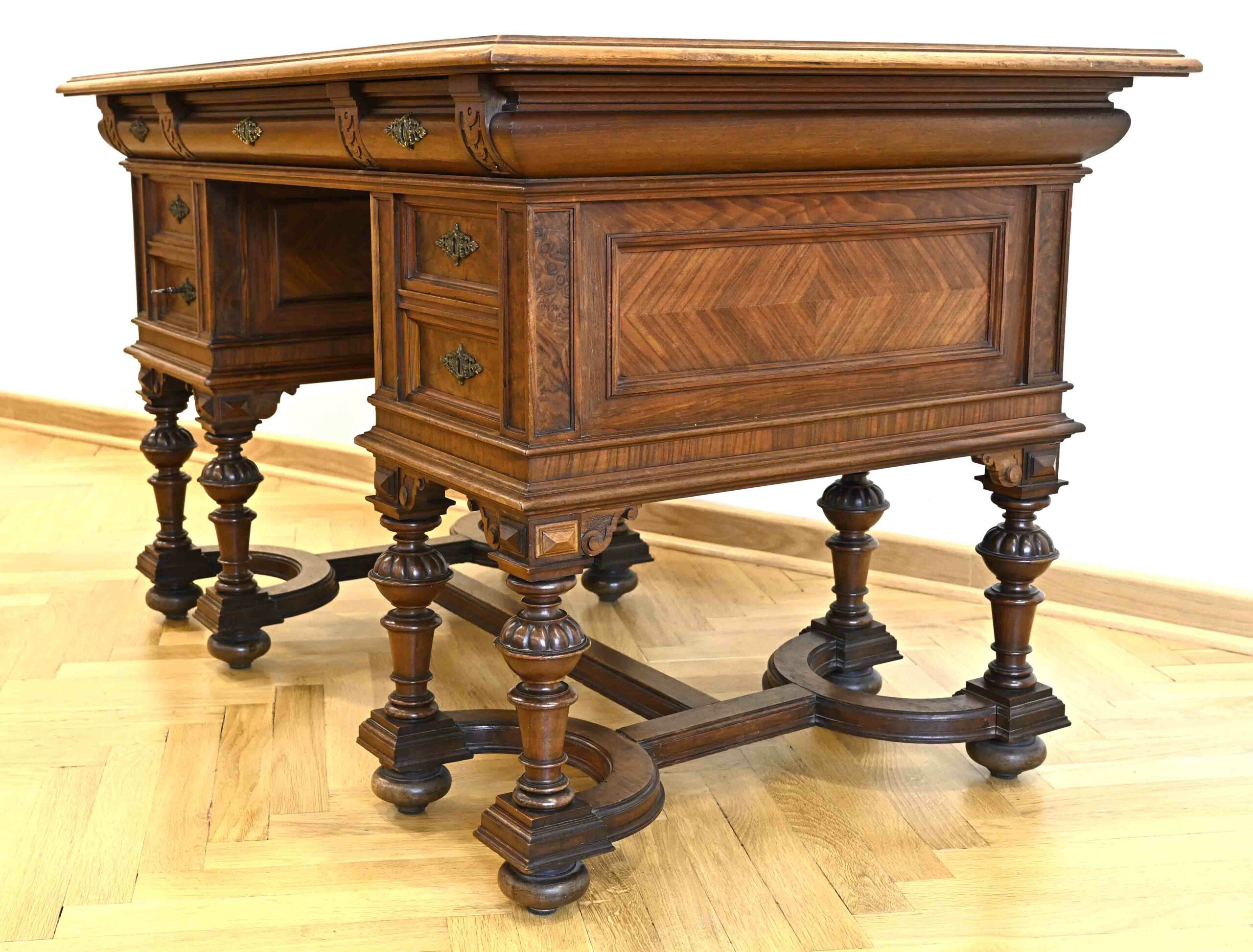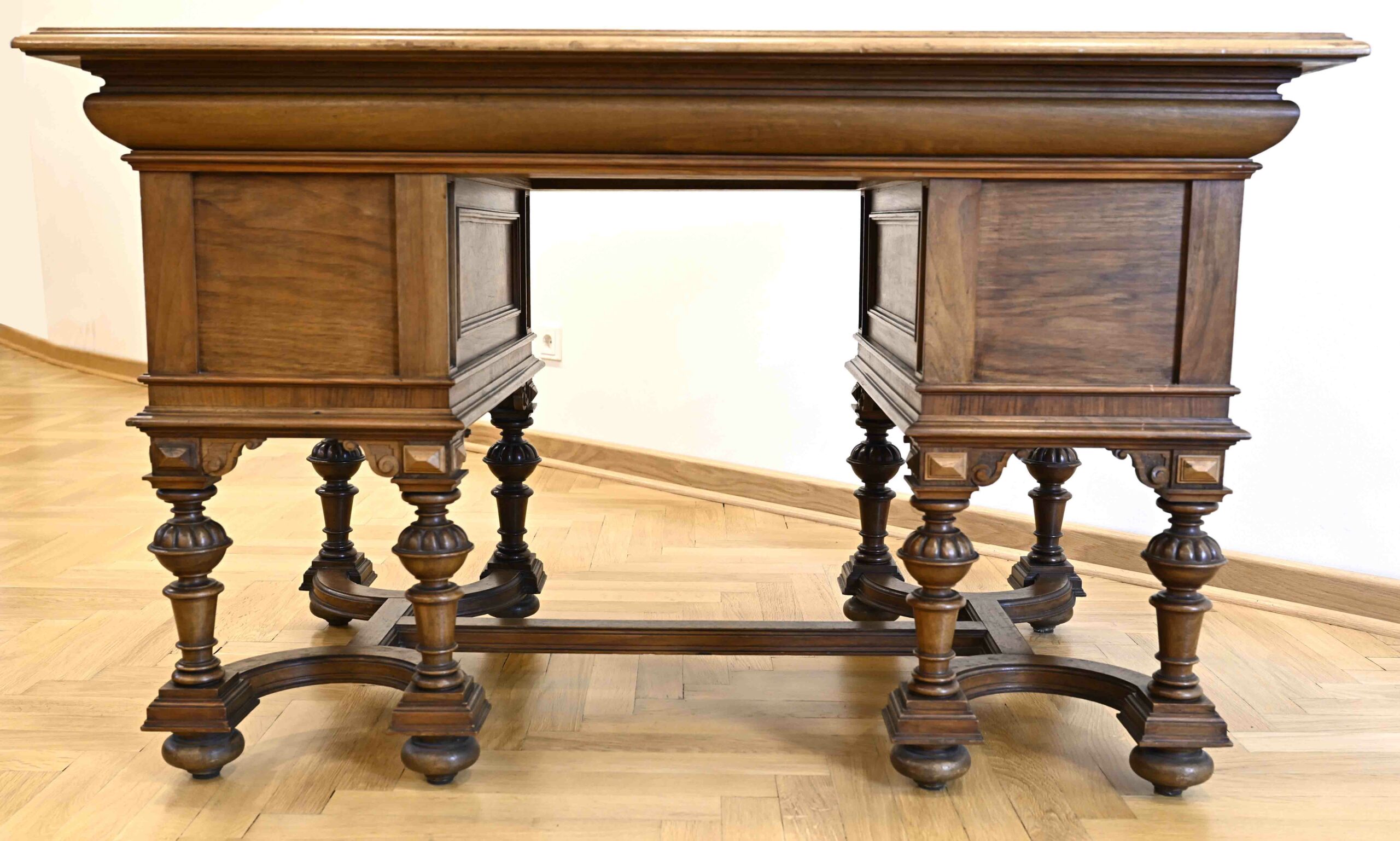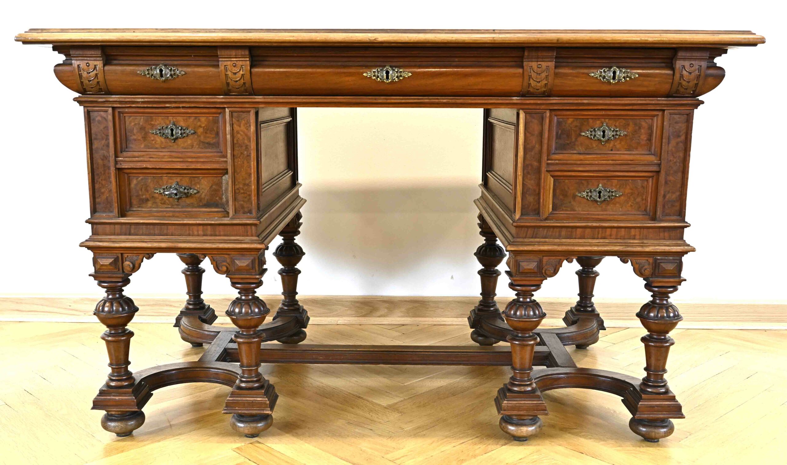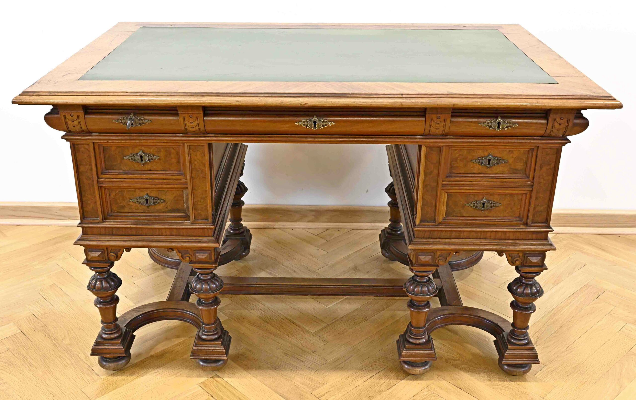Hübsch eingefasste Deckplatte mit Ledereinsatz, 7 Schübe mit schönem Beschlagwerk, aufwändig gedrechselte Säulen im Unterbau, profiliertes Fußkreuz mit gedrückten Tellerfüßen, komplett kassettiert.