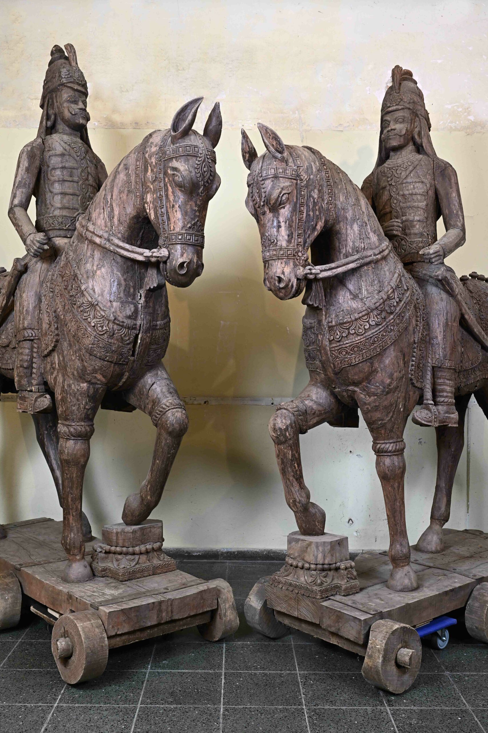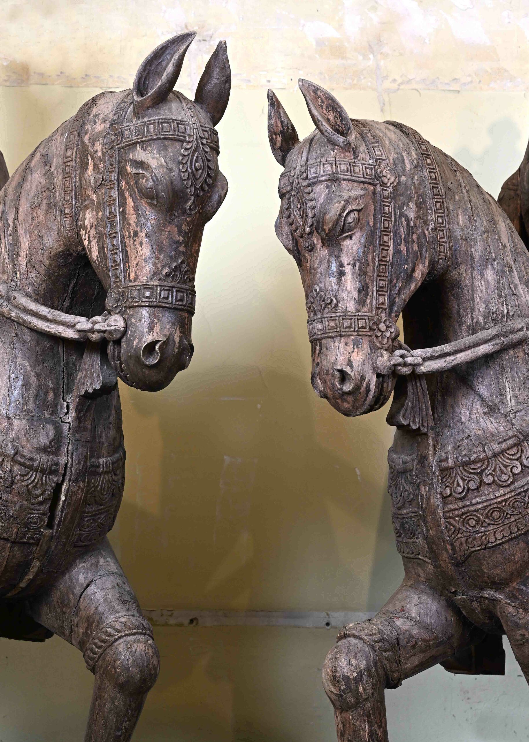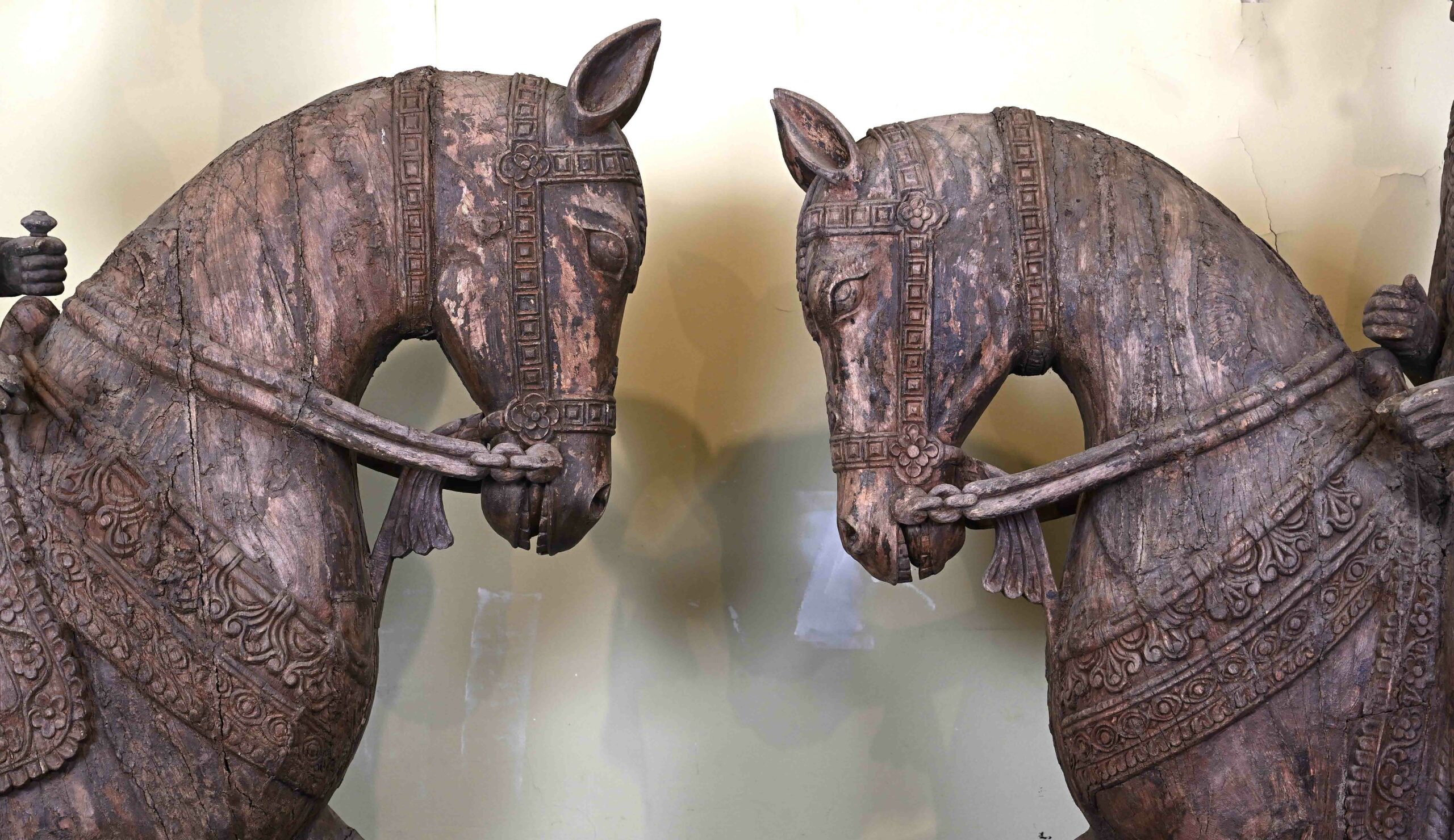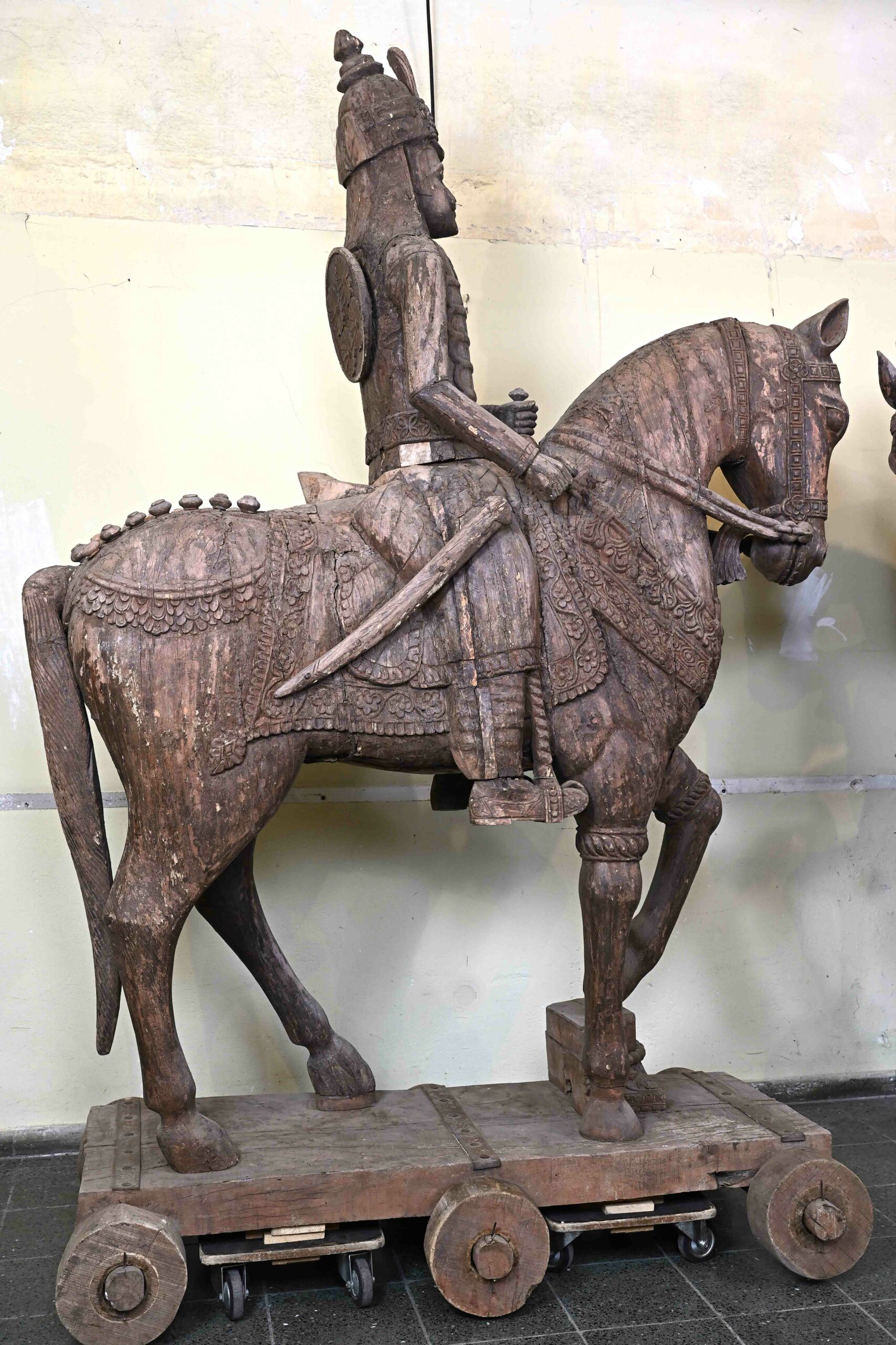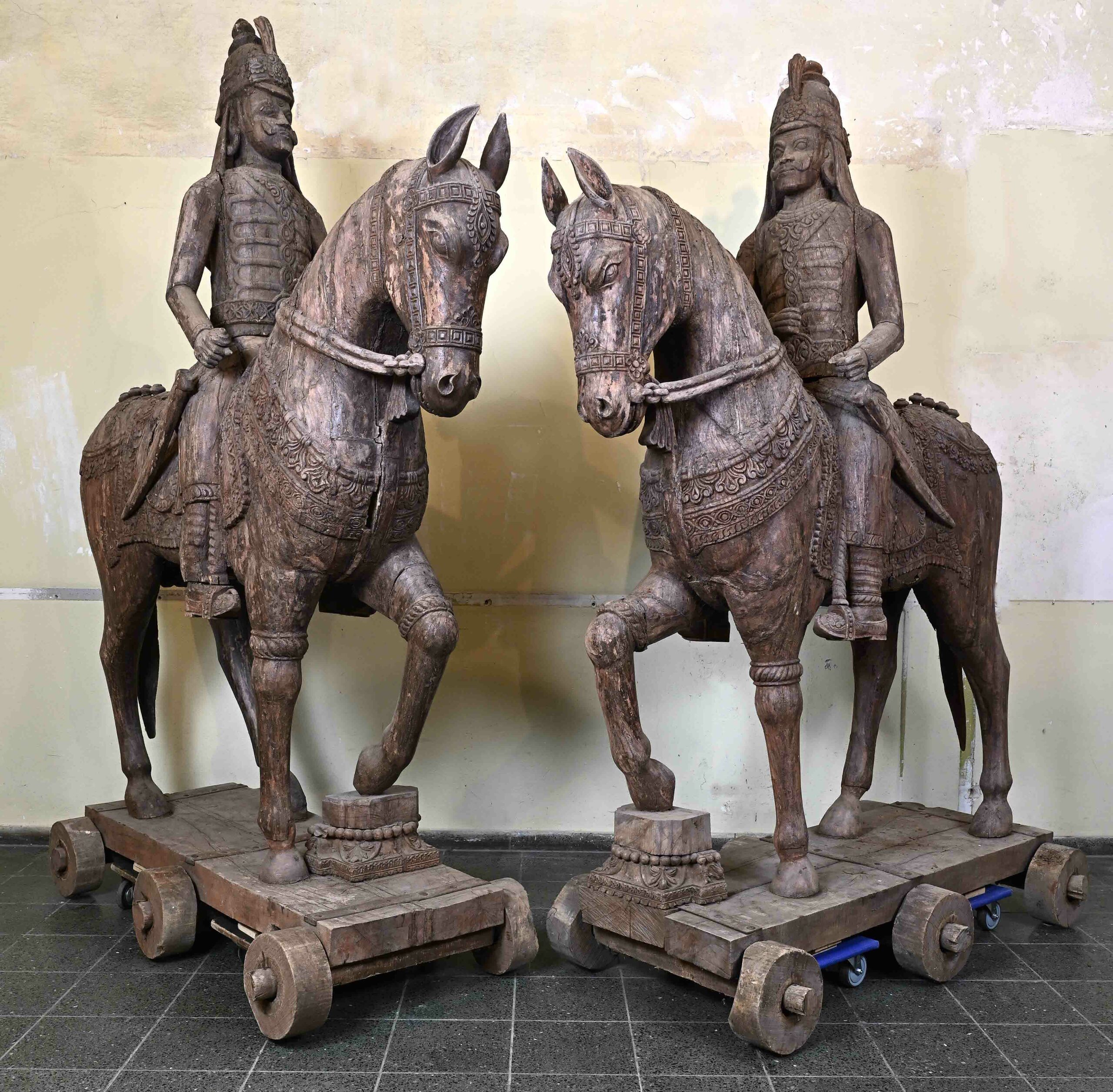 Die Pferde sind schön skulpturiert mit einem Bein angehoben, das Zaumzeug mit quadratischem Muster, doppelter Brustgurt mit floralen Motiven, ebenso die Satteldecke und die Decke über der Kruppe. Markant sind die Glockengurte, die unter dem Schweif durchführen. Man findet sie in zahllosen Pferdedarstellungen aus Madras. Gemäß dem Vorbesitzer waren diese Reiter am Innentor eines Fürstenpalastes in der Region Tritschinapalli stationiert.