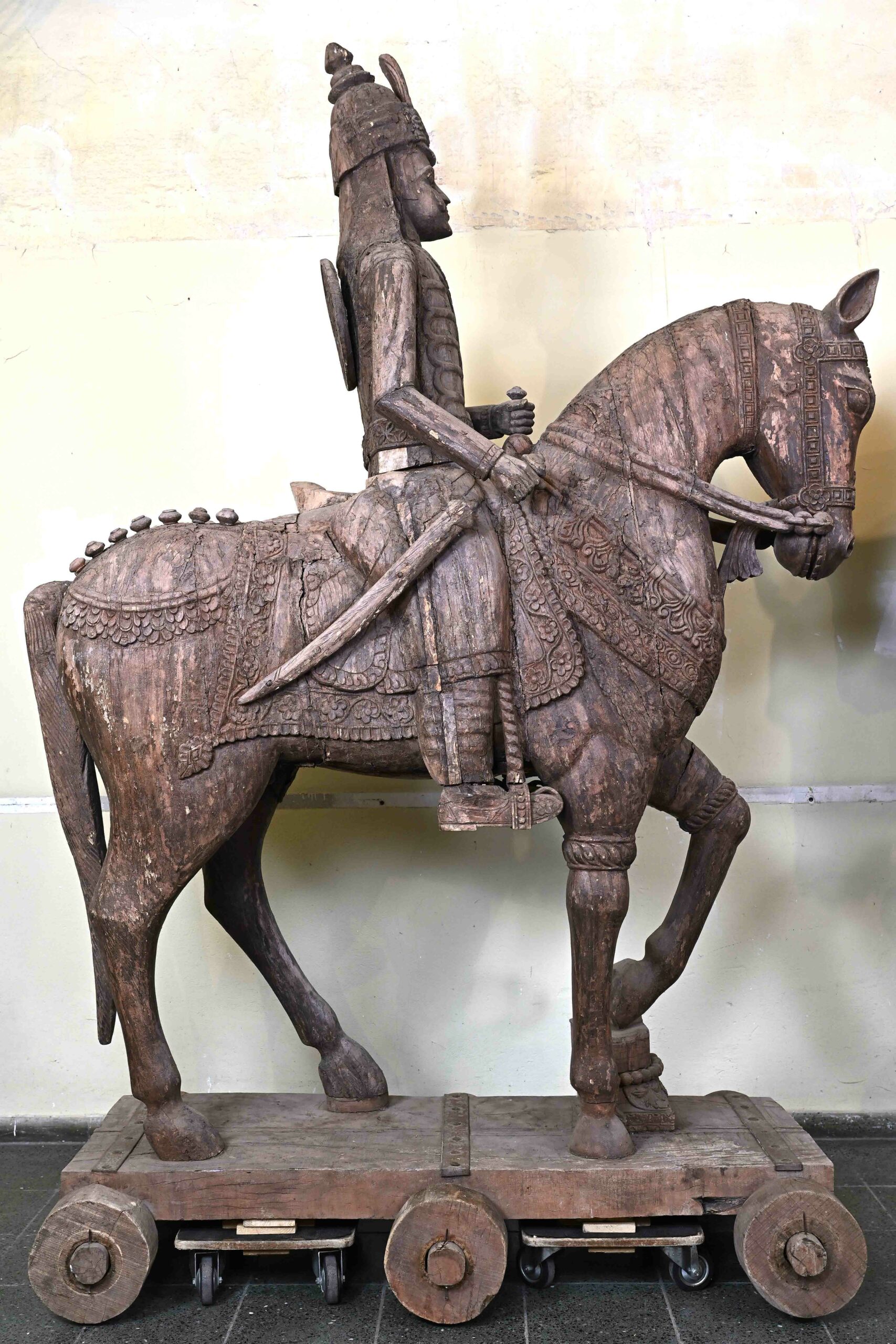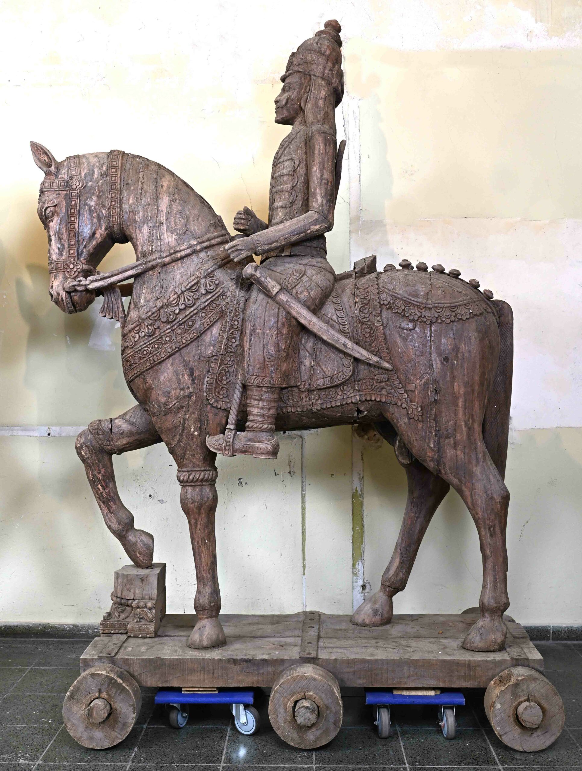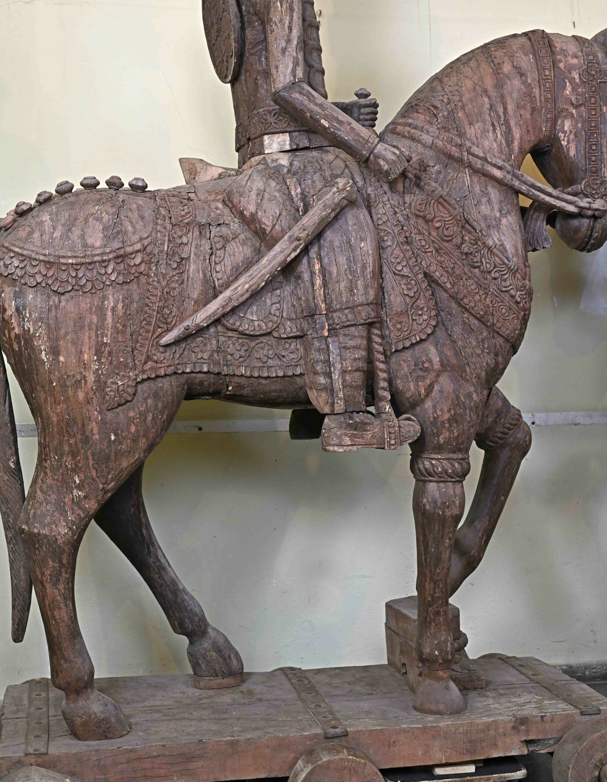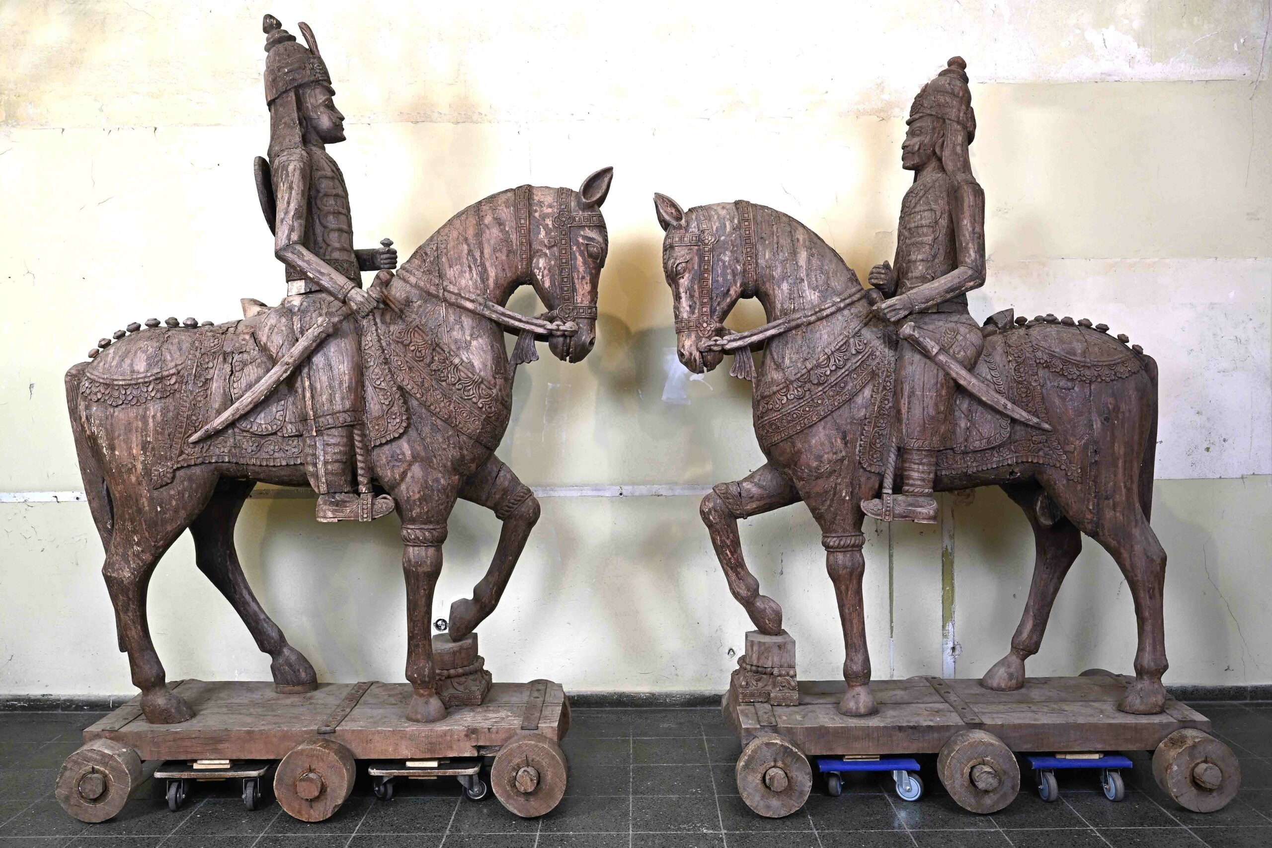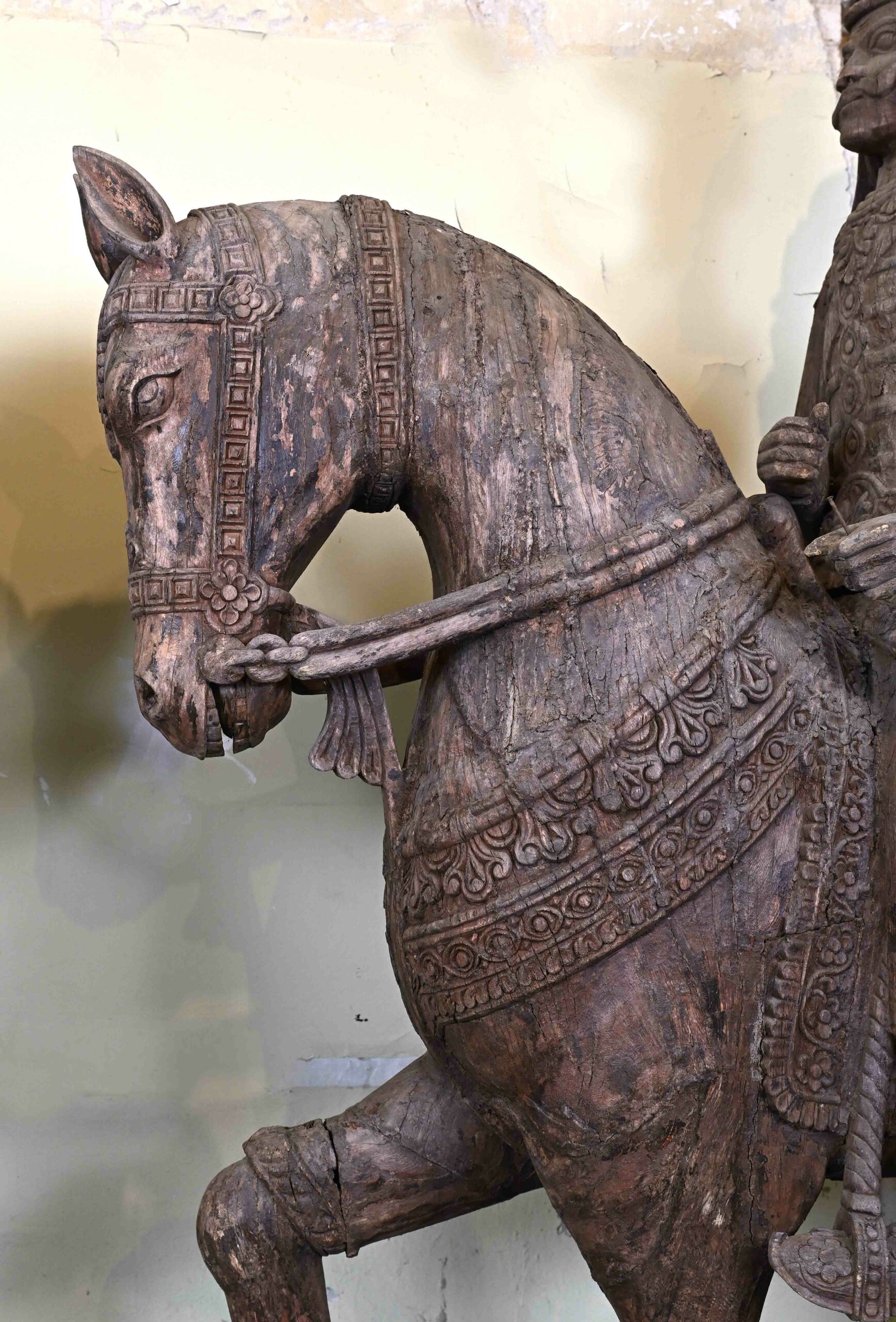 Die Pferde sind schön skulpturiert mit einem Bein angehoben, das Zaumzeug mit quadratischem Muster, doppelter Brustgurt mit floralen Motiven, ebenso die Satteldecke und die Decke über der Kruppe. Markant sind die Glockengurte, die unter dem Schweif durchführen. Man findet sie in zahllosen Pferdedarstellungen aus Madras. Gemäß dem Vorbesitzer waren diese Reiter am Innentor eines Fürstenpalastes in der Region Tritschinapalli stationiert.