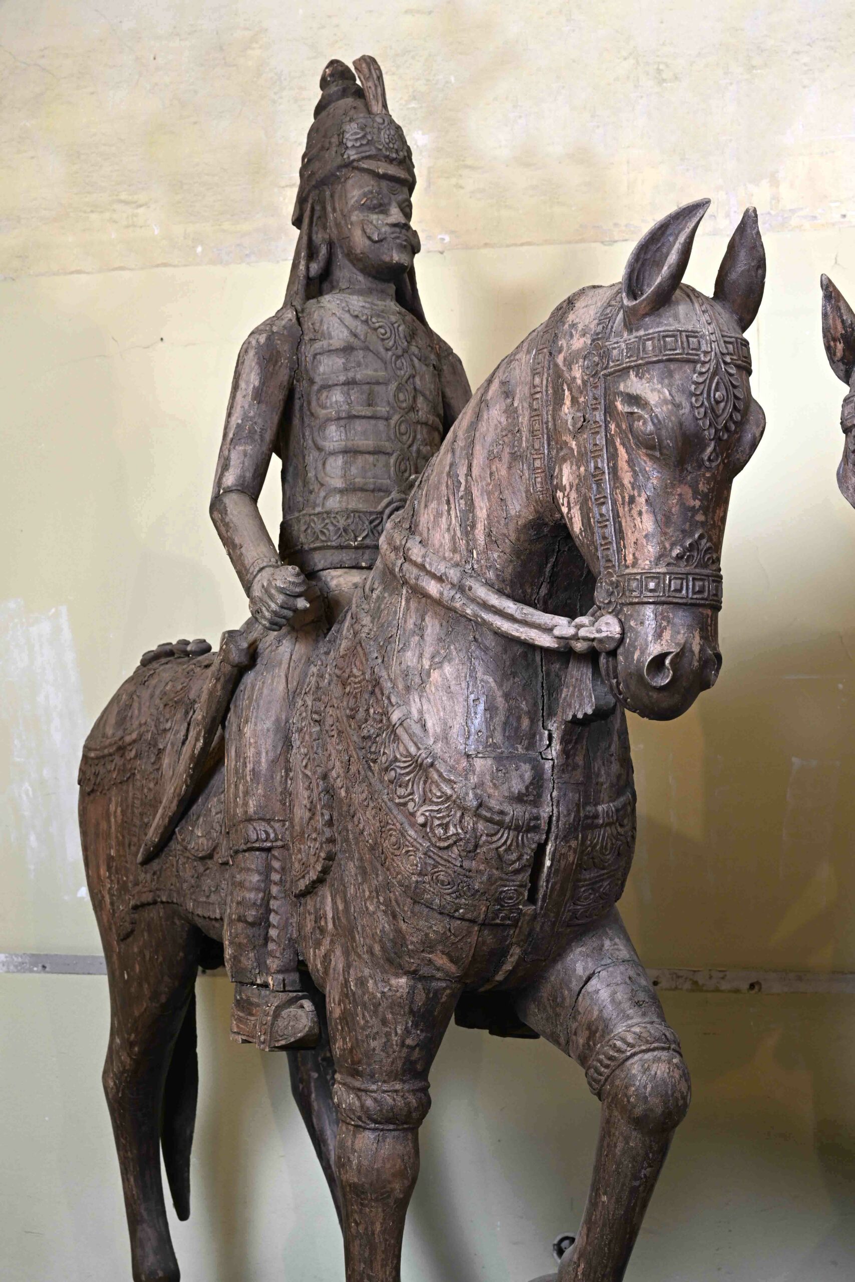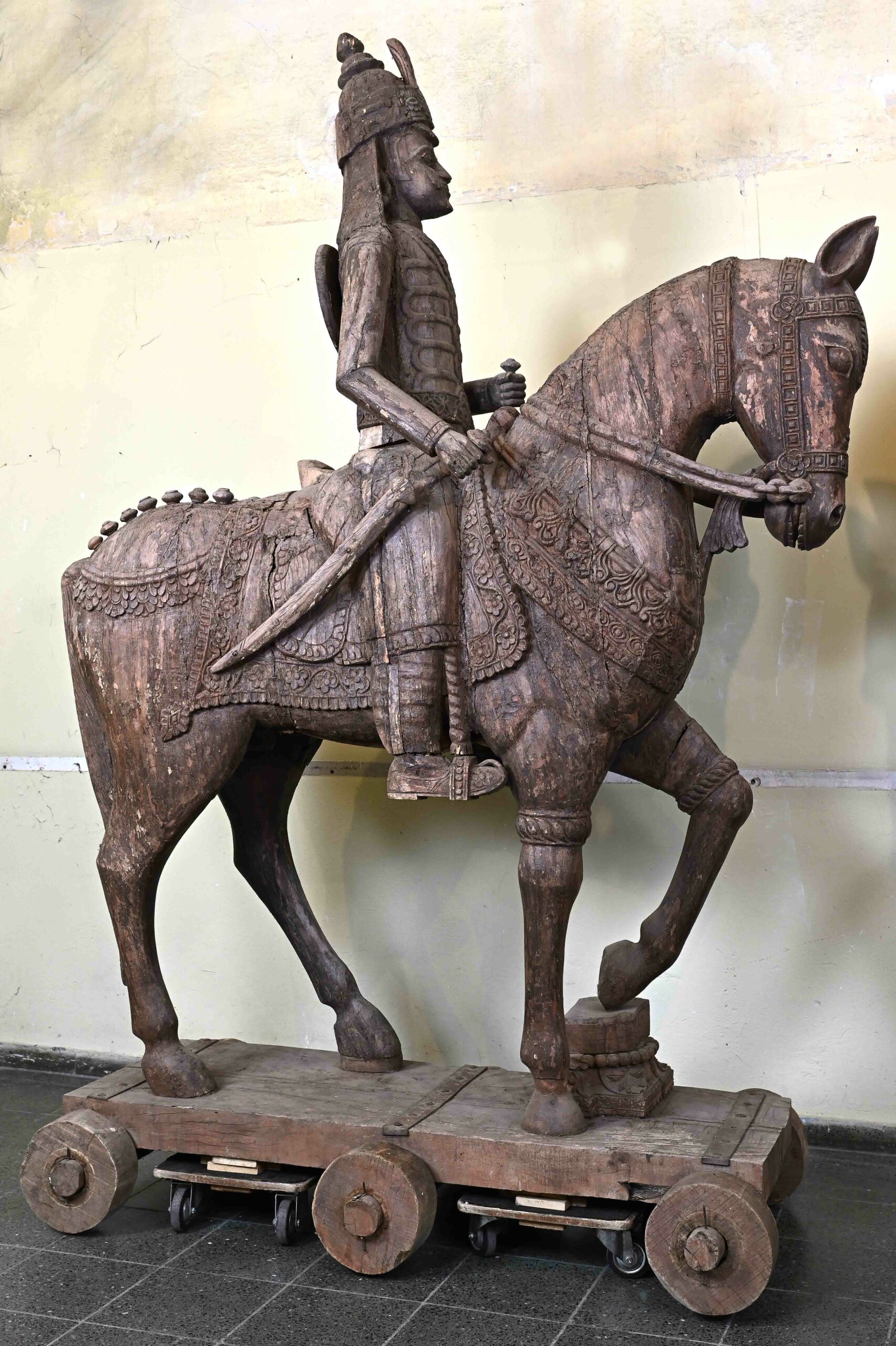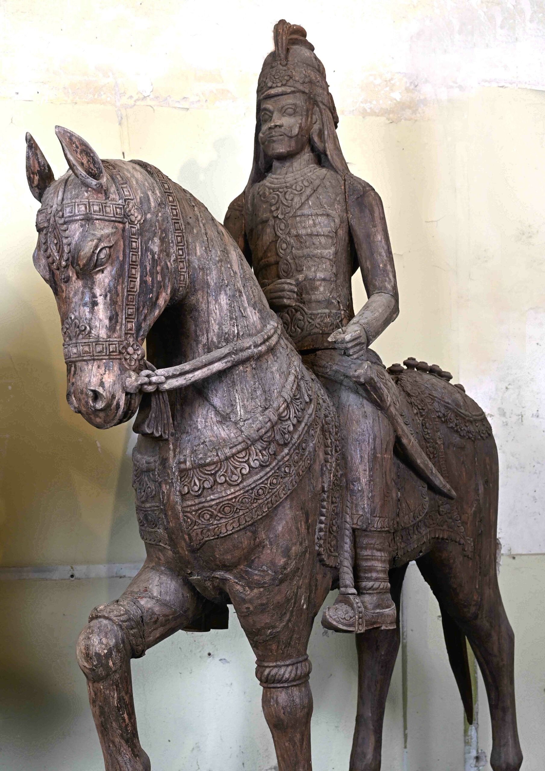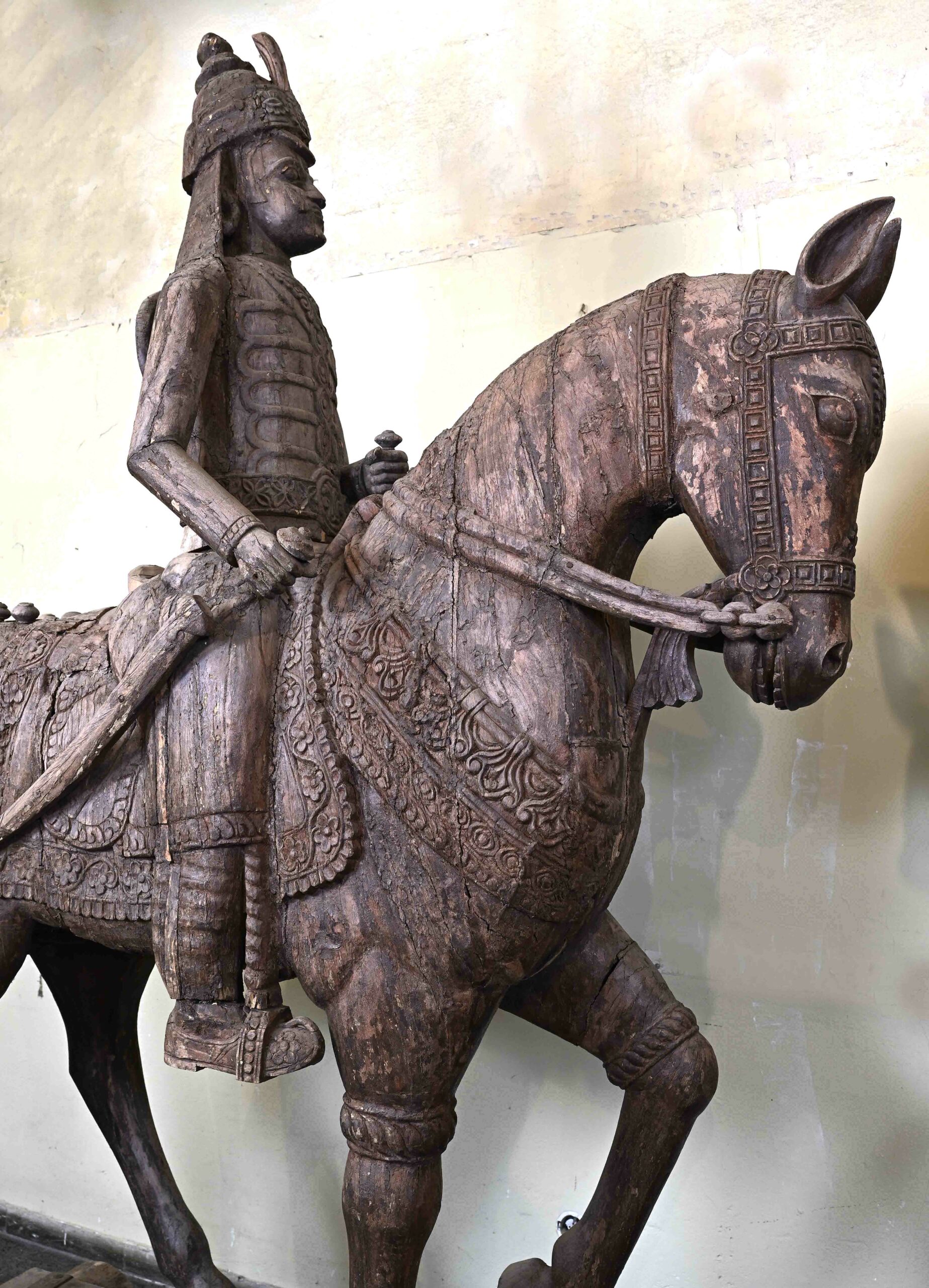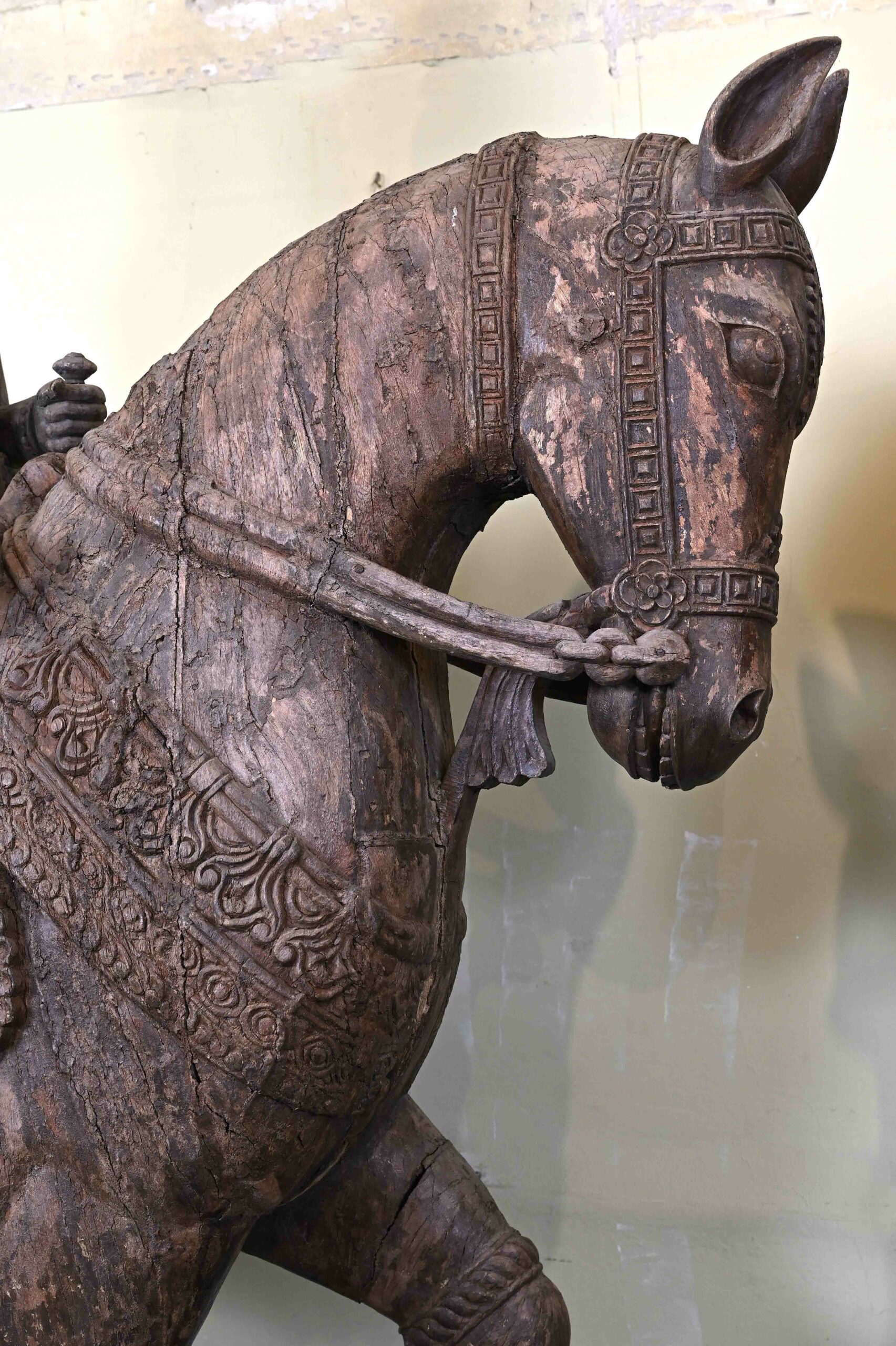 Die Pferde sind schön skulpturiert mit einem Bein angehoben, das Zaumzeug mit quadratischem Muster, doppelter Brustgurt mit floralen Motiven, ebenso die Satteldecke und die Decke über der Kruppe. Markant sind die Glockengurte, die unter dem Schweif durchführen. Man findet sie in zahllosen Pferdedarstellungen aus Madras. Gemäß dem Vorbesitzer waren diese Reiter am Innentor eines Fürstenpalastes in der Region Tritschinapalli stationiert.
