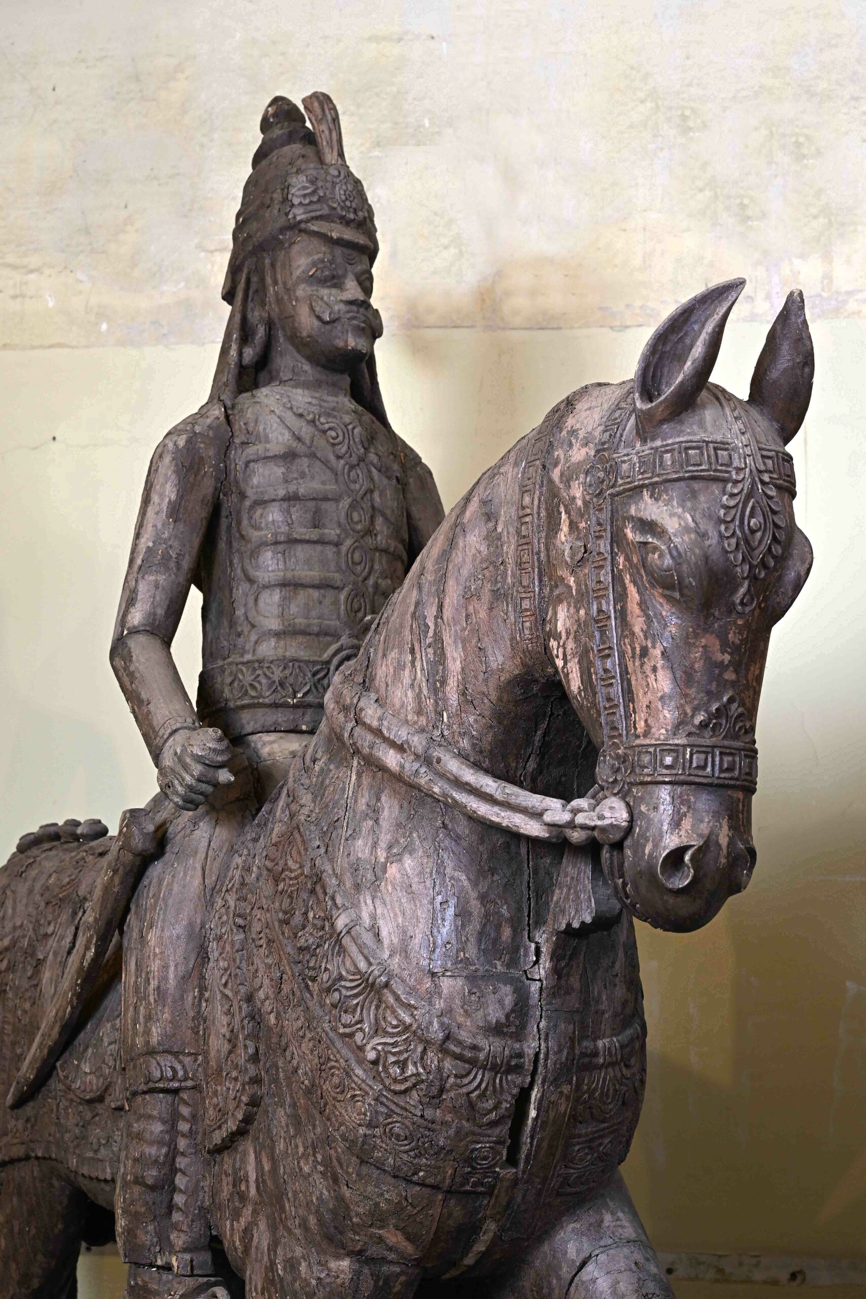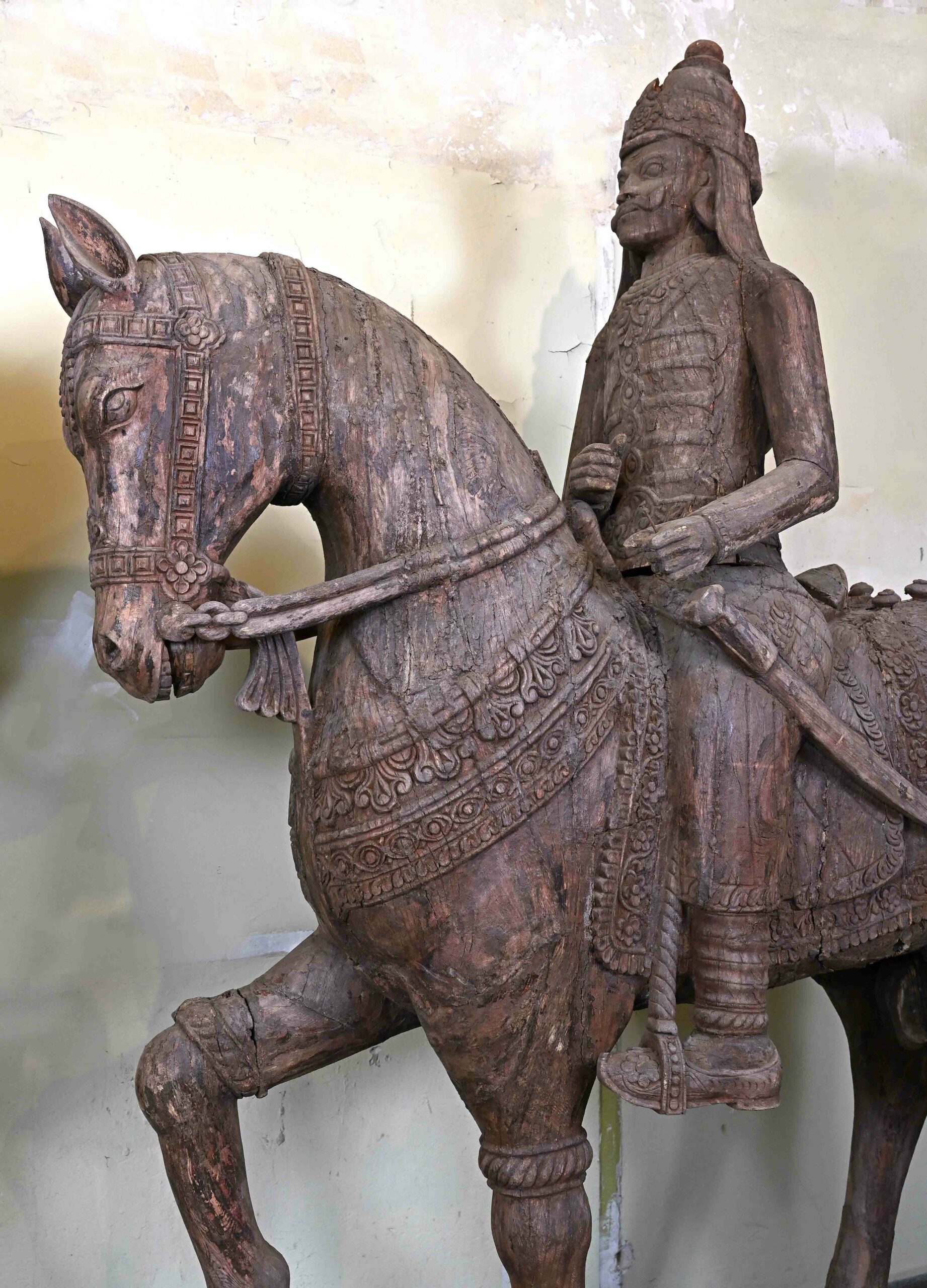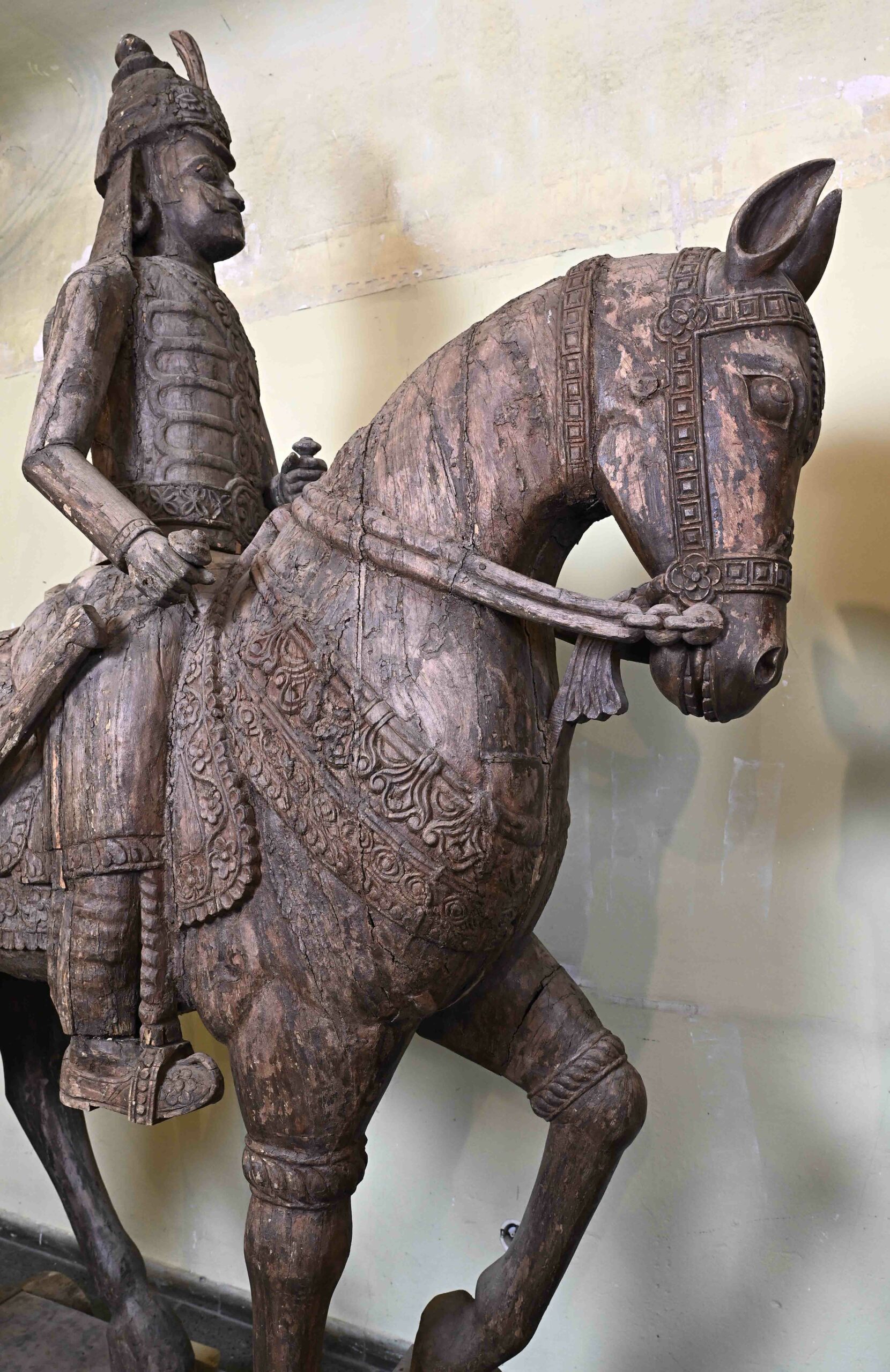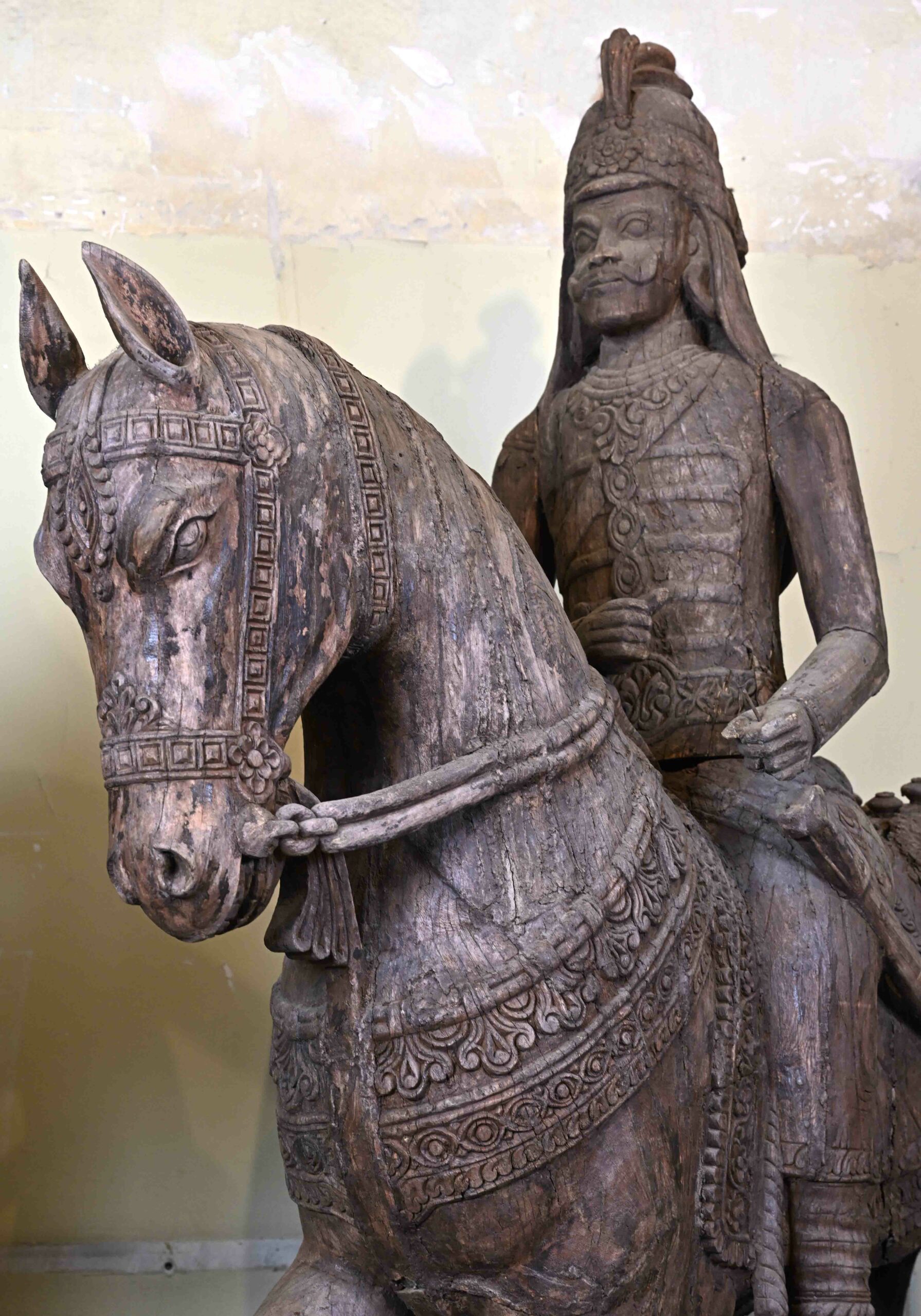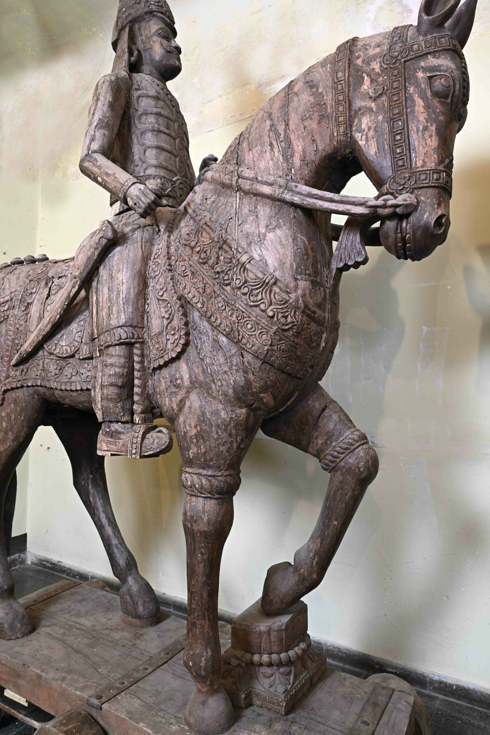 Die Pferde sind schön skulpturiert mit einem Bein angehoben, das Zaumzeug mit quadratischem Muster, doppelter Brustgurt mit floralen Motiven, ebenso die Satteldecke und die Decke über der Kruppe. Markant sind die Glockengurte, die unter dem Schweif durchführen. Man findet sie in zahllosen Pferdedarstellungen aus Madras. Gemäß dem Vorbesitzer waren diese Reiter am Innentor eines Fürstenpalastes in der Region Tritschinapalli stationiert.