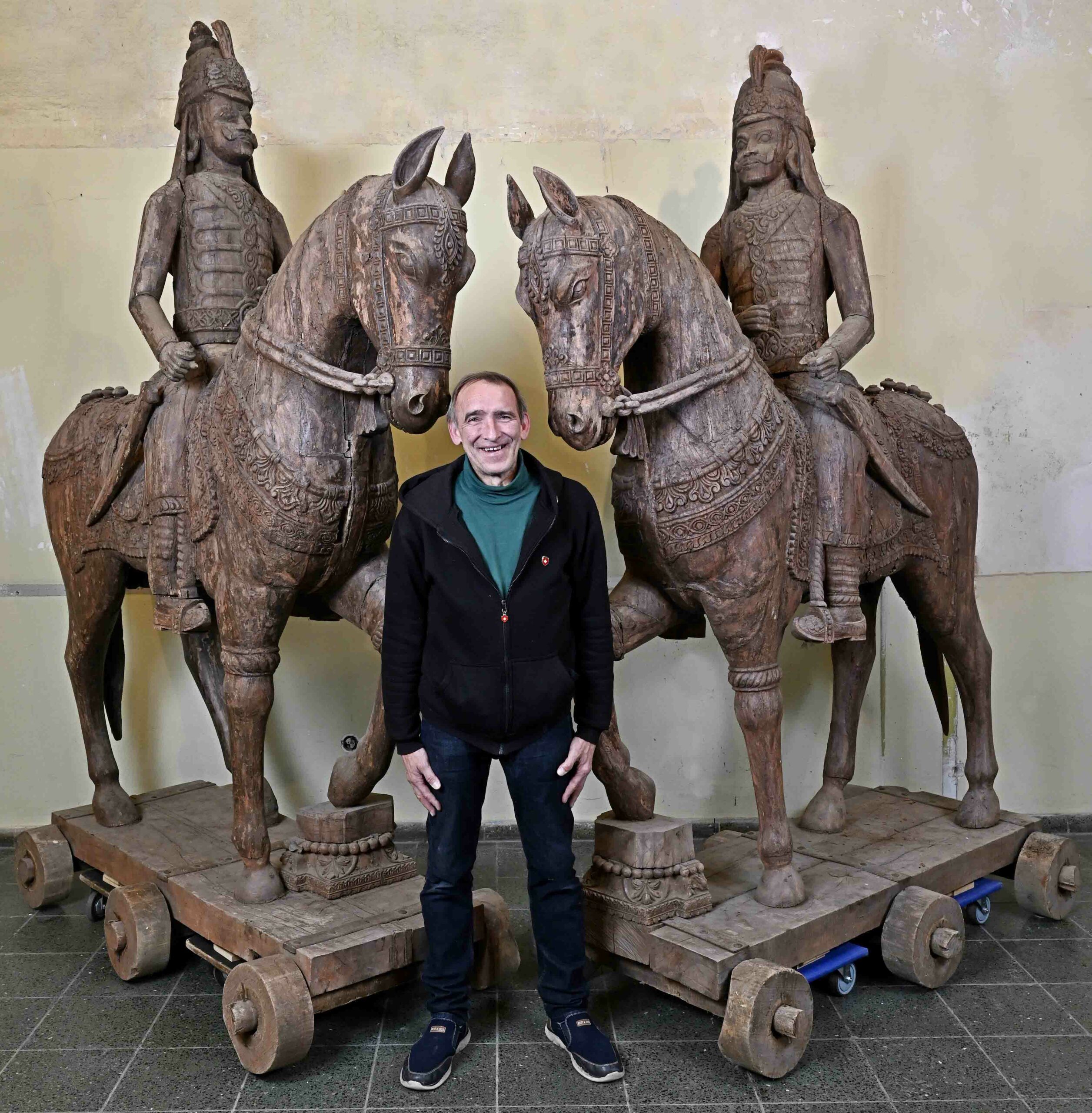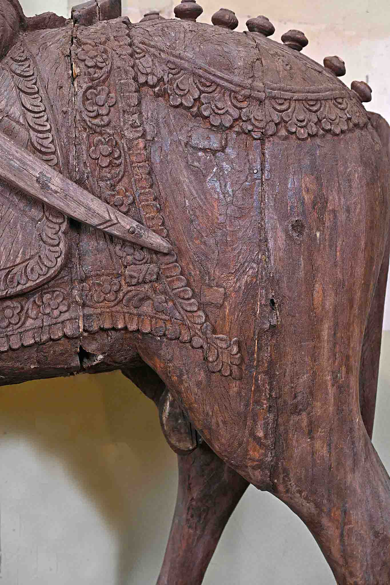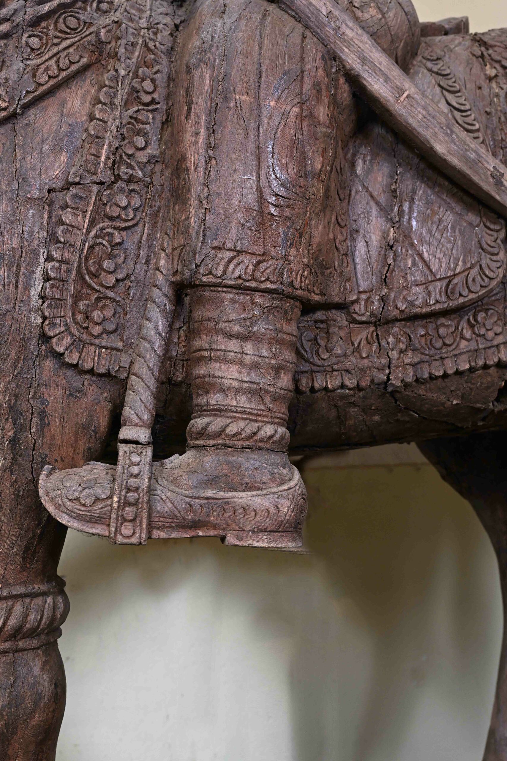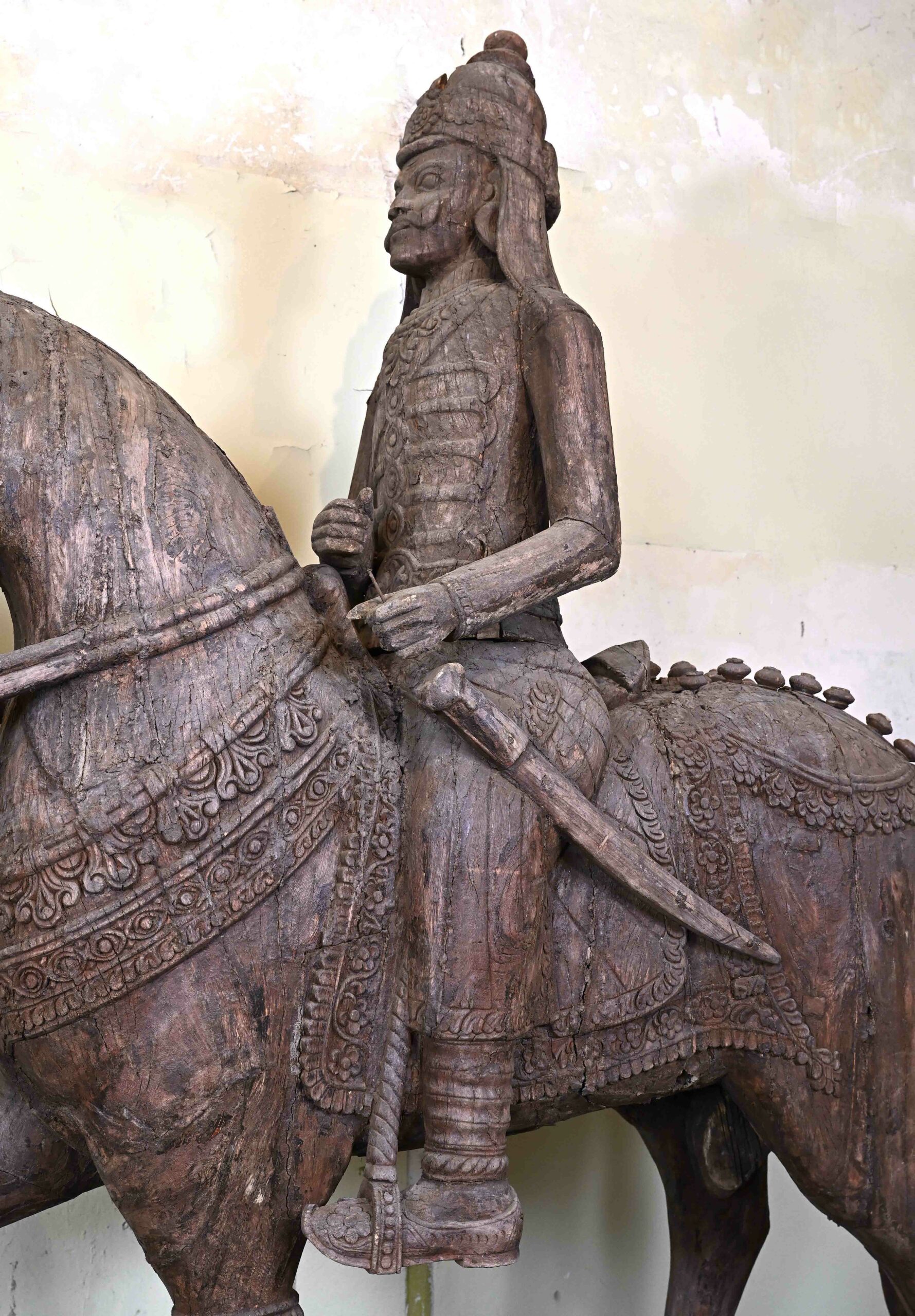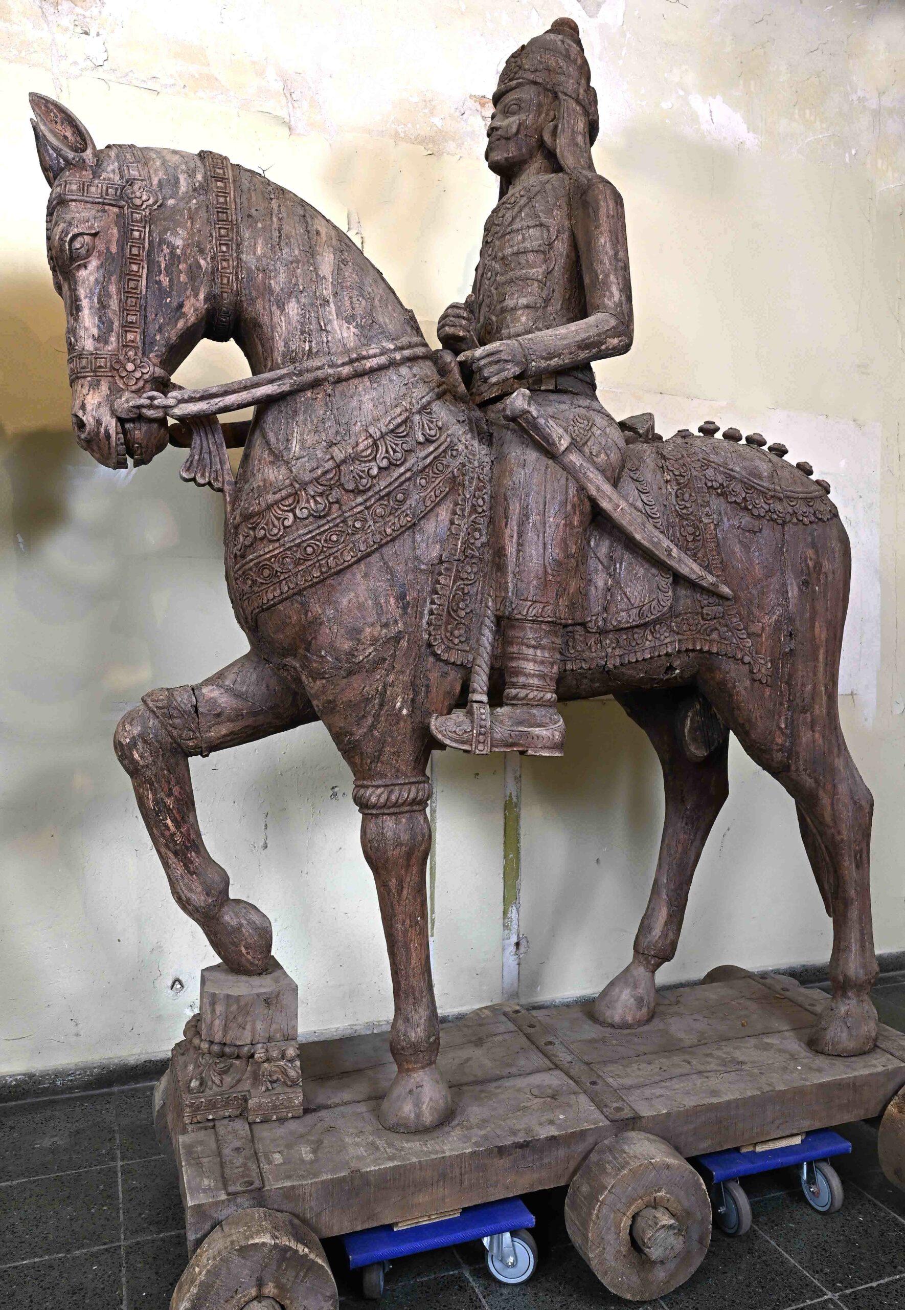 Die Pferde sind schön skulpturiert mit einem Bein angehoben, das Zaumzeug mit quadratischem Muster, doppelter Brustgurt mit floralen Motiven, ebenso die Satteldecke und die Decke über der Kruppe. Markant sind die Glockengurte, die unter dem Schweif durchführen. Man findet sie in zahllosen Pferdedarstellungen aus Madras. Gemäß dem Vorbesitzer waren diese Reiter am Innentor eines Fürstenpalastes in der Region Tritschinapalli stationiert.