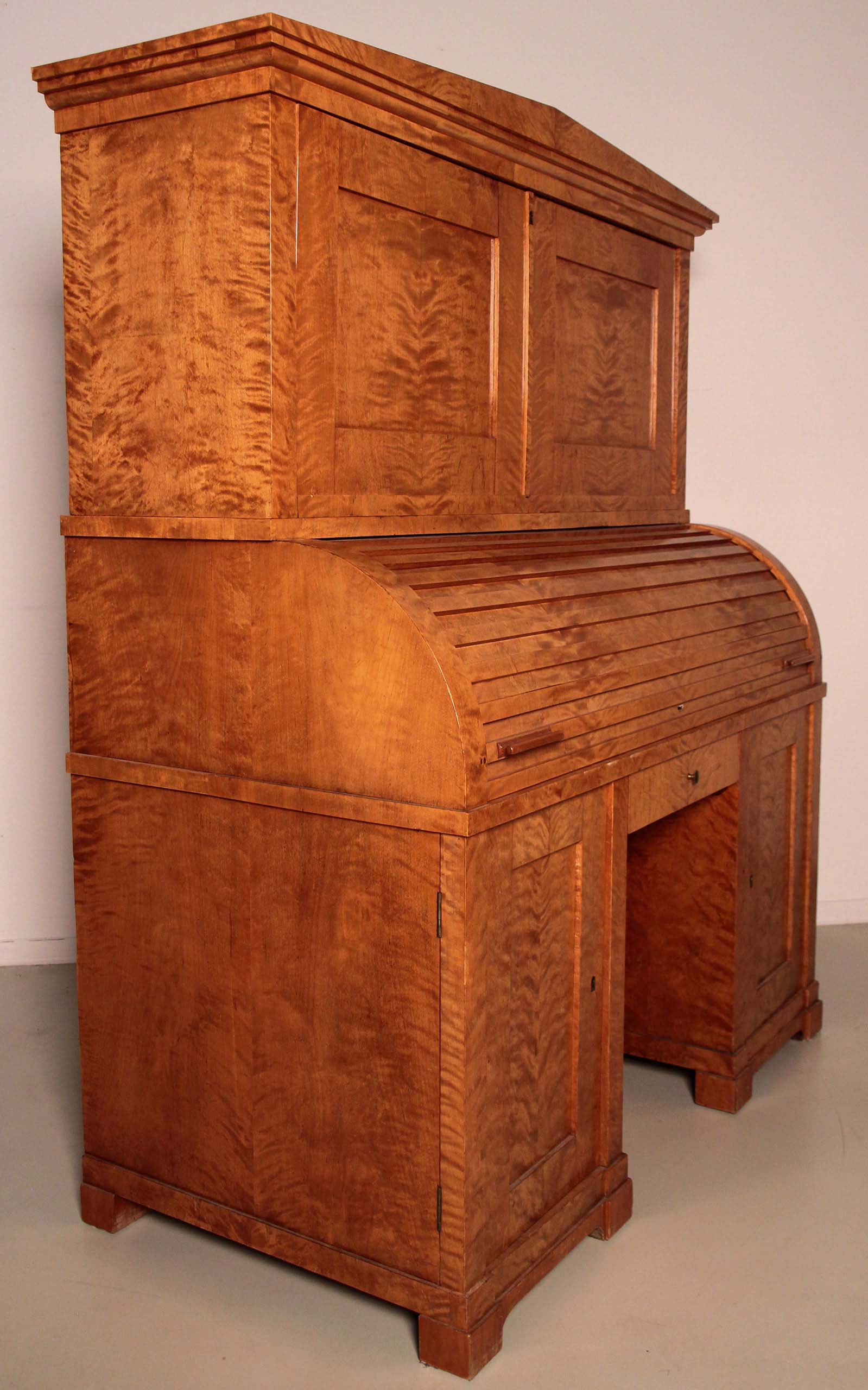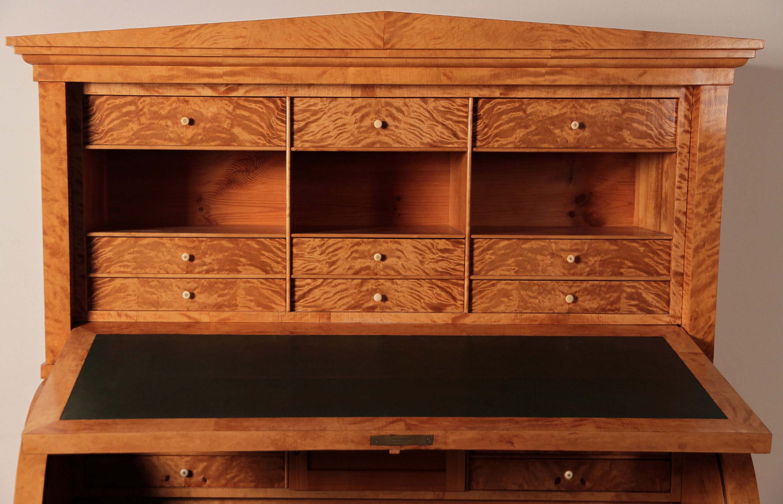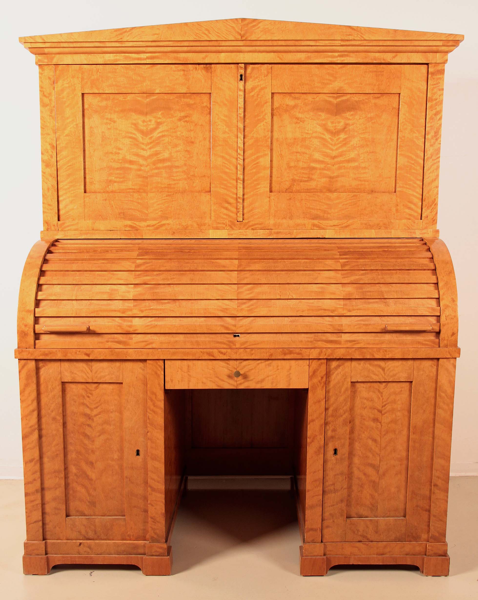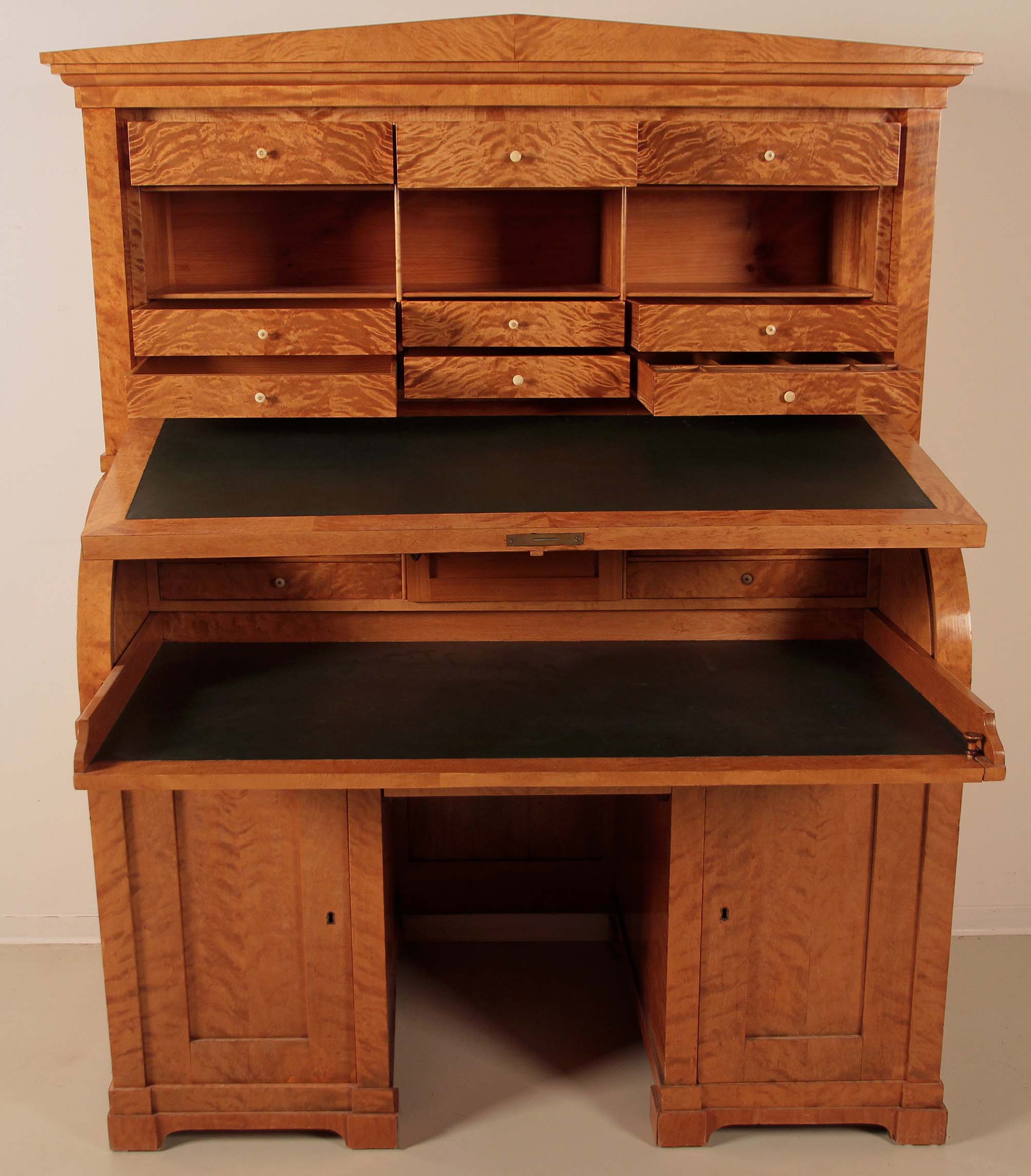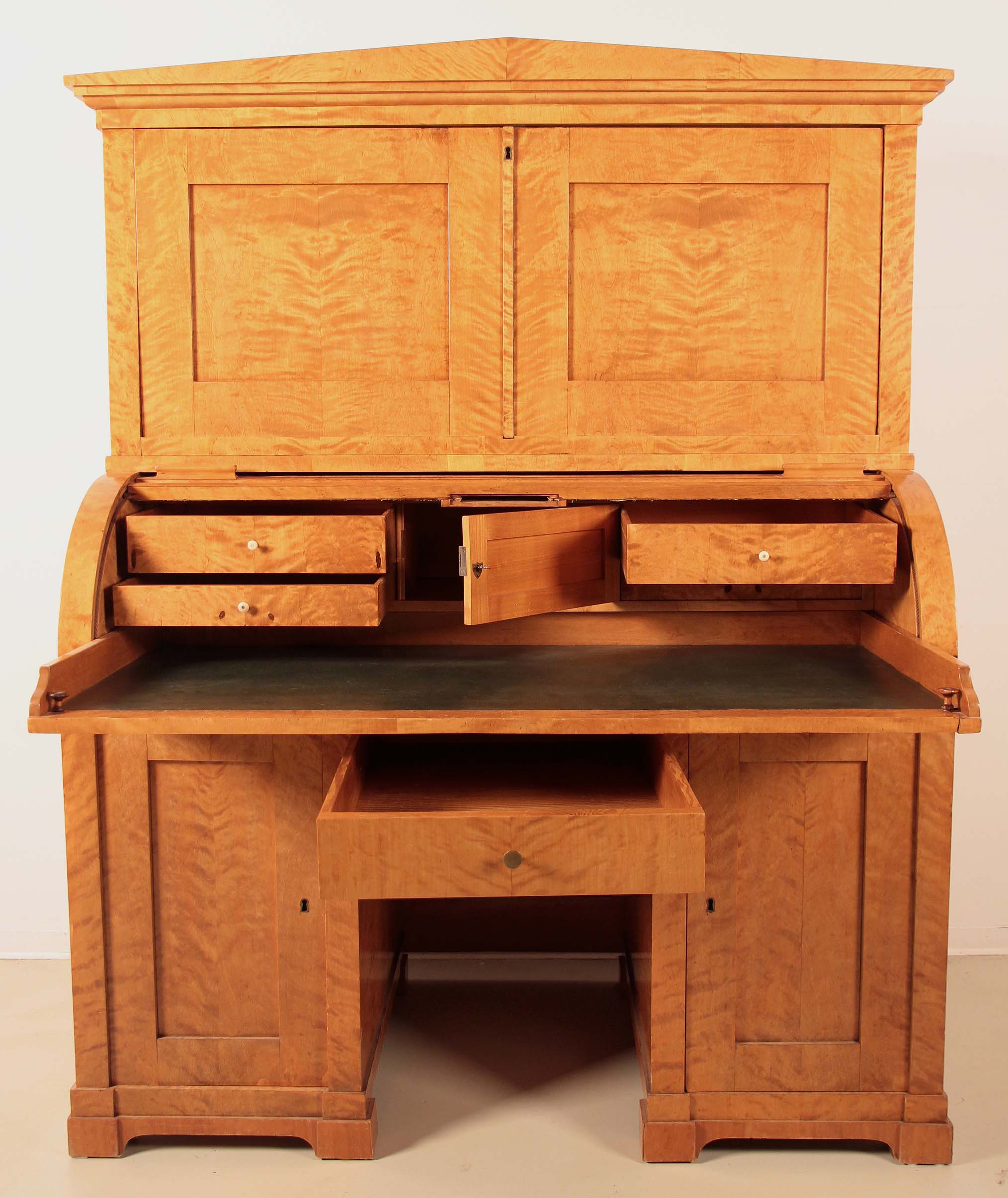 Hier bieten wir Ihnen ein unglaubliches Exponat des Zweiten Biedermeier. Dieser sensationelle Zylinder-Rollsekretär in monumentaler Ausführung wurde um die Jahrhundertwende 1900 aus geflammter Birke, massiv und furniert, gefertigt. Folgende Besonderheiten sind die hervorstechendsten Merkmale dieses meisterlichen Möbels: